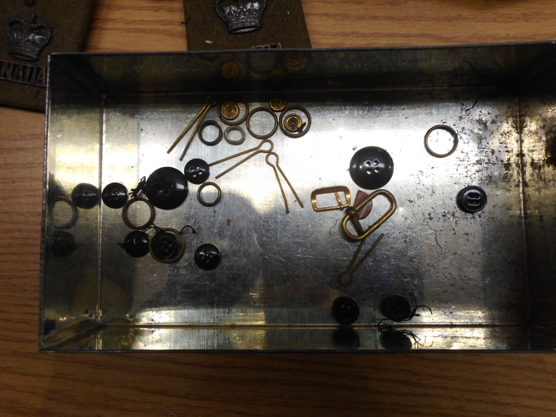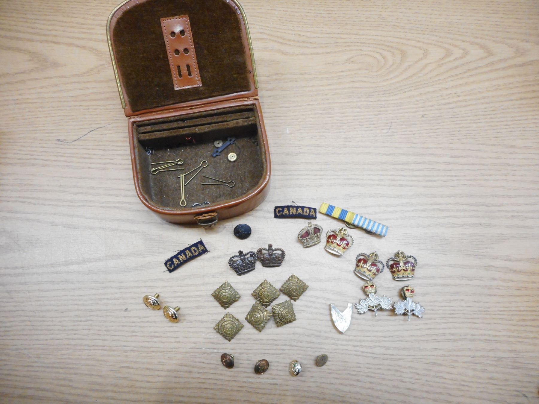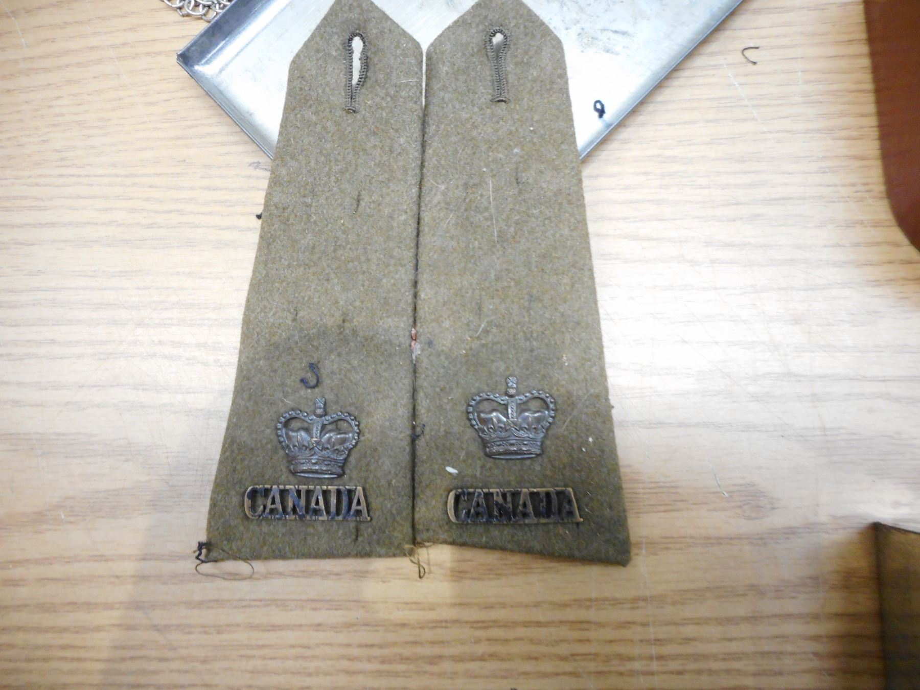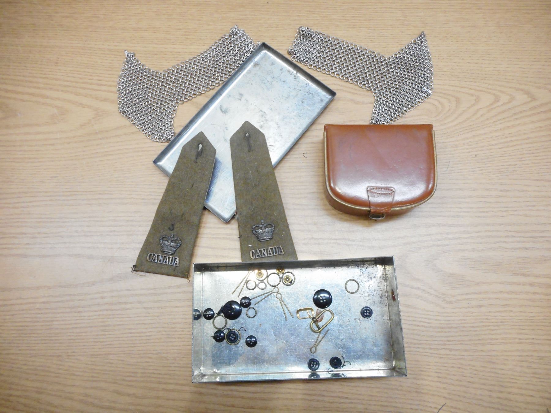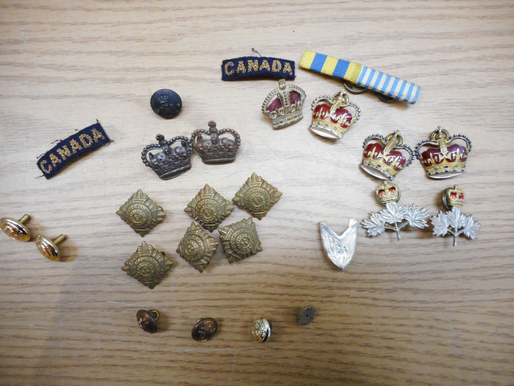 ASSORTED WWI/WWII BUTTONS, PIPS, EPAULETTES, & PINS , CROWN PINS, ASSORTED PIPS & BUTTONS, EPUALETTES WITH CANADA TITLES & CROWN PIN & CHAIN MAIL EPAULETTES