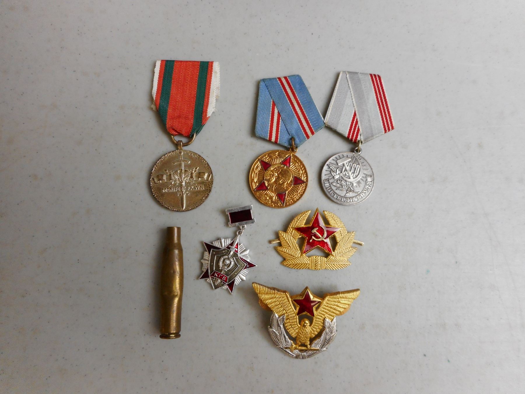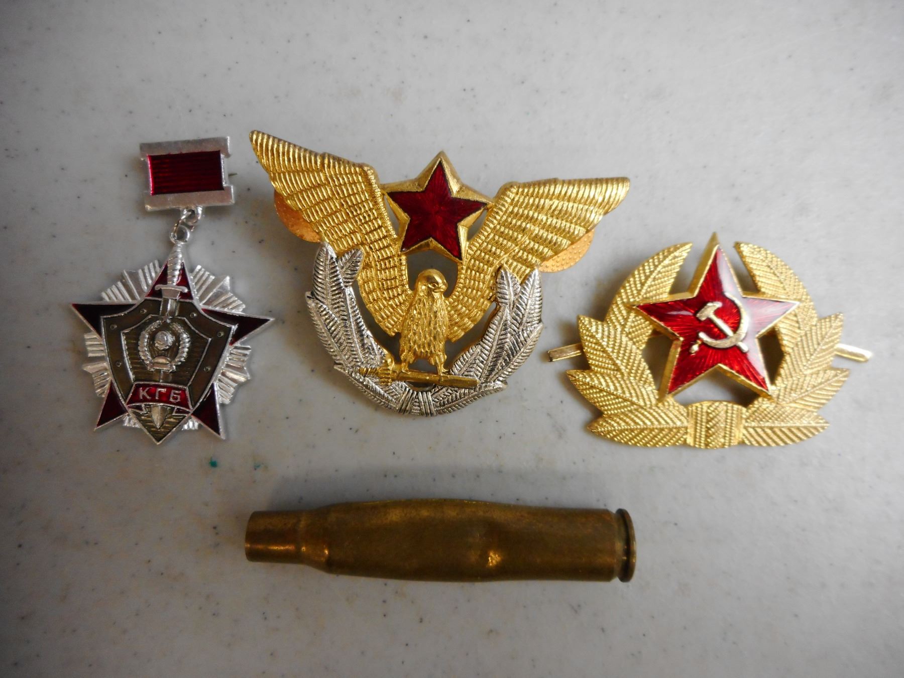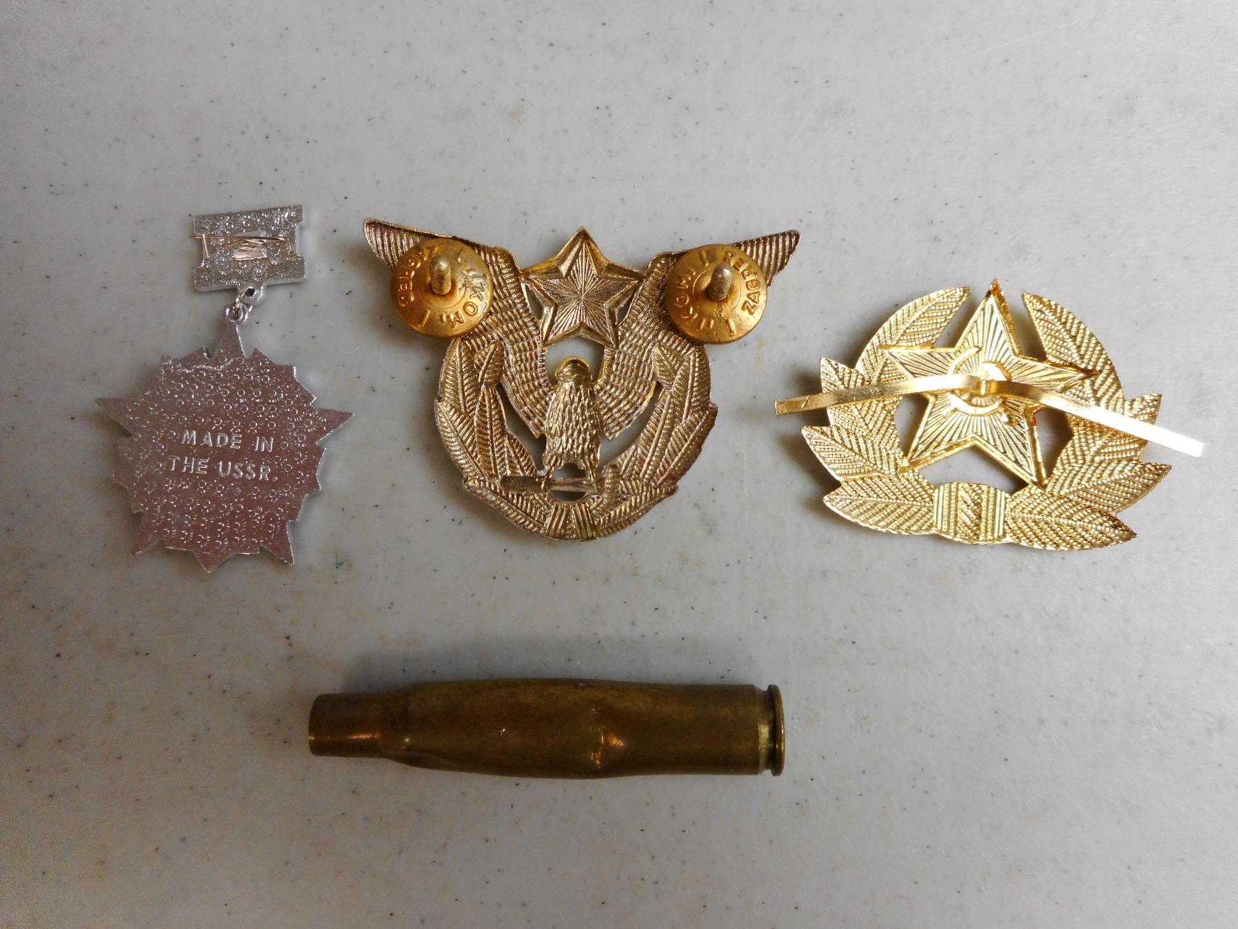 ASSORTED WWII U.S.S.R./RUSSIAN MEDALS & PINS , INCLUDES MEDALS WITH RIBBONS, & HAT BADGES (1) 30-06 BRASS
