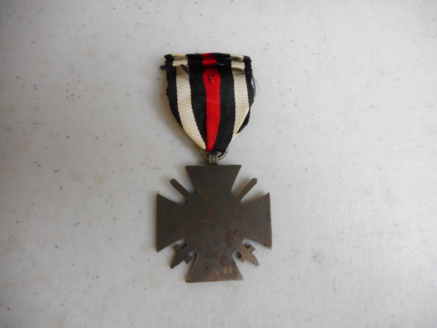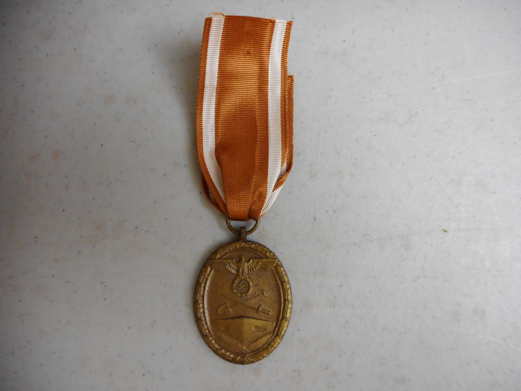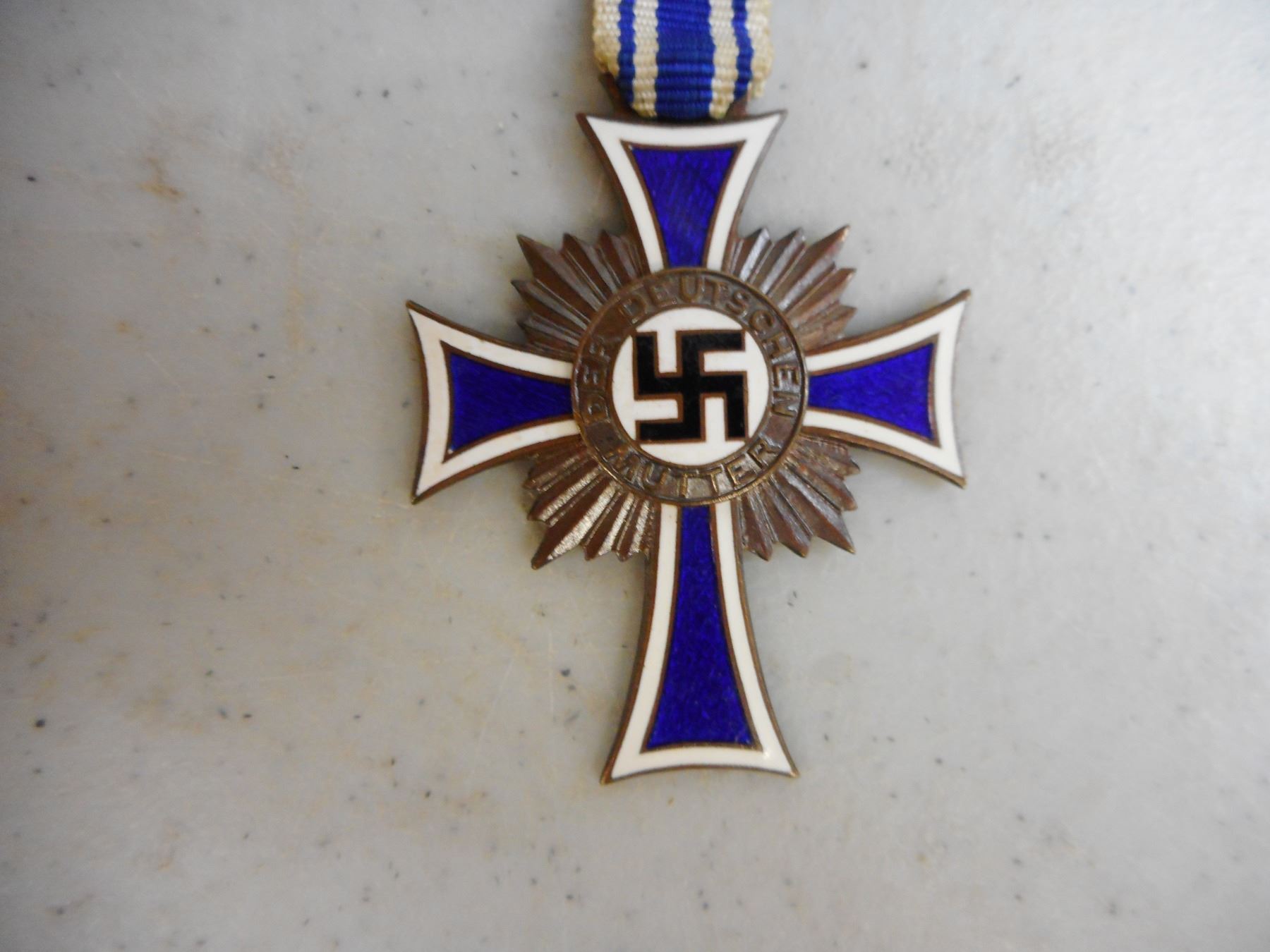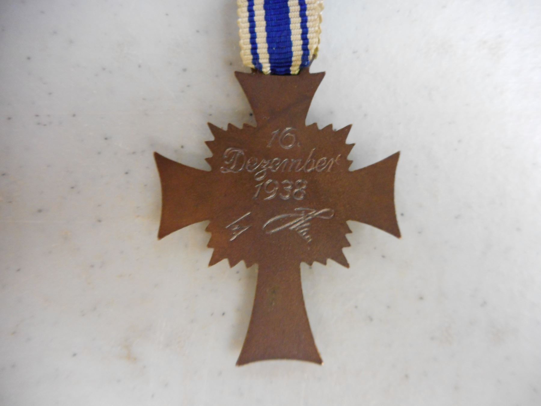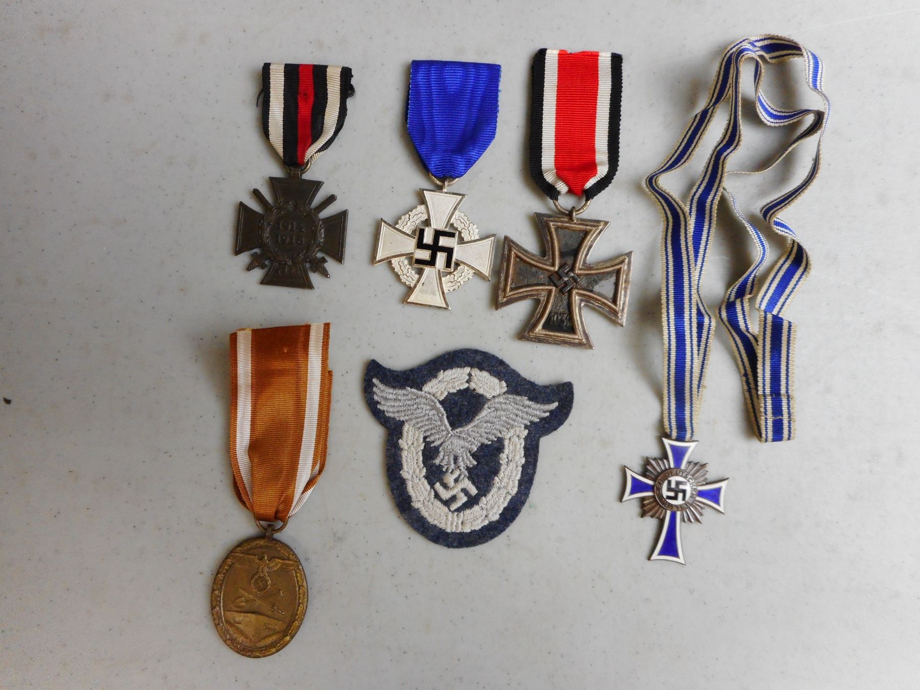 GERMAN WWI/WWII MEDALS & BADGE , INCLUDES 1939 IRON CROSS WITH RIBBON, 1914-1918 HINDENBURG CROSS COMBATENT WITH RIBBON, HONOUR OF THE GERMAN MOTHER CROSS WITH RIBBON, SERVICE MEDAL WITH RIBBON & GERMAN WEST WALL DEFENCE MEDAL, LUFTWAFFE PILOT FABRIC BADGE