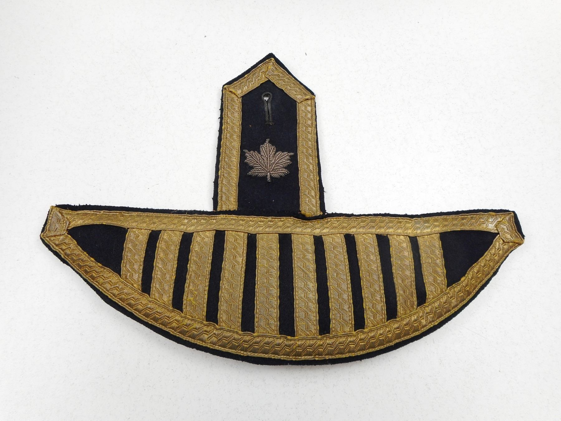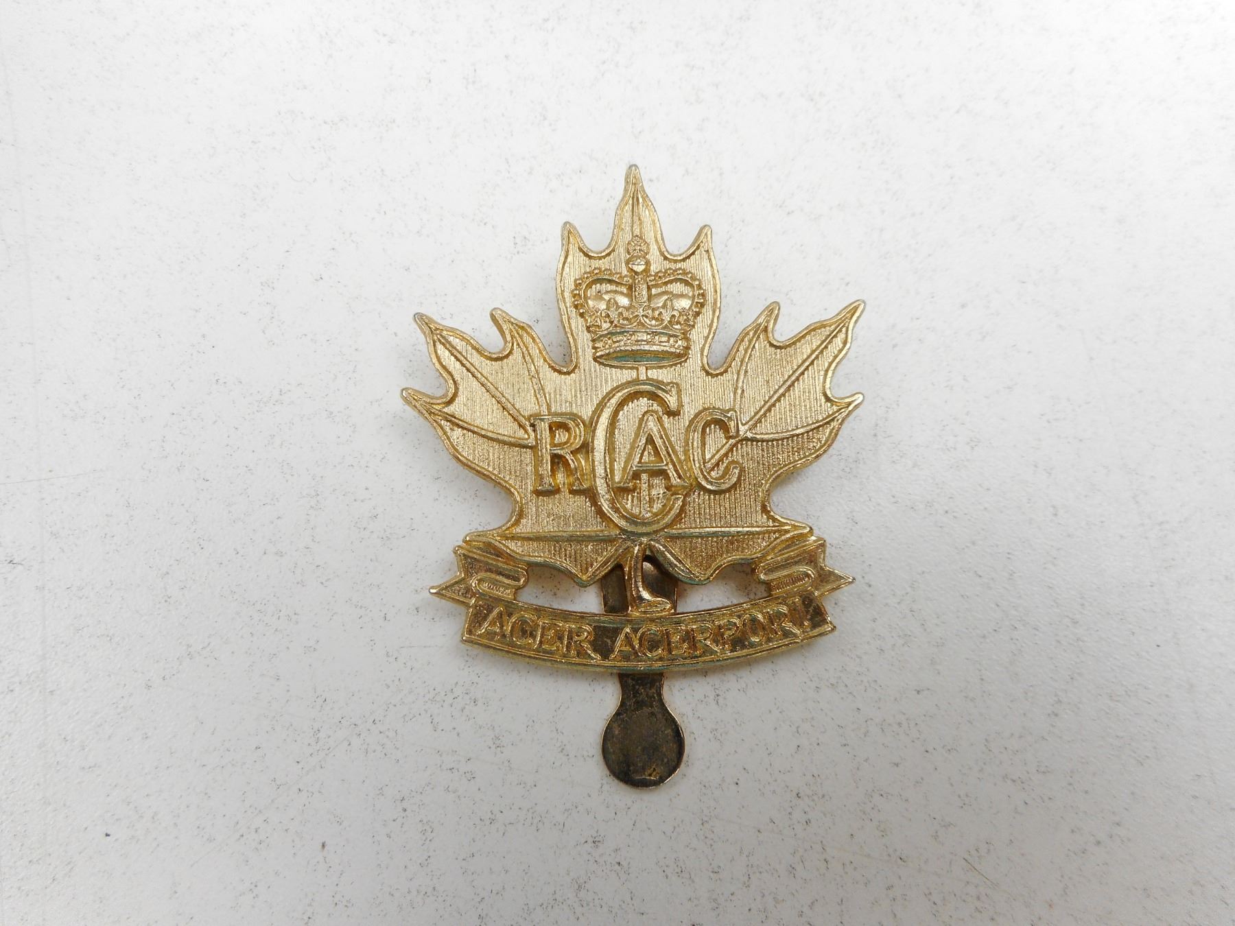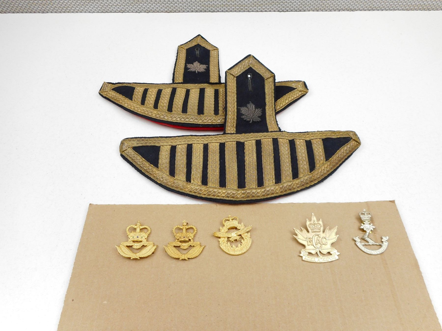 R.C.A.C. & R.C.M.C. CAP/COLLAR BADGES & BAND EPAULETTES , (3) SLIDE FASTNERS, (2) PRONG FASTENERS, (1) PAIR OF BAND EPAULETTES WITH PADDED HEAVY THREADED LEAF, GOLD & BLUE