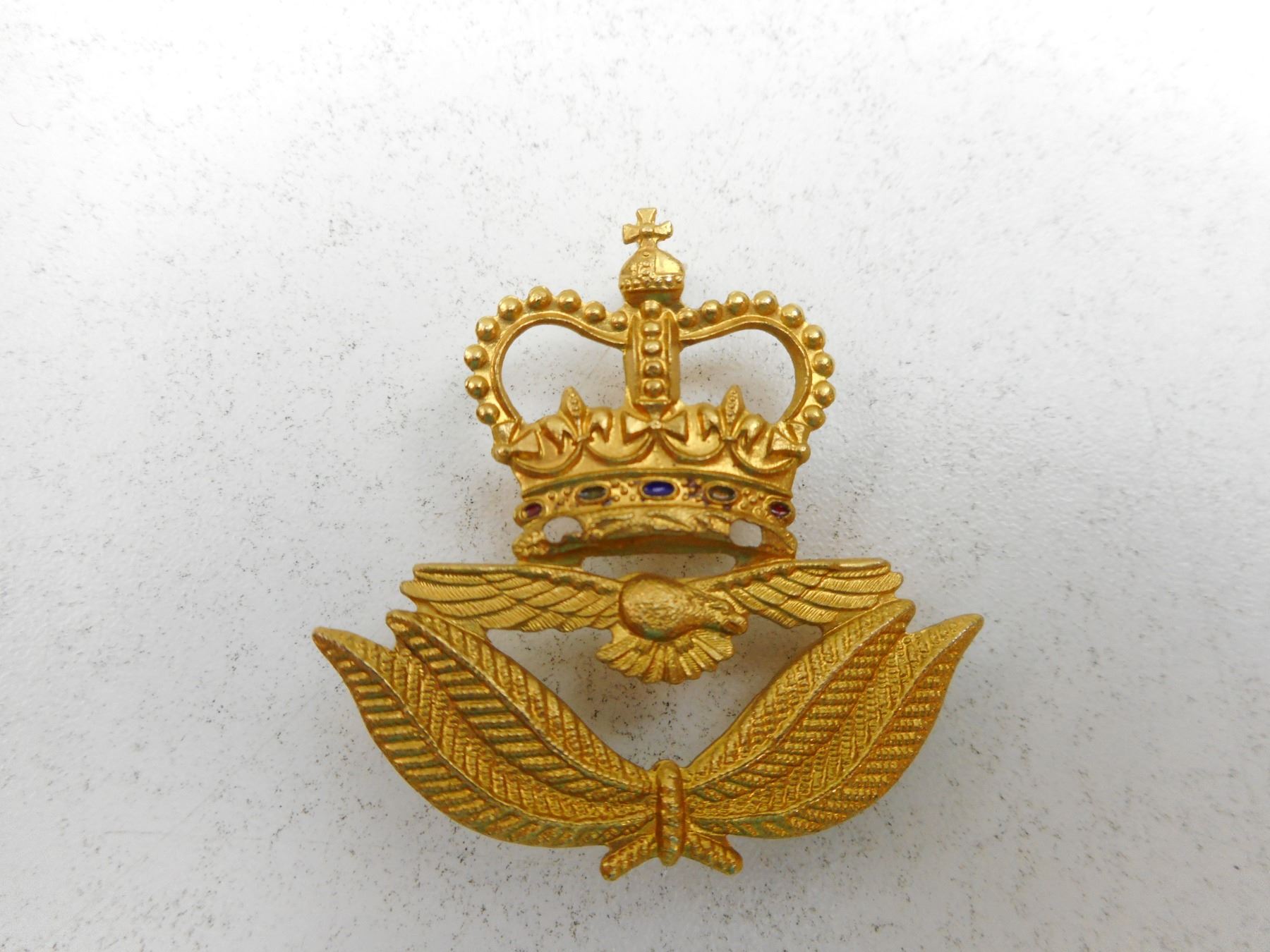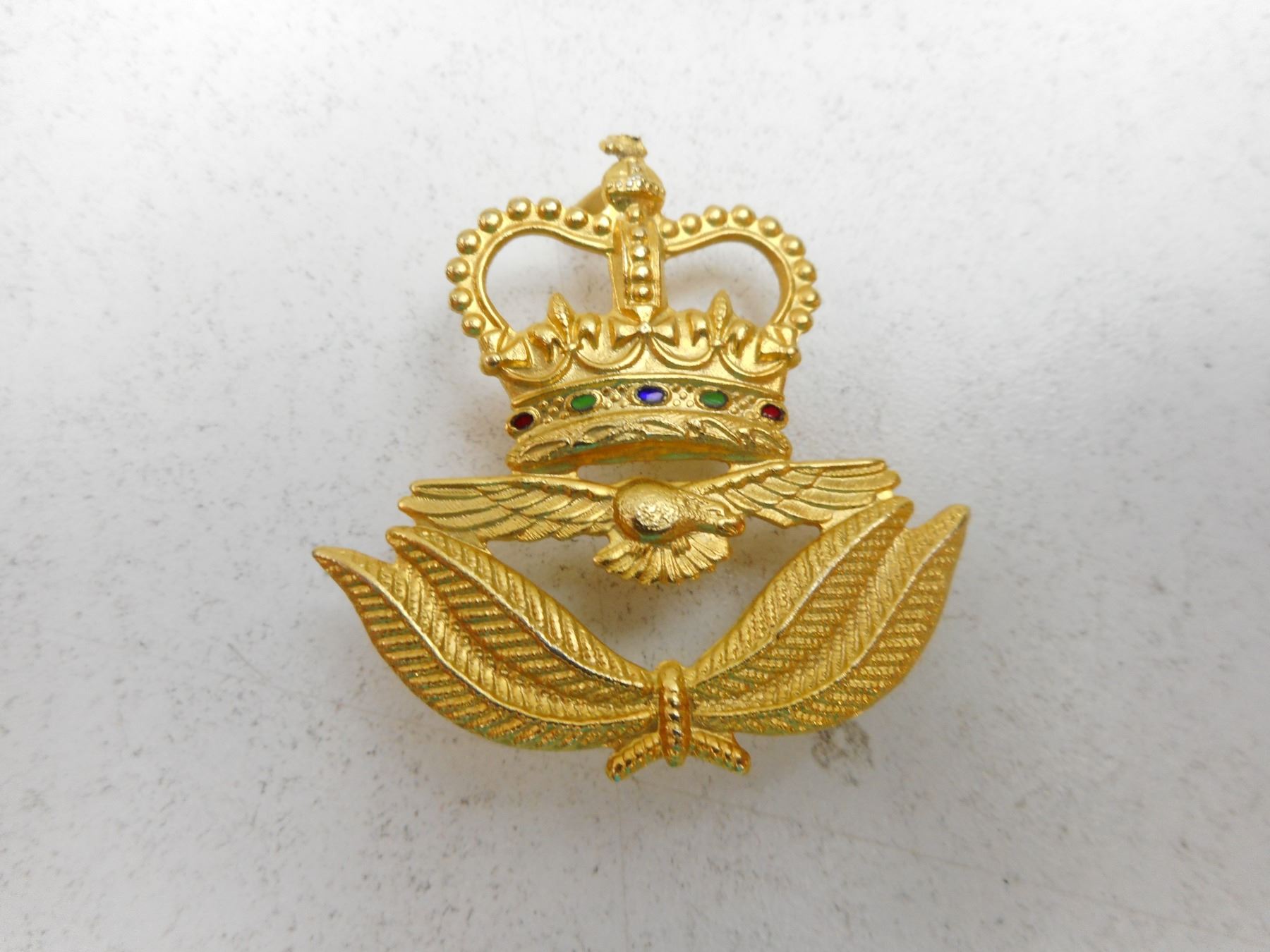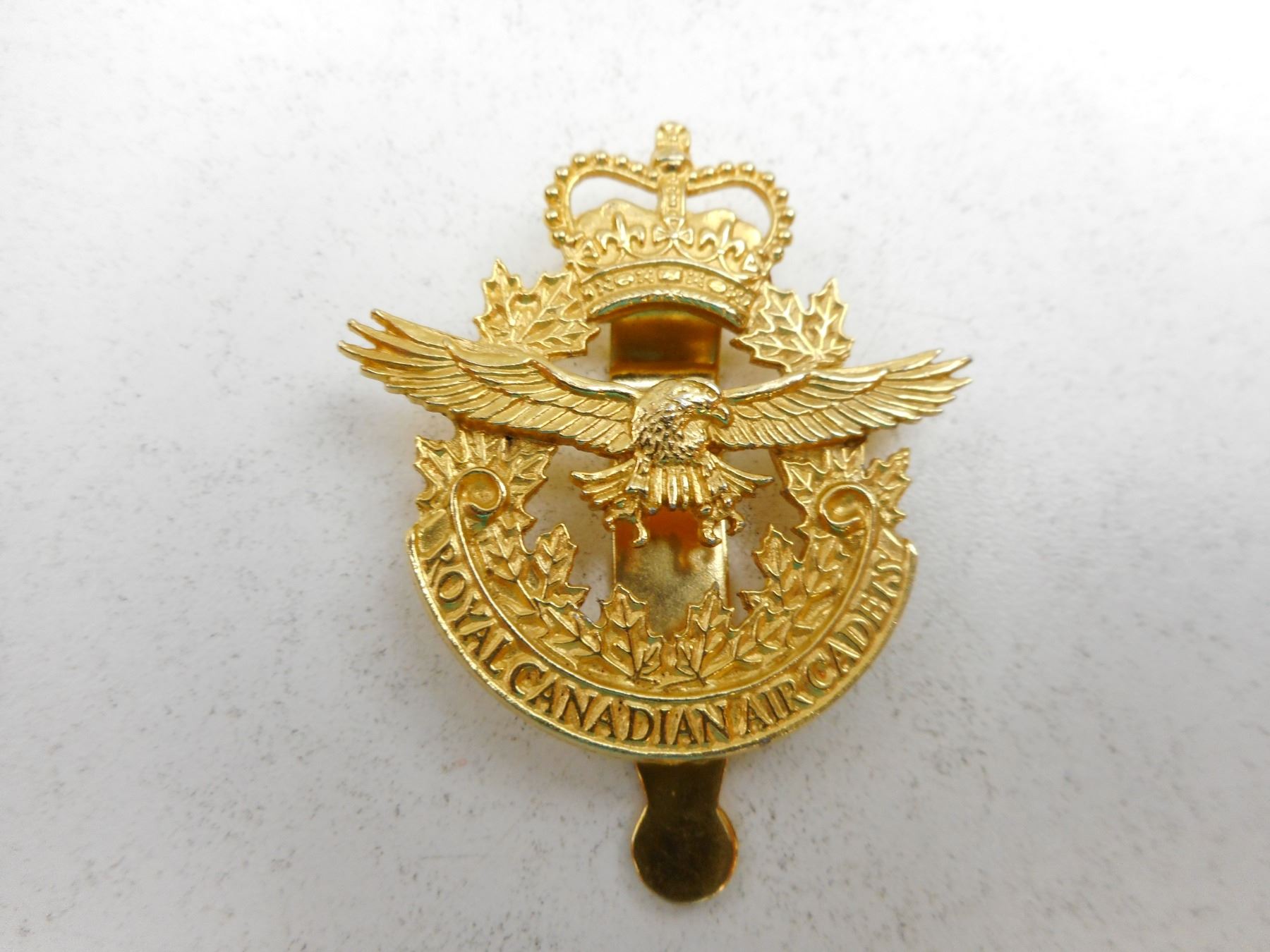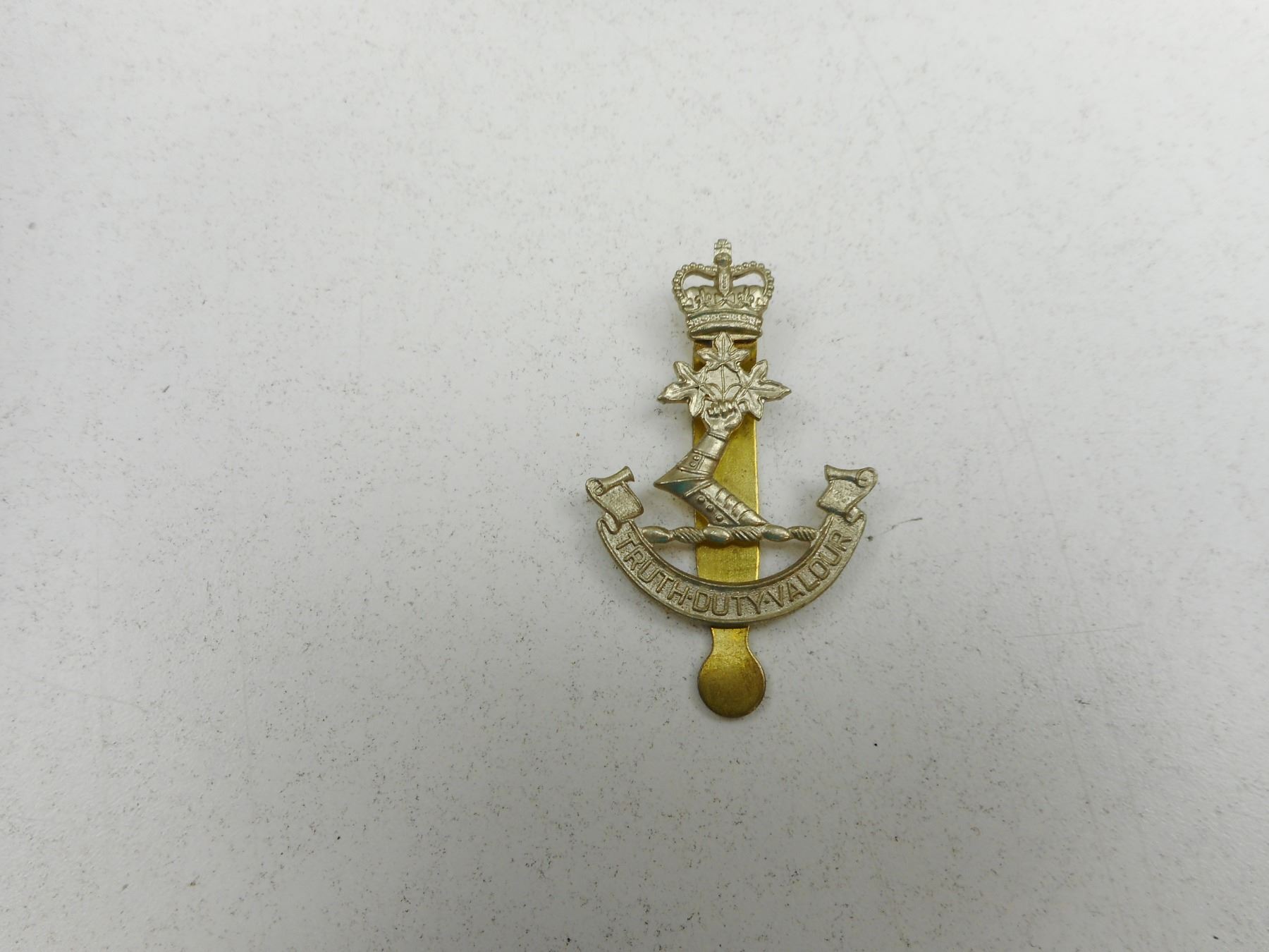 R.C.A.C. & R.C.M.C. CAP/COLLAR BADGES & BAND EPAULETTES , (3) SLIDE FASTNERS, (2) PRONG FASTENERS, (1) PAIR OF BAND EPAULETTES WITH PADDED HEAVY THREADED LEAF, GOLD & BLUE