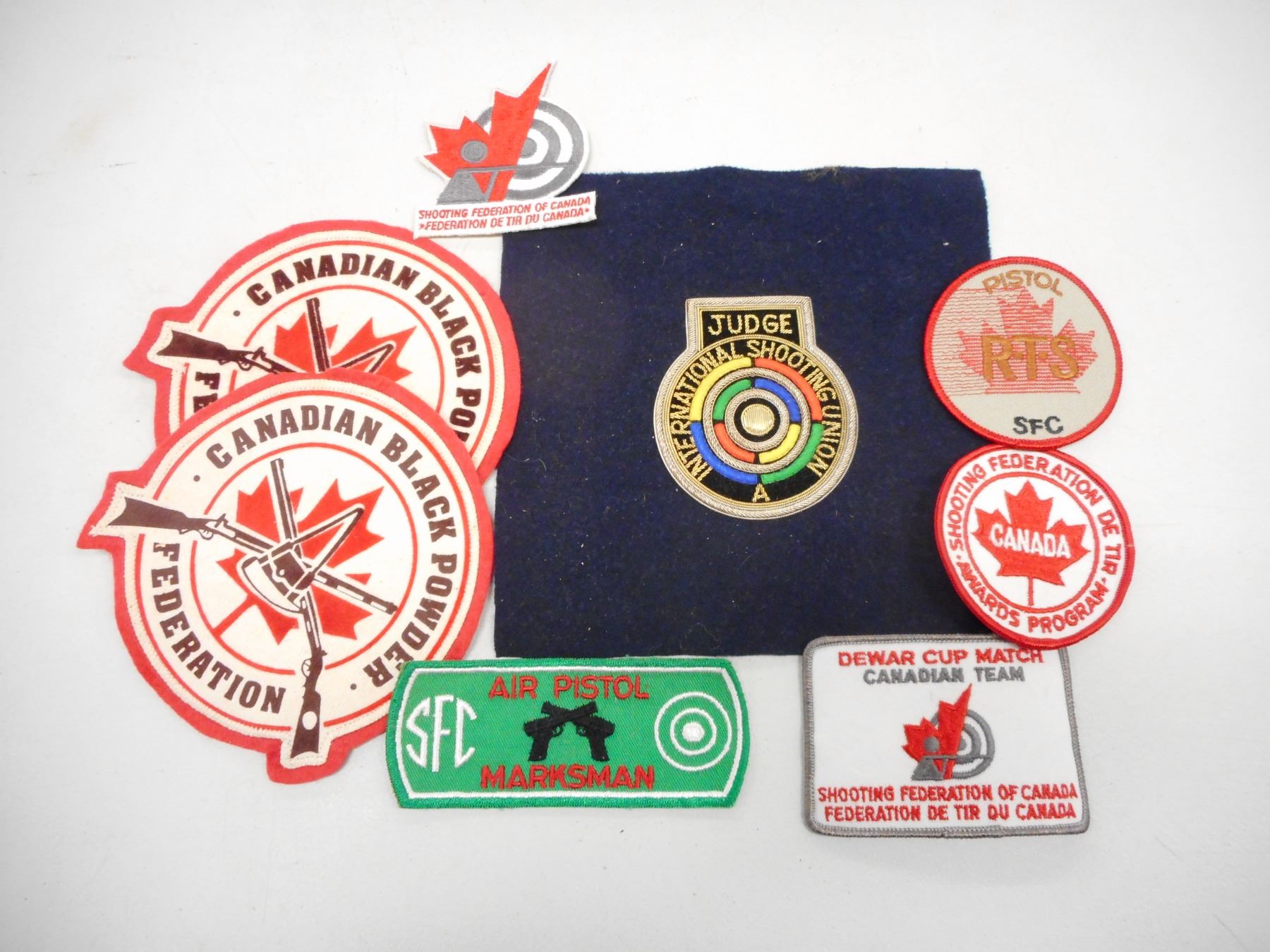 ASSORTED SPORT PATCHES & BADGES , INCLUDES CANADIAN BLACK POWDER FEDERATION, & SHOOTING FEDERATIONS JUDGES INTERNATIONAL SHOTTING UNION WITH GOLD THREAD, LOT OF 8