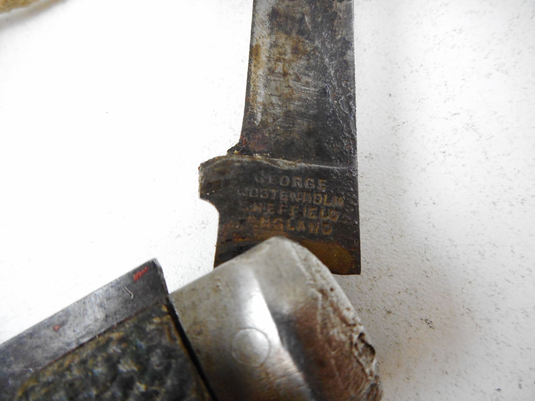 WWI CANADIAN CLASP KNIFE , KNIFE MARKED GEORGE WOSTENHOLM SHEFFIELD ENGLAND BLADE STAMPED I * XL, CANADIAN BROAD ARROW MARK ON SPIKE, WITH LANYARD