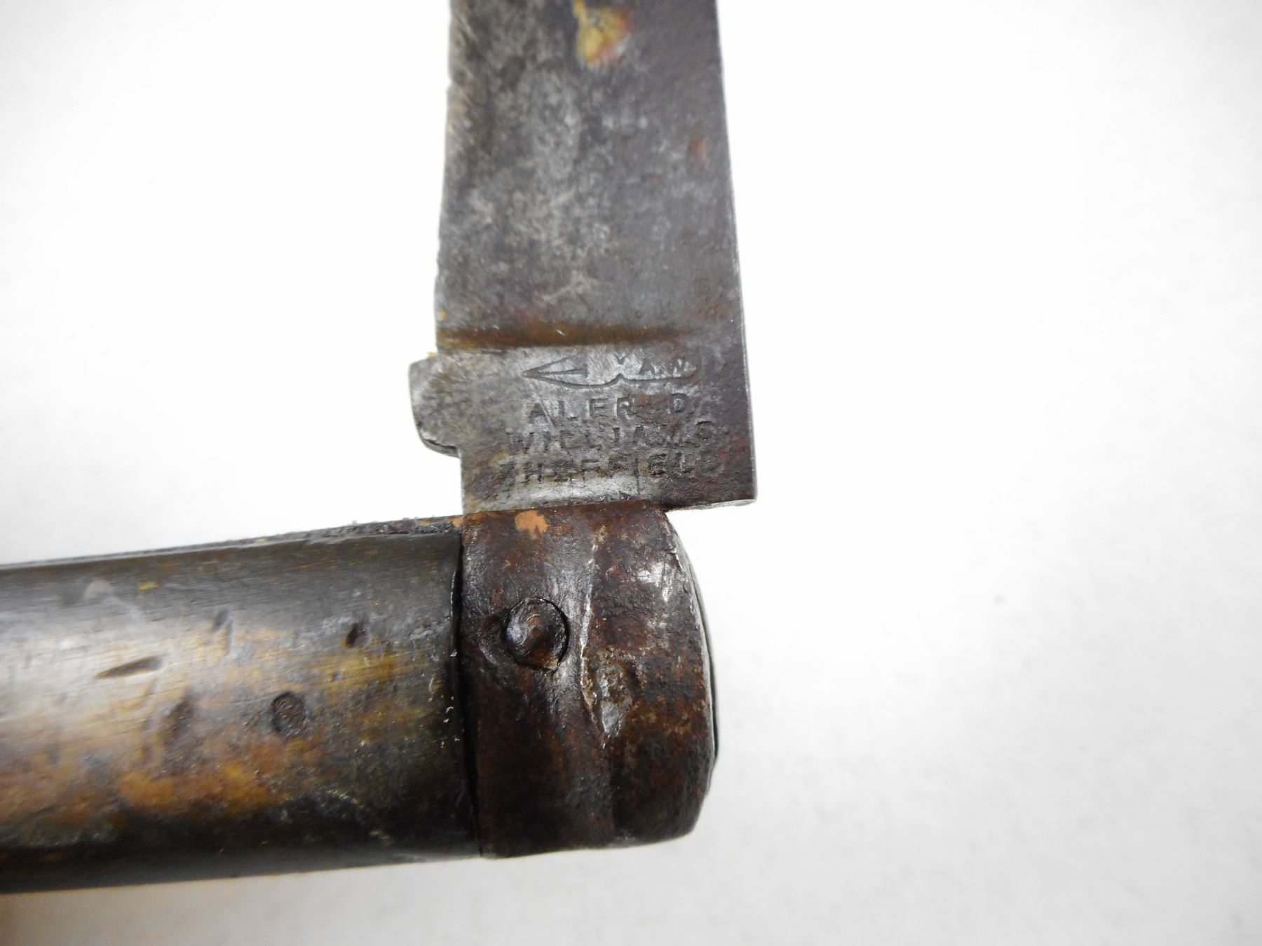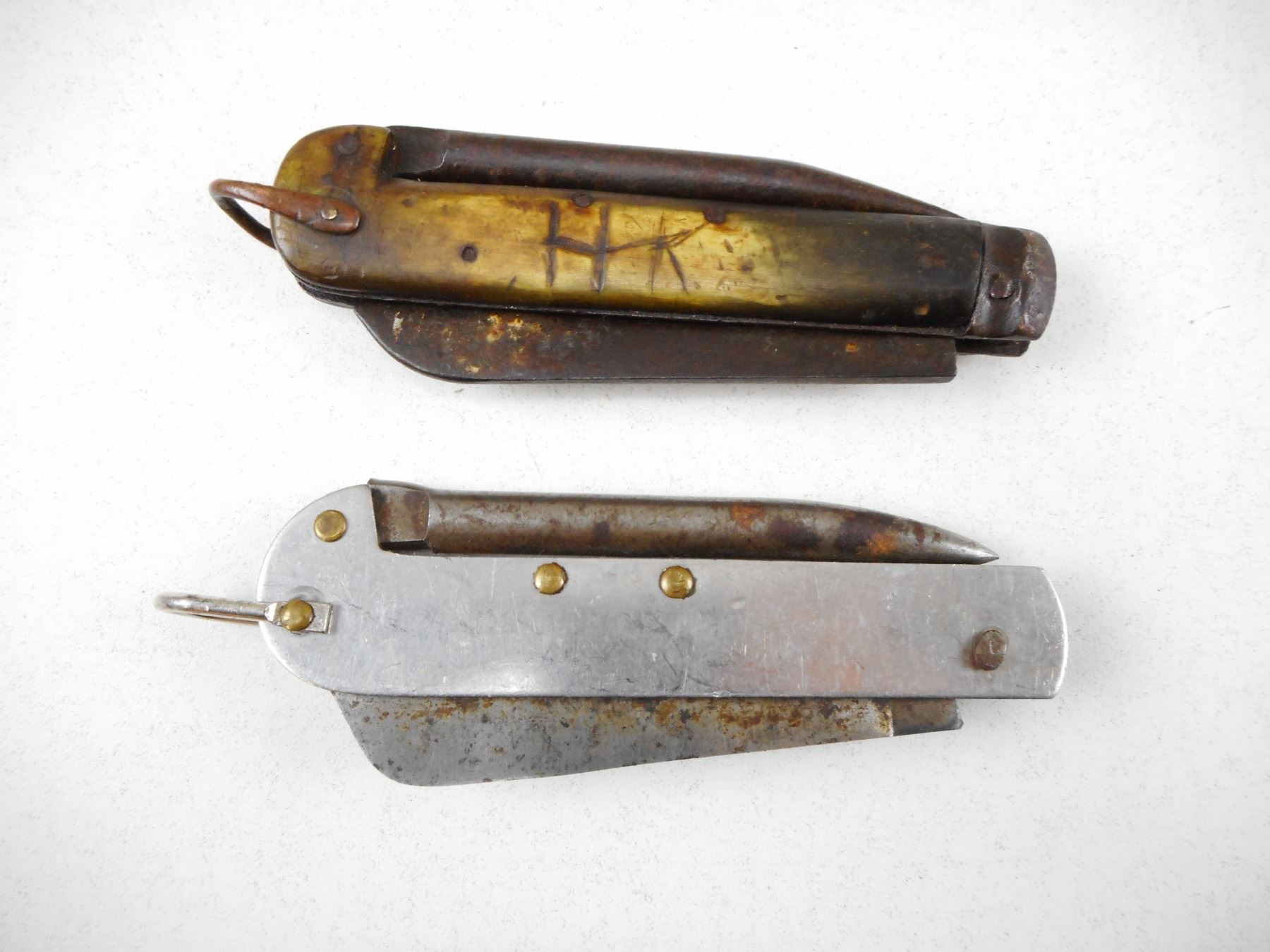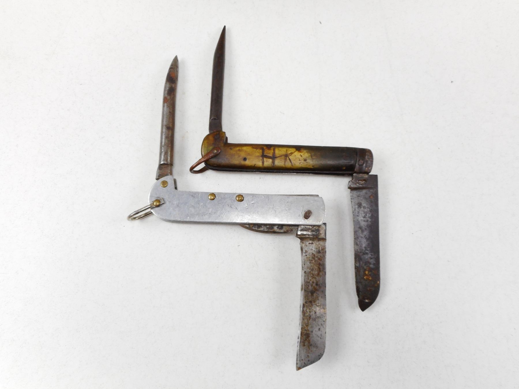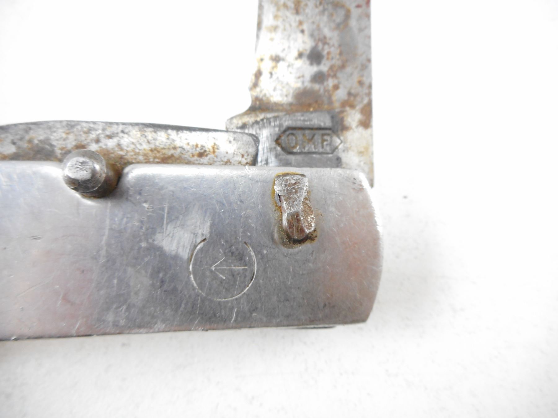 WWI/WWII CLASP KNIVES , (1) MARKED ALFRED WILLIAMS SHEFFIELD ON KNIFE, WOODEN HANDLE ENGRAVED HK, (1) MARKED OMF ON KNIFE WITH CANADIAN BROAD ARROW MARK ON METAL HANDLE, LOT OF 2