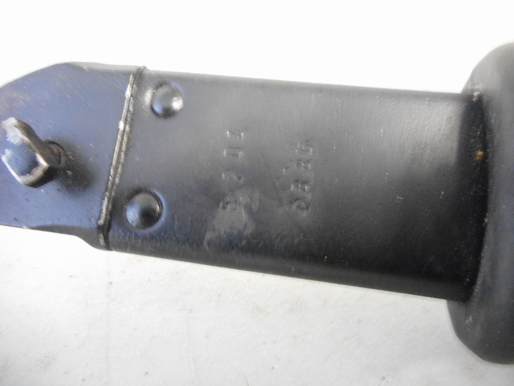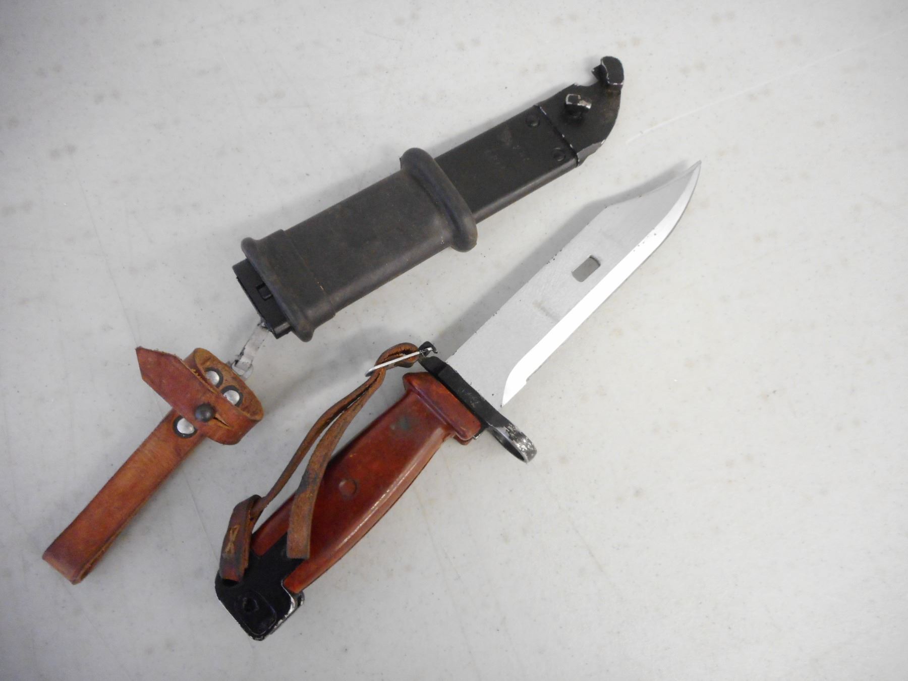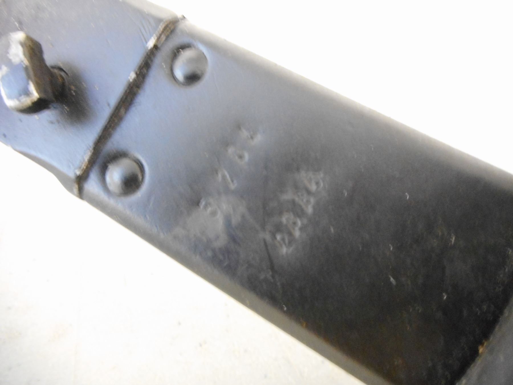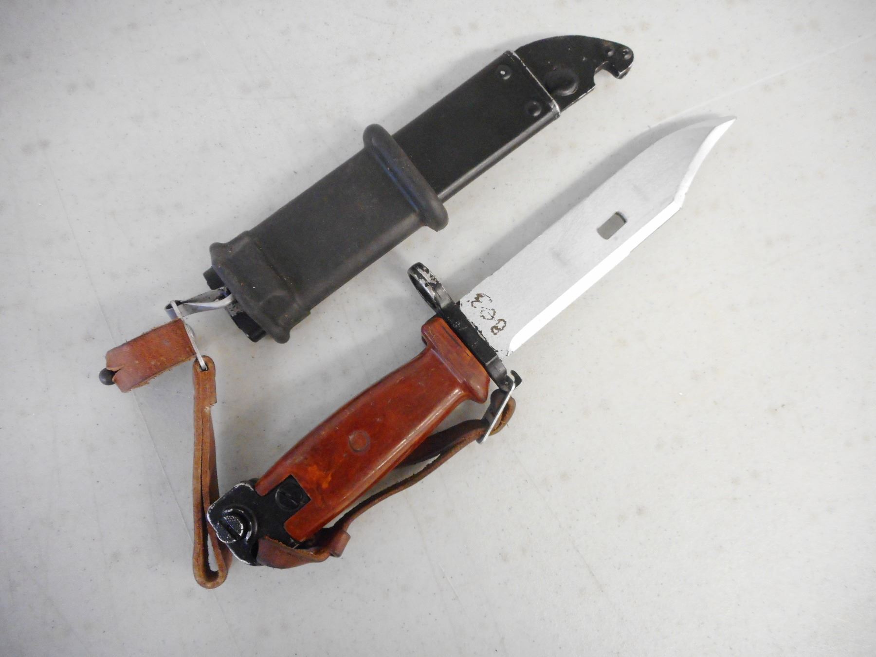 KNIFE BAYONET WITH SCABBARD , ASSORTED CROSSED OUT SERIAL MARKS ON CROSSGUARD & SCABBARD WITH RUBBER/LEATHER FROG