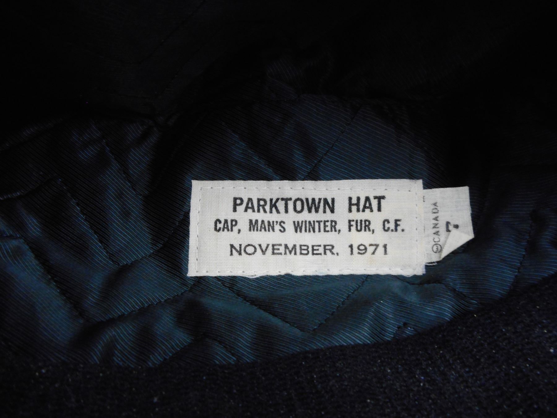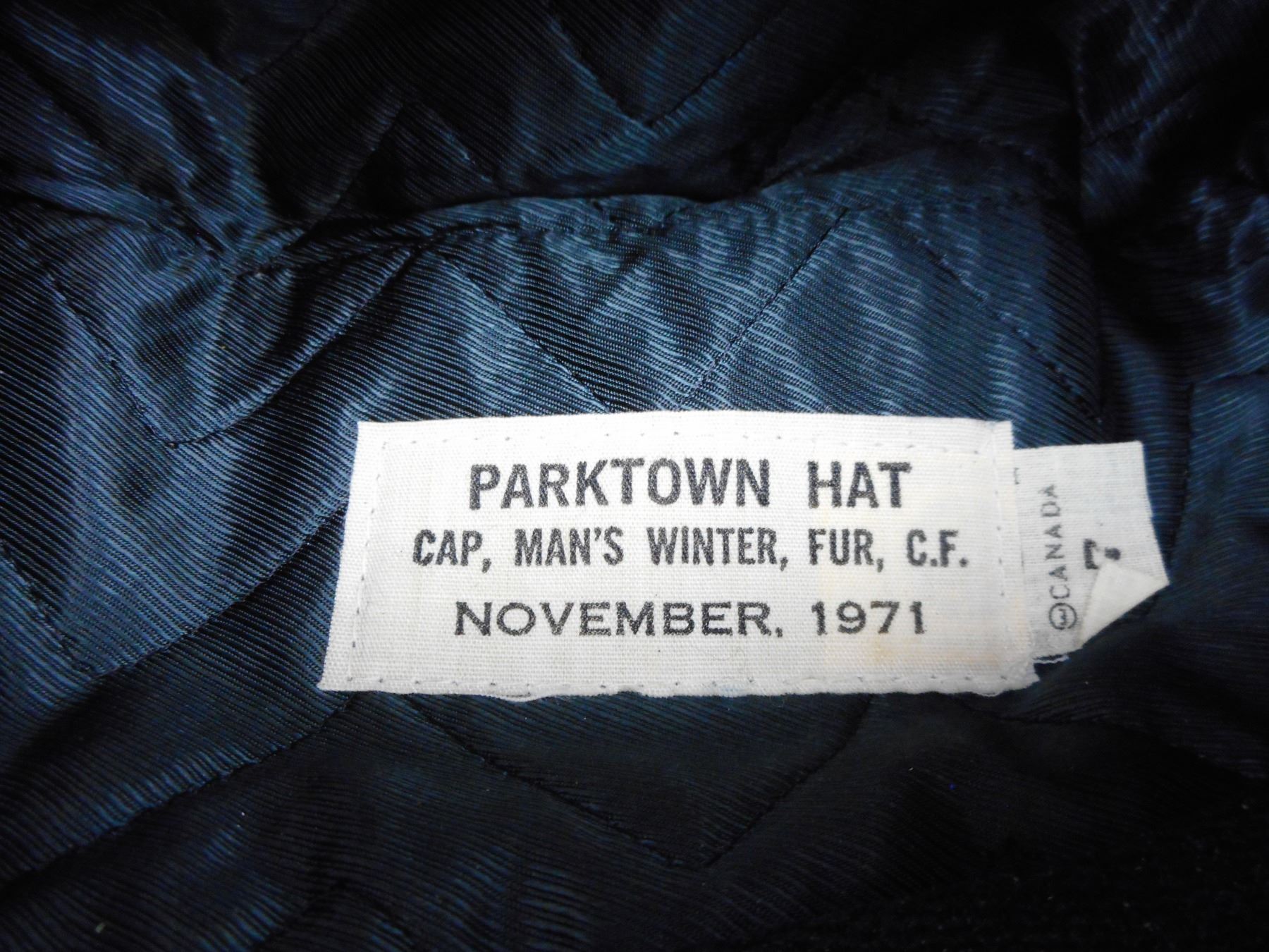 CANADIAN MEN'S WINTER FUR HAT , LABEL DATED NOVEMBER 1971