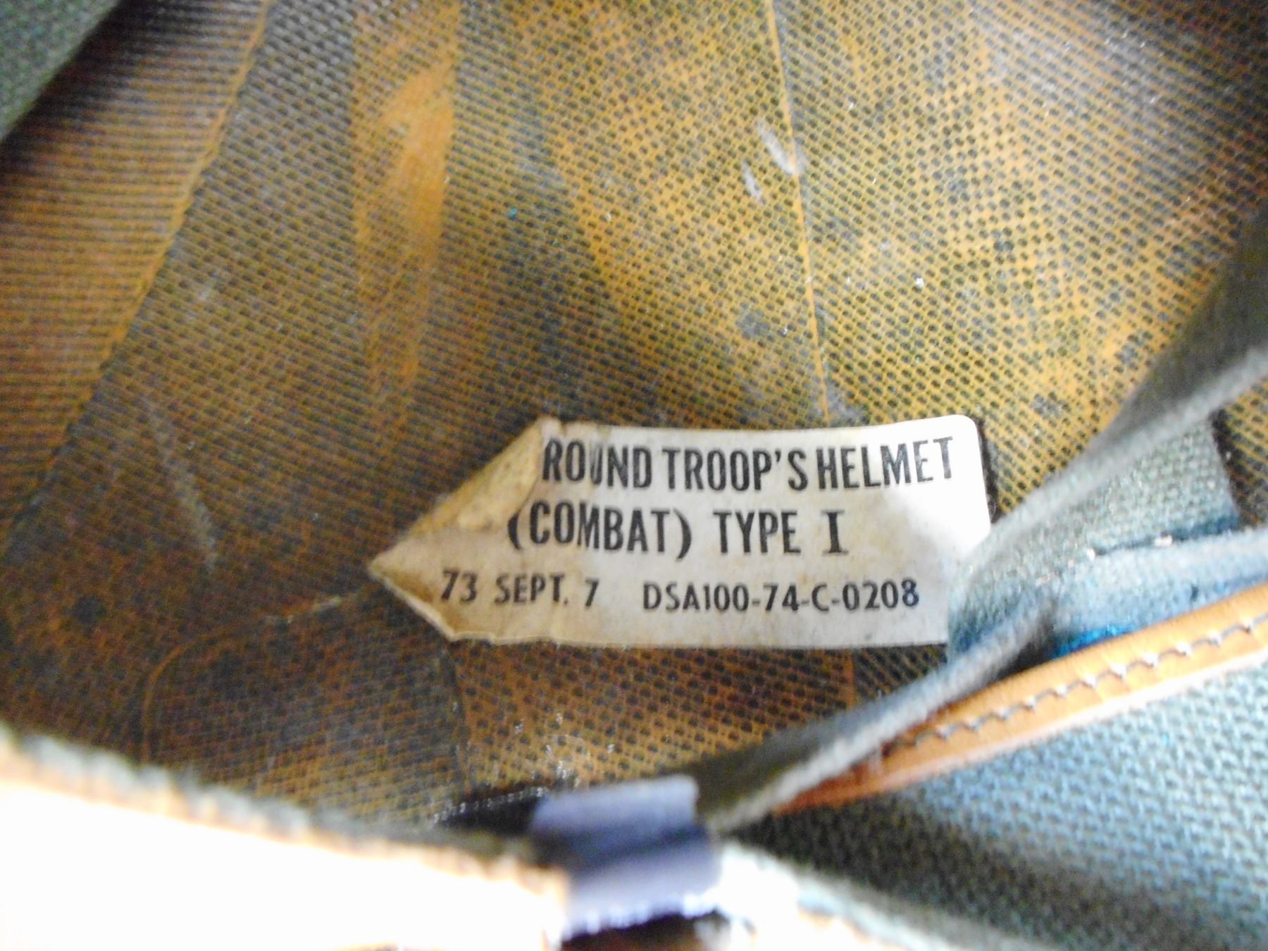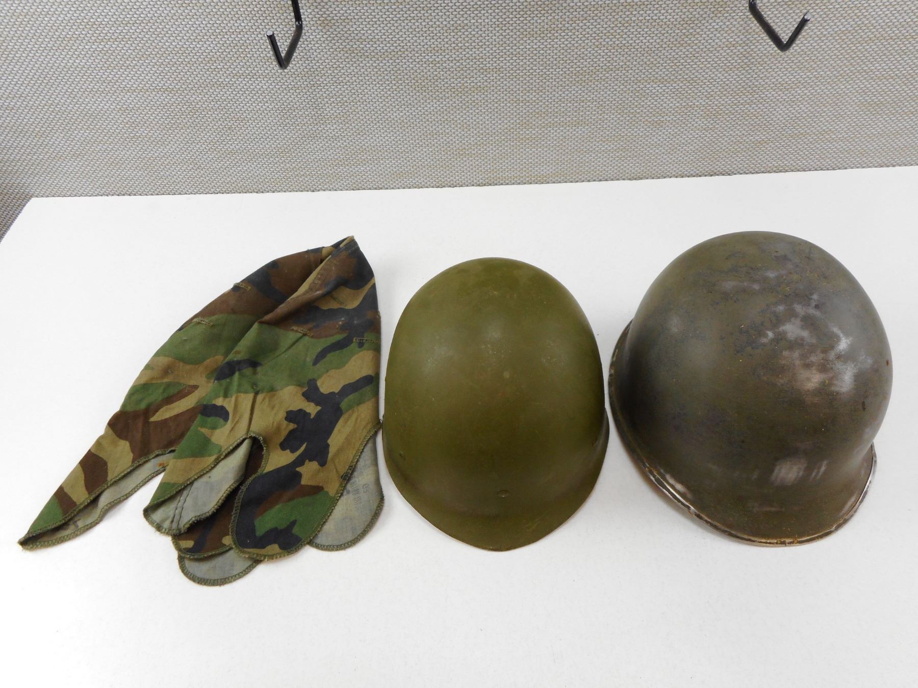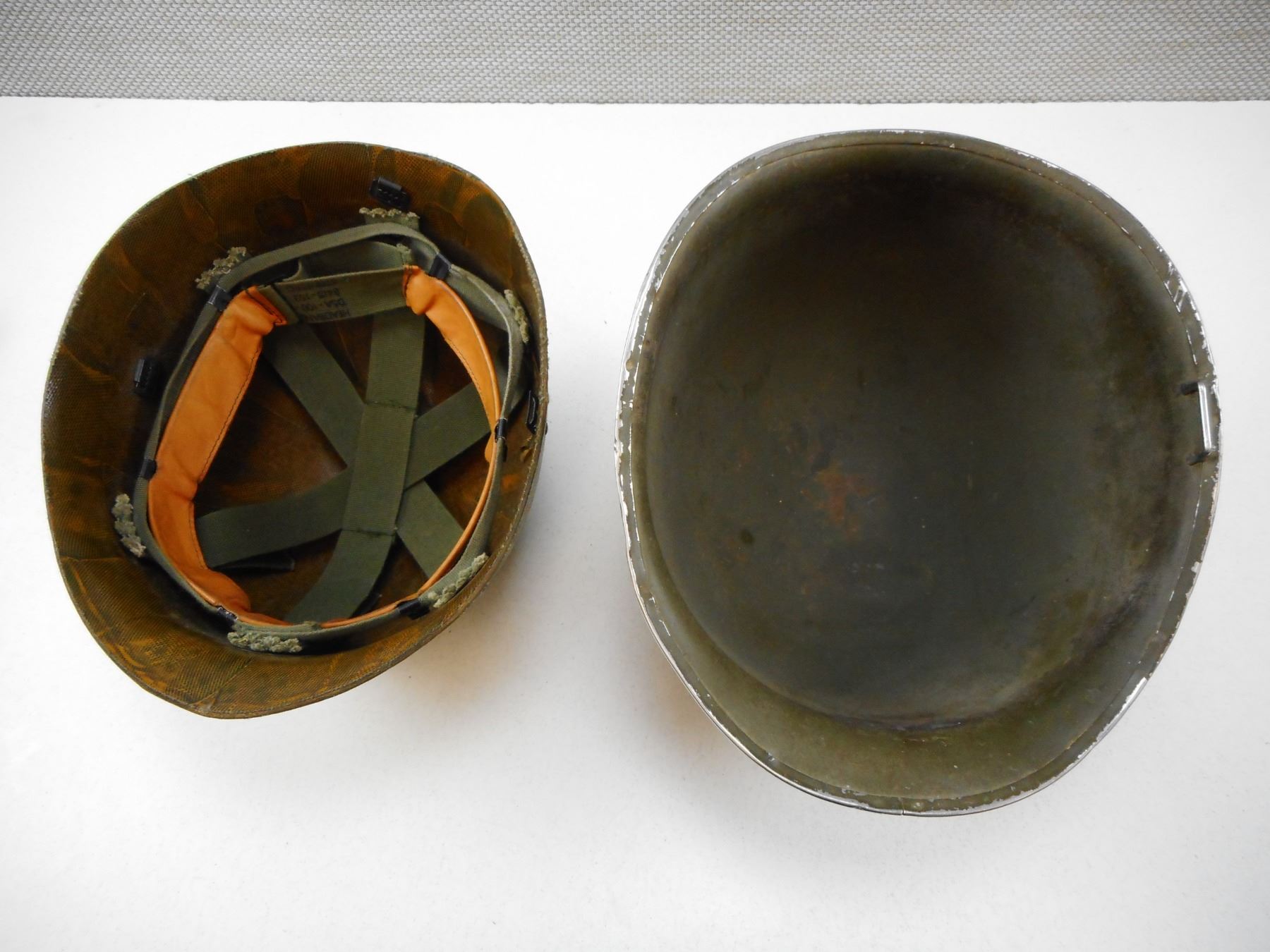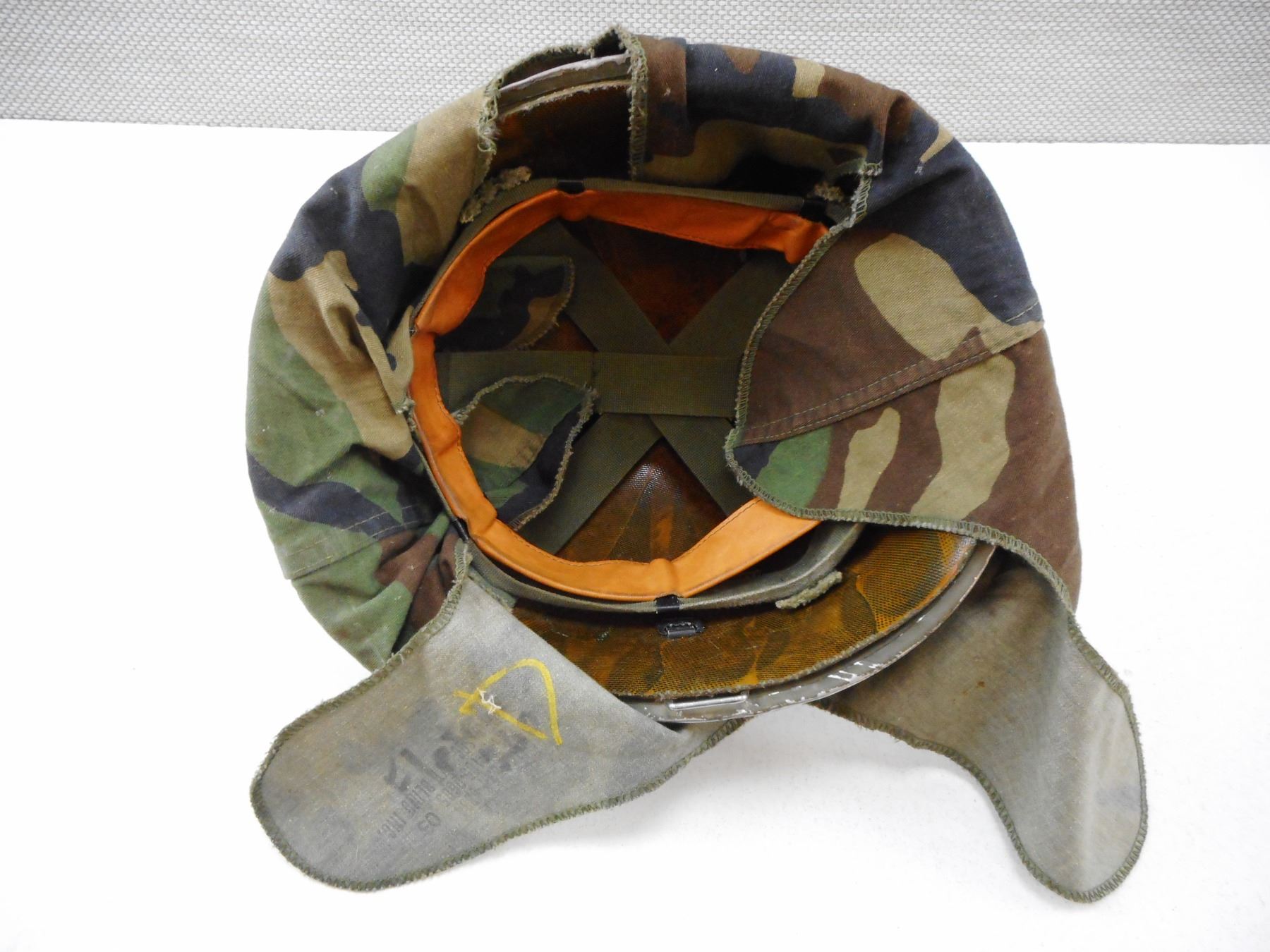 CANADIAN HELMET WITH CAMO COVER & LINER , NO VISIBLE MARKS ON HELMET OR LINER, WORN STAMP ON COVER AND HEADBAND STAMP