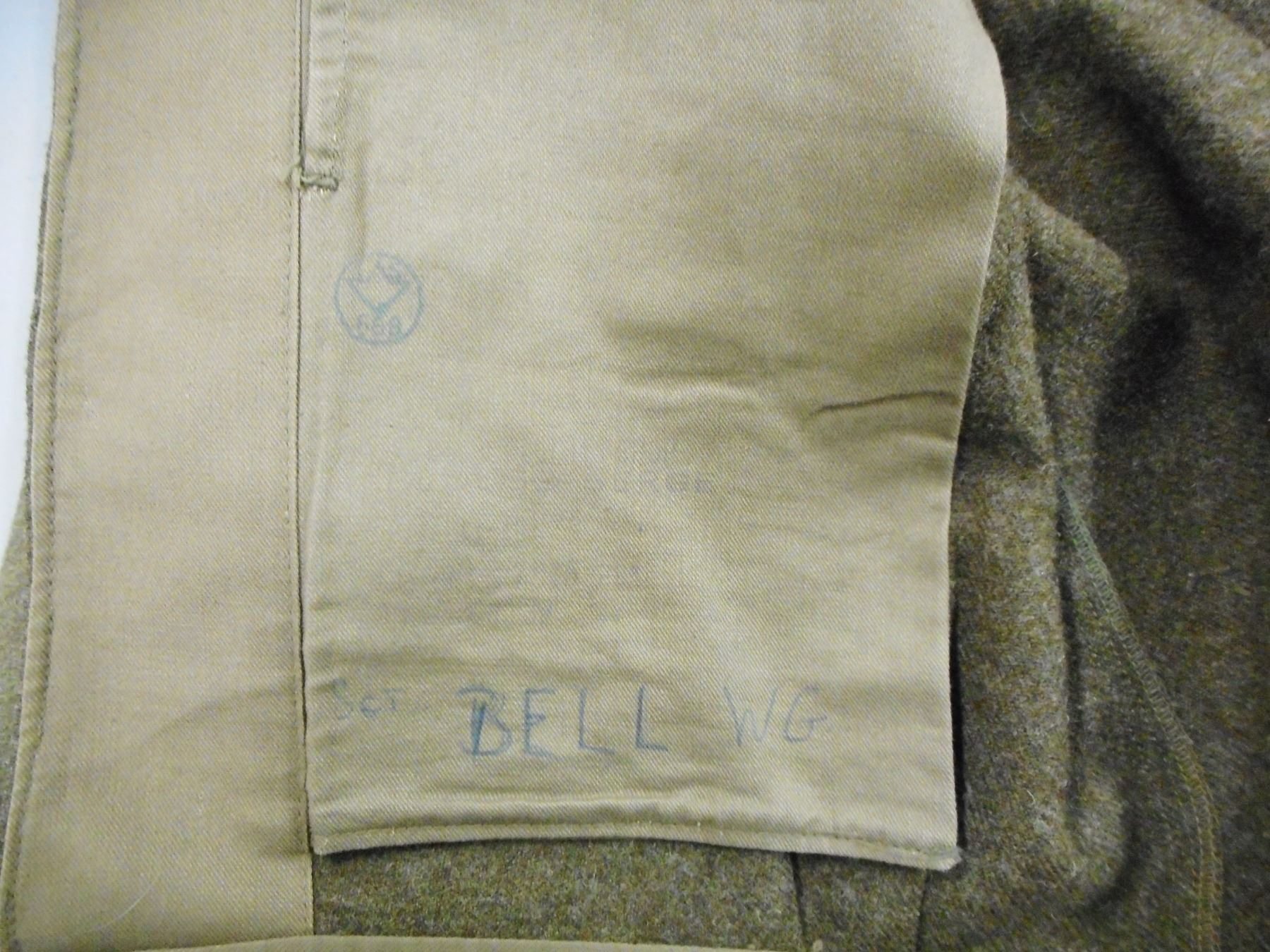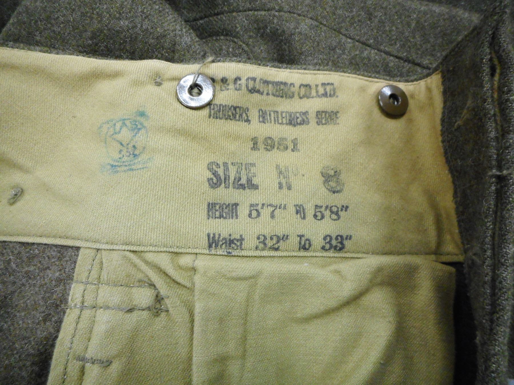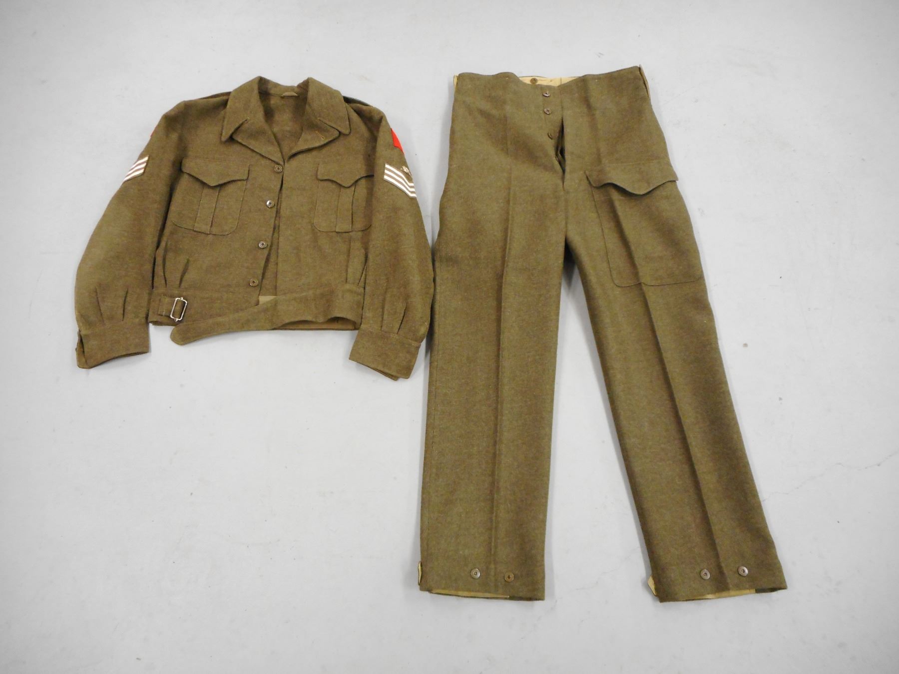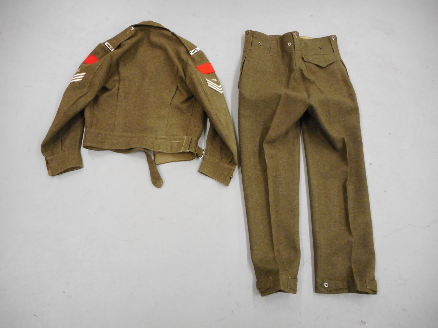 WOOL ROYAL CANADIAN HORSE ARTILLERY UNIFORM , GREEN WOOL JACKET WITH RANK STRIPES, R.C.H.A. SHOULDER & ARM PINS, PENNED INSIDE BELL WG, GREEN WOOL TROUSERS STAMPED INSIDE 1951 SIZE NO 8