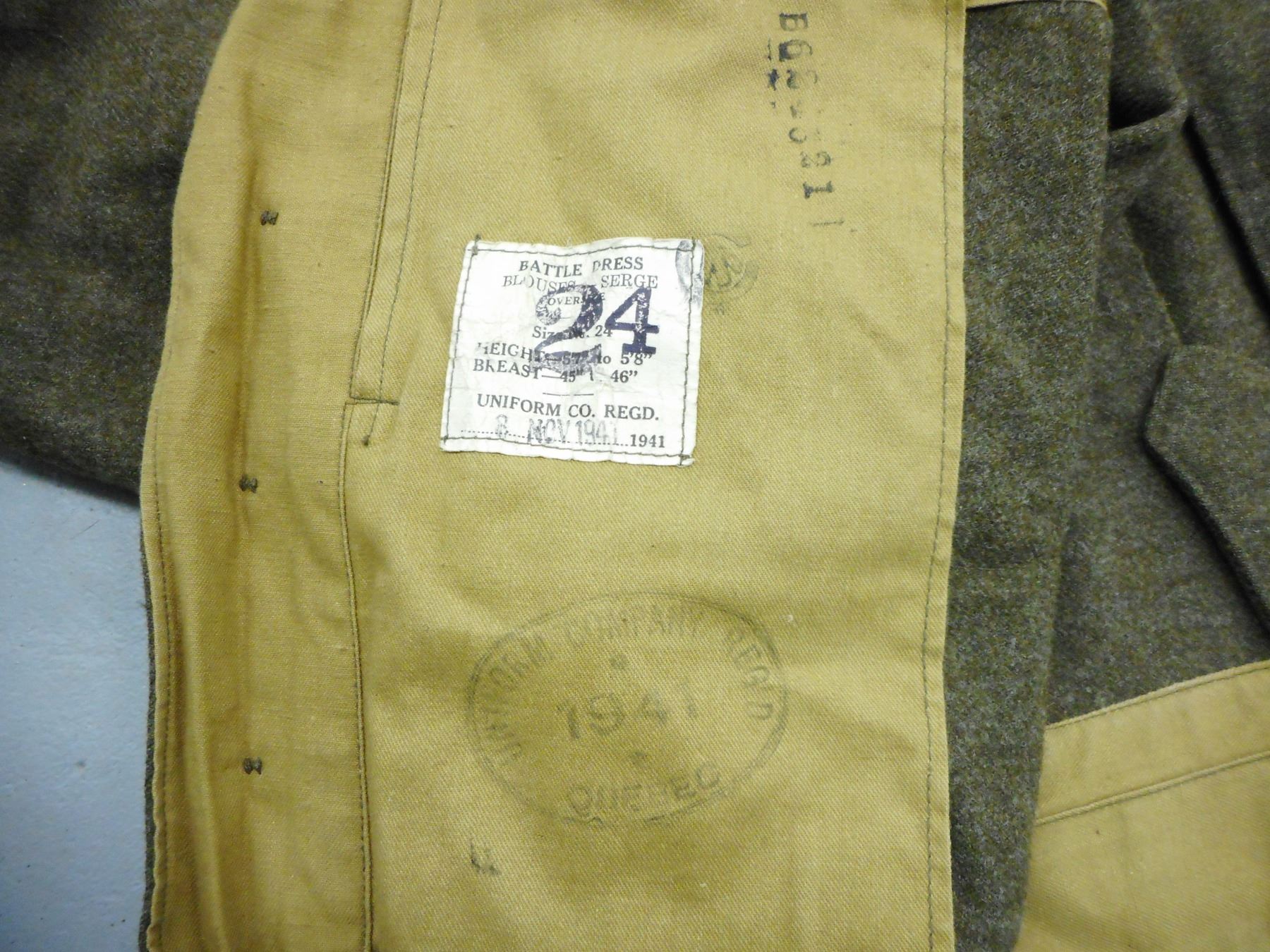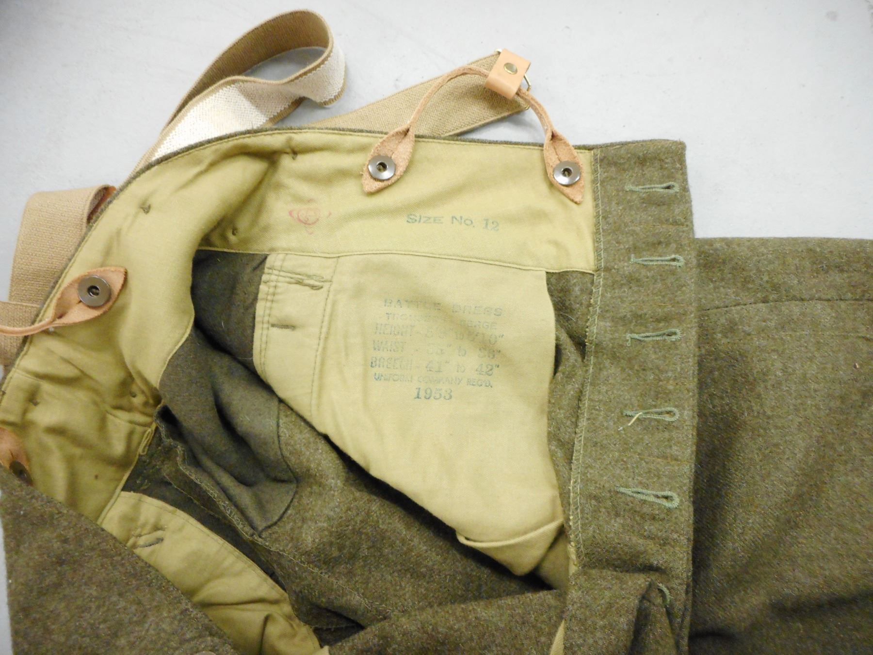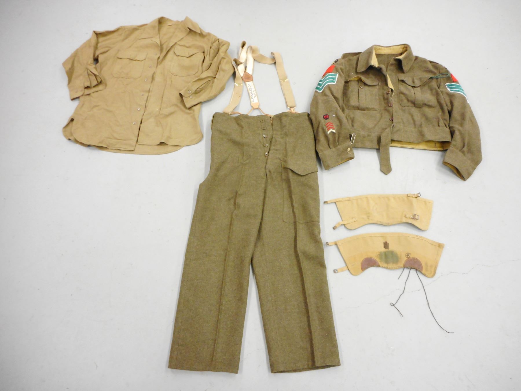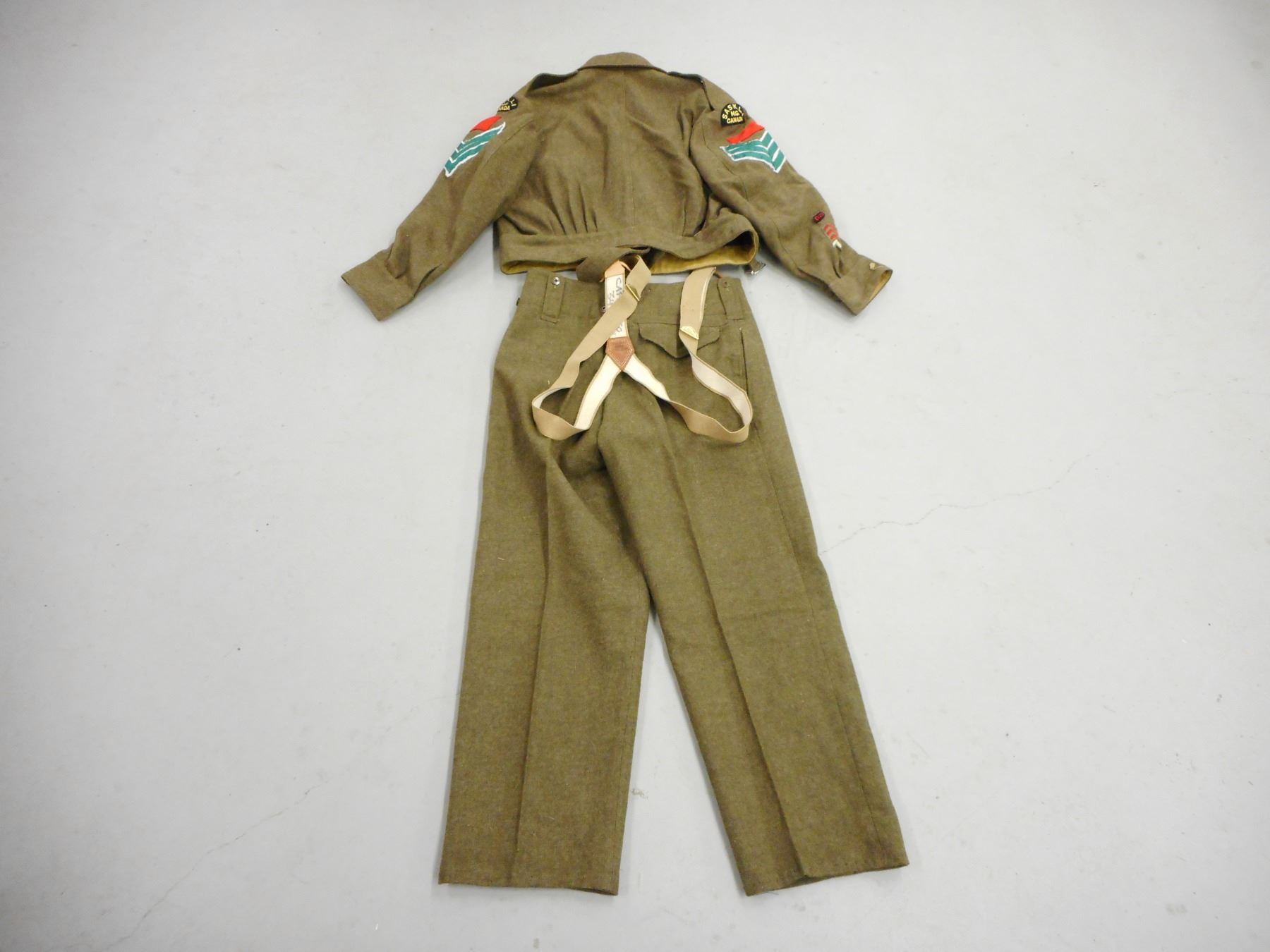 WWII SASKATCHEWAN LIGHT INFANTRY M.G. UNIFORM , (1) GREEN WOOL JACKET: BATTLE DRESS BLOUSES SERGE DATED 8 NOV 1941, WITH CANADIAN BROAD ARROW MARKS, INCLUDES RANK STRIPES, SERVICE STRIPES, SHOULDER BADGES, GAITERS WITH CANADIAN BROAD ARROW MARK, SHIRT, GREEN WOOL TROUSERS WITH SUSPENDERS DATED 1958, INCLUDES SMALL BIBLE, AND GREEN CORD WITH ATTCHED WHISTLE & MULTI-TOOL, IN CONJUNCTION WITH BOTTING ITEMS
