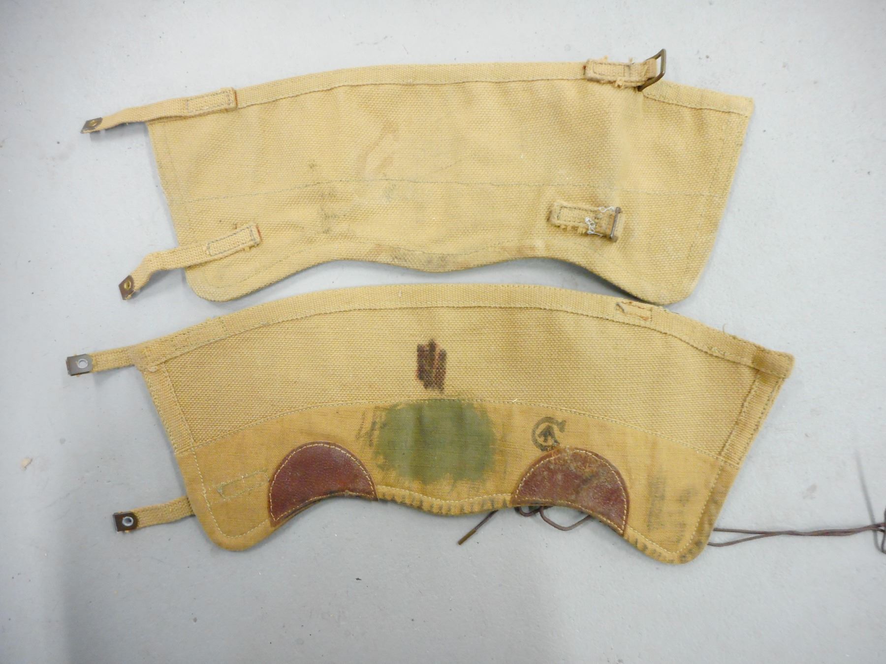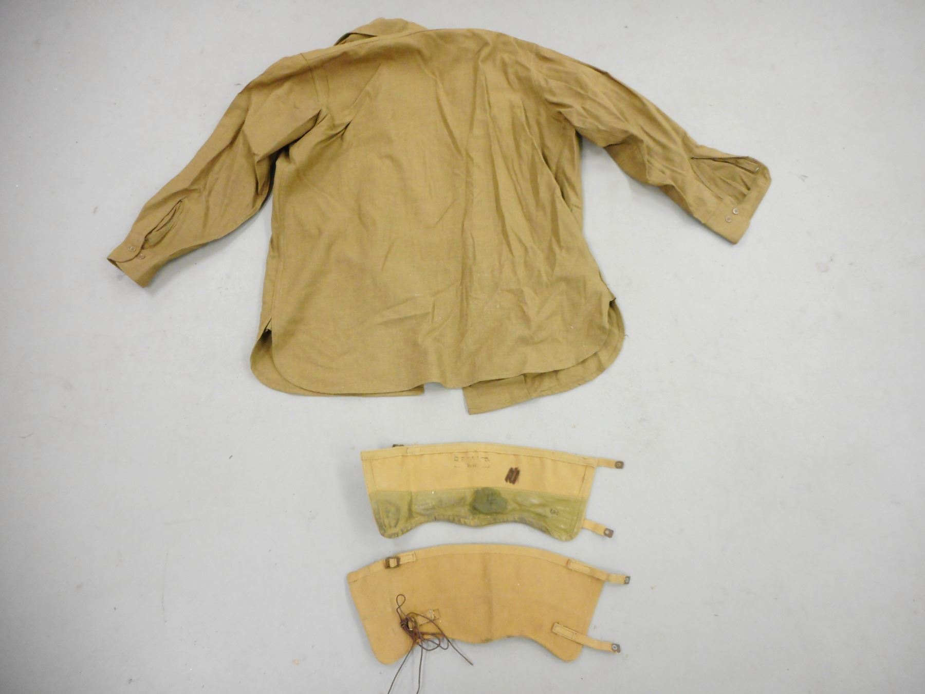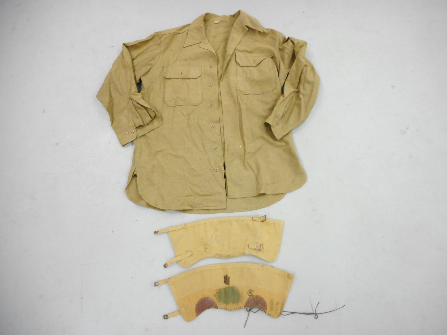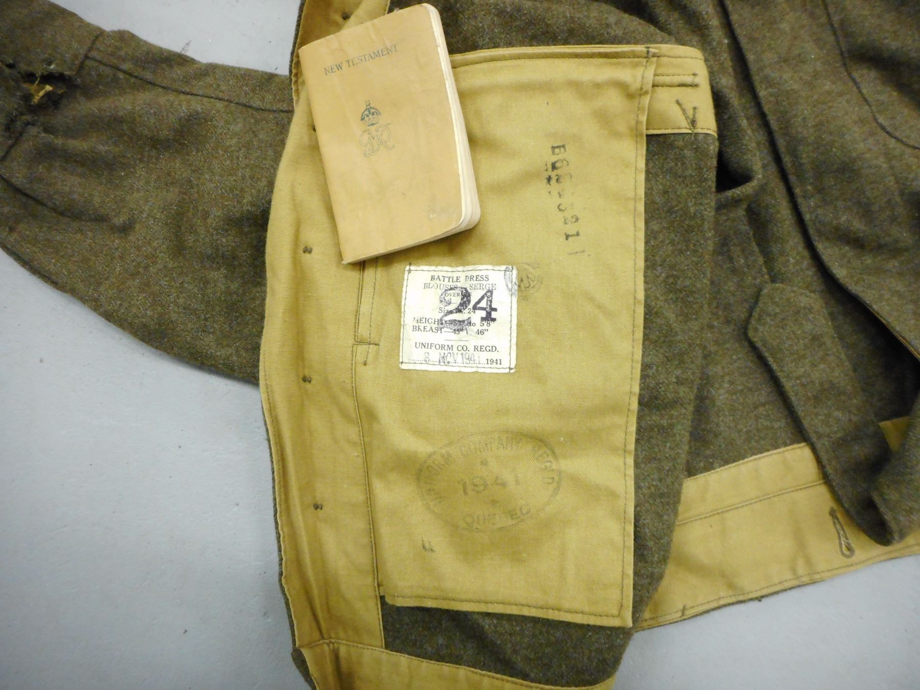 WWII SASKATCHEWAN LIGHT INFANTRY M.G. UNIFORM , (1) GREEN WOOL JACKET: BATTLE DRESS BLOUSES SERGE DATED 8 NOV 1941, WITH CANADIAN BROAD ARROW MARKS, INCLUDES RANK STRIPES, SERVICE STRIPES, SHOULDER BADGES, GAITERS WITH CANADIAN BROAD ARROW MARK, SHIRT, GREEN WOOL TROUSERS WITH SUSPENDERS DATED 1958, INCLUDES SMALL BIBLE, AND GREEN CORD WITH ATTCHED WHISTLE & MULTI-TOOL, IN CONJUNCTION WITH BOTTING ITEMS