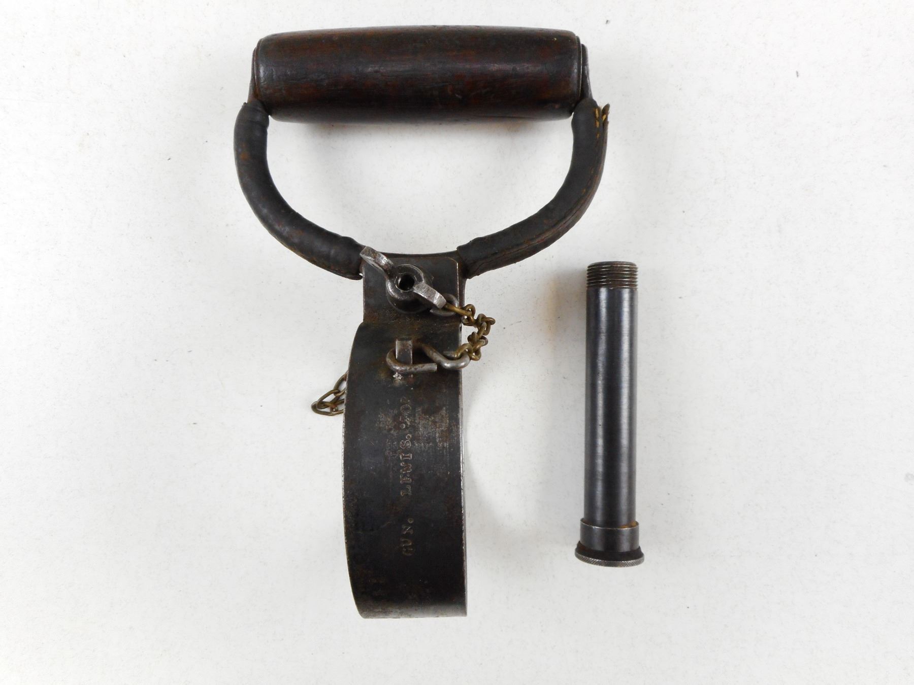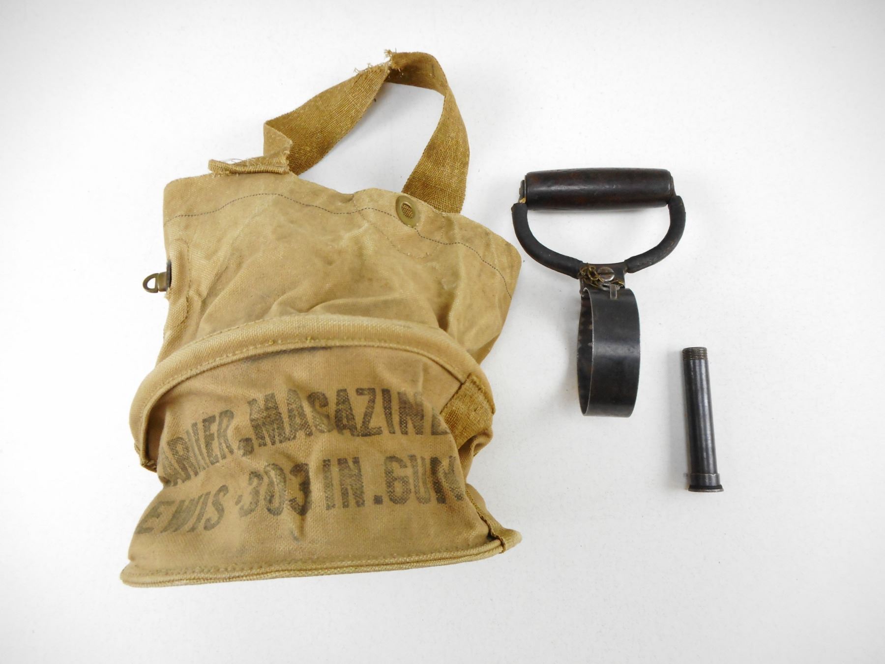 ANTIQUE LEWIS GUN ACCESSORIES , (1) BAG/POUCH STAMPED __ BRIGGS (LONDON) LTD. MAKERS 1916 WITH BROAD ARROW MARKED CARRIER, MAGAZINE LEWIS 303 IN GUN, (1) BUTT STOCK OILER, (1) CARRYING HANDLE STAMPED GUN. LEWIS. 303 WITH BROAD ARROW MARK &