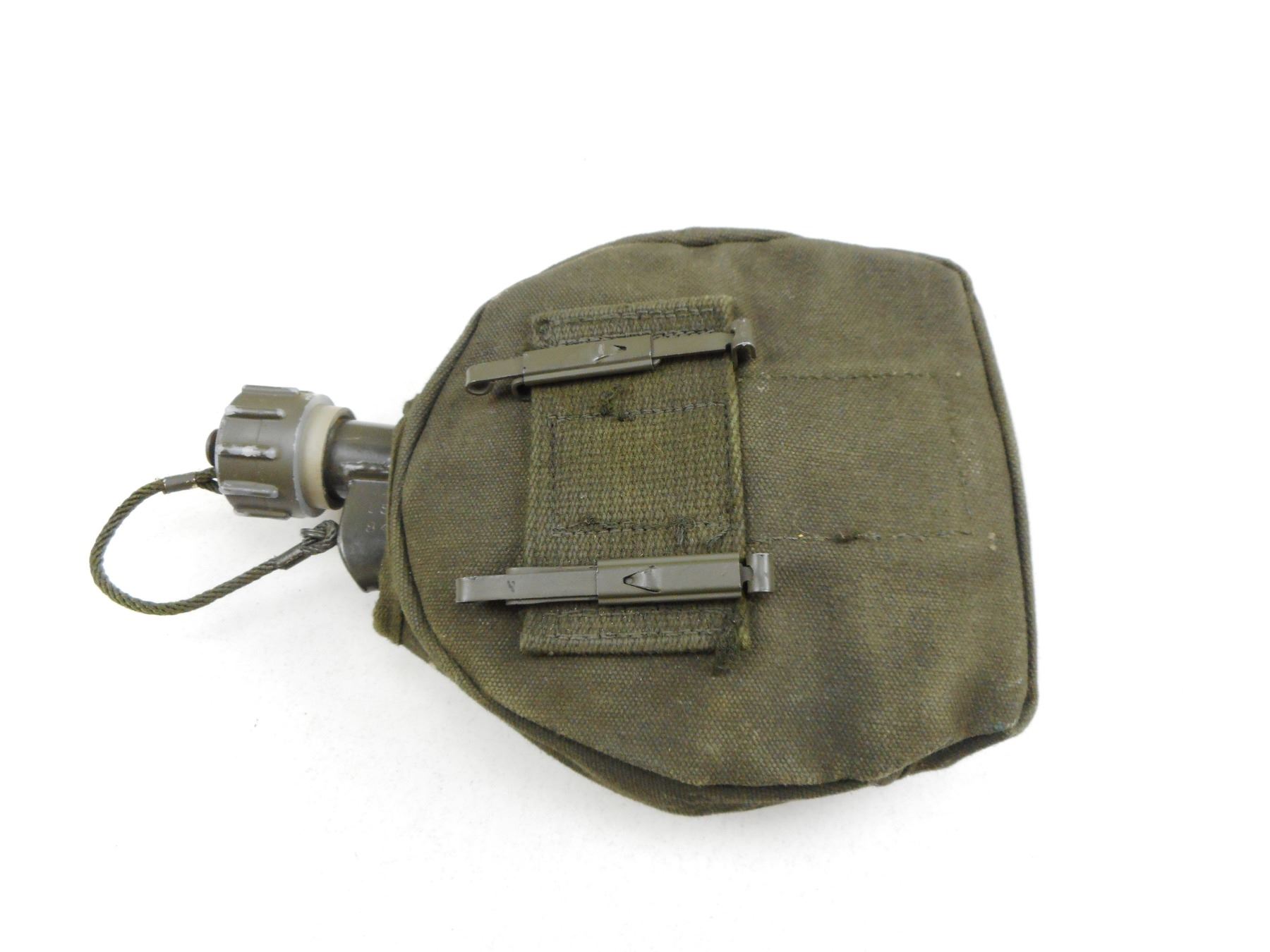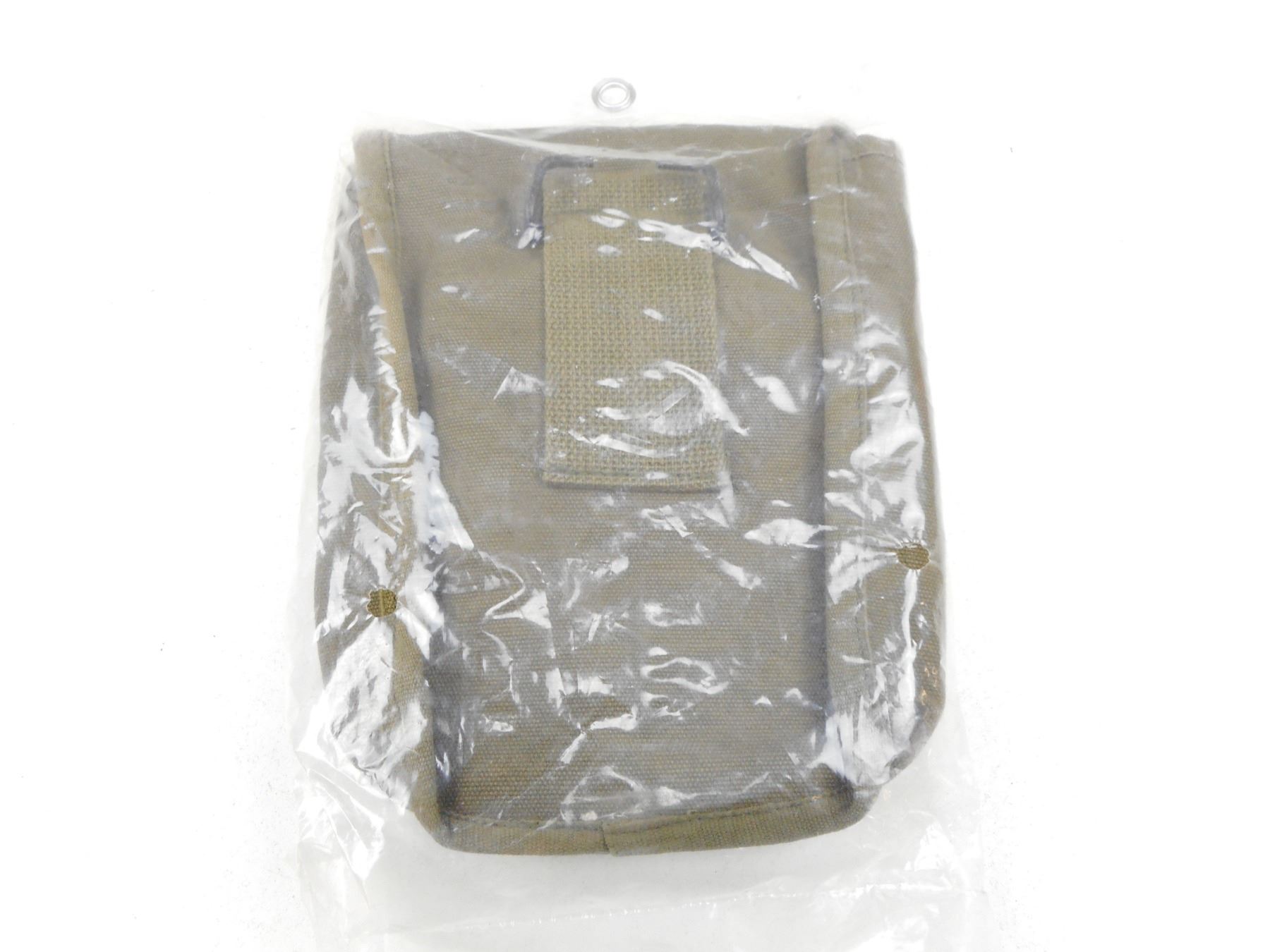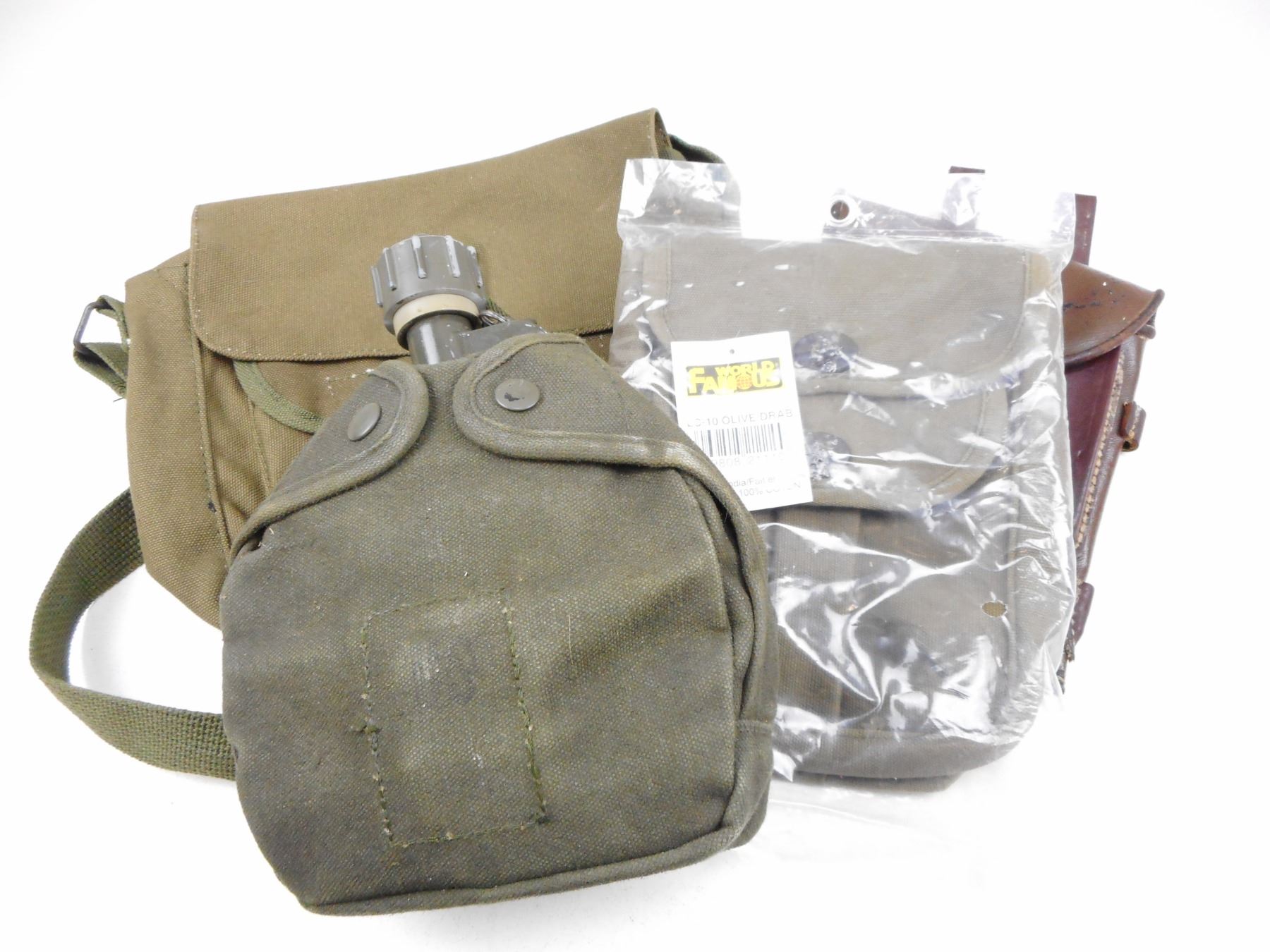 POUCHES, HOLSTER, & CANTEEN , (2) OLIVE GREEN POUCHES: (1) NEW IN BAG, (1) BROWN LEATHER HOLSTER, (1) METAL CANTEEN WITH GREEN CANVAS SLEEVE, LOT OF 4