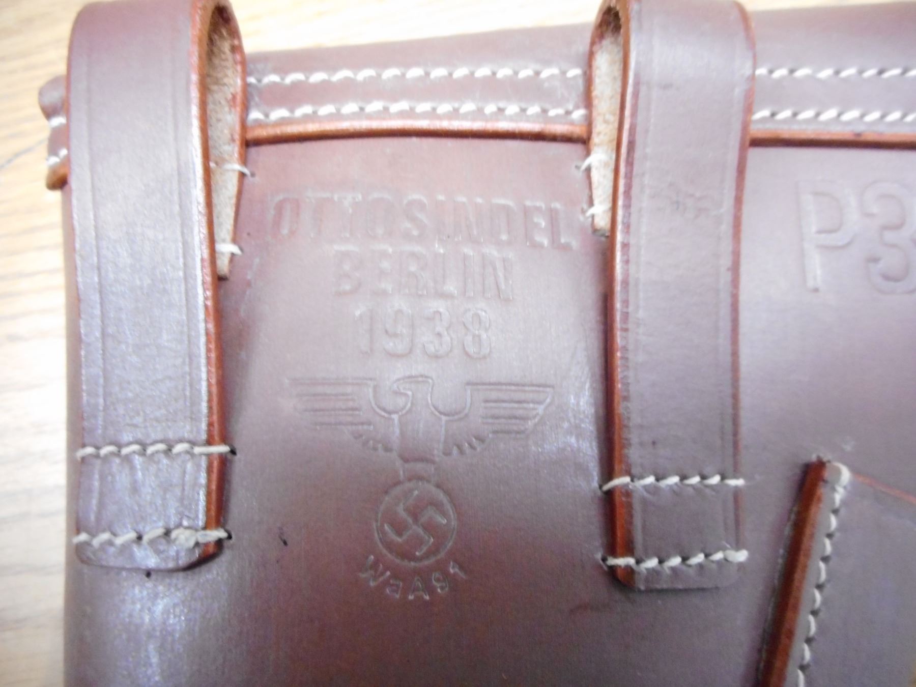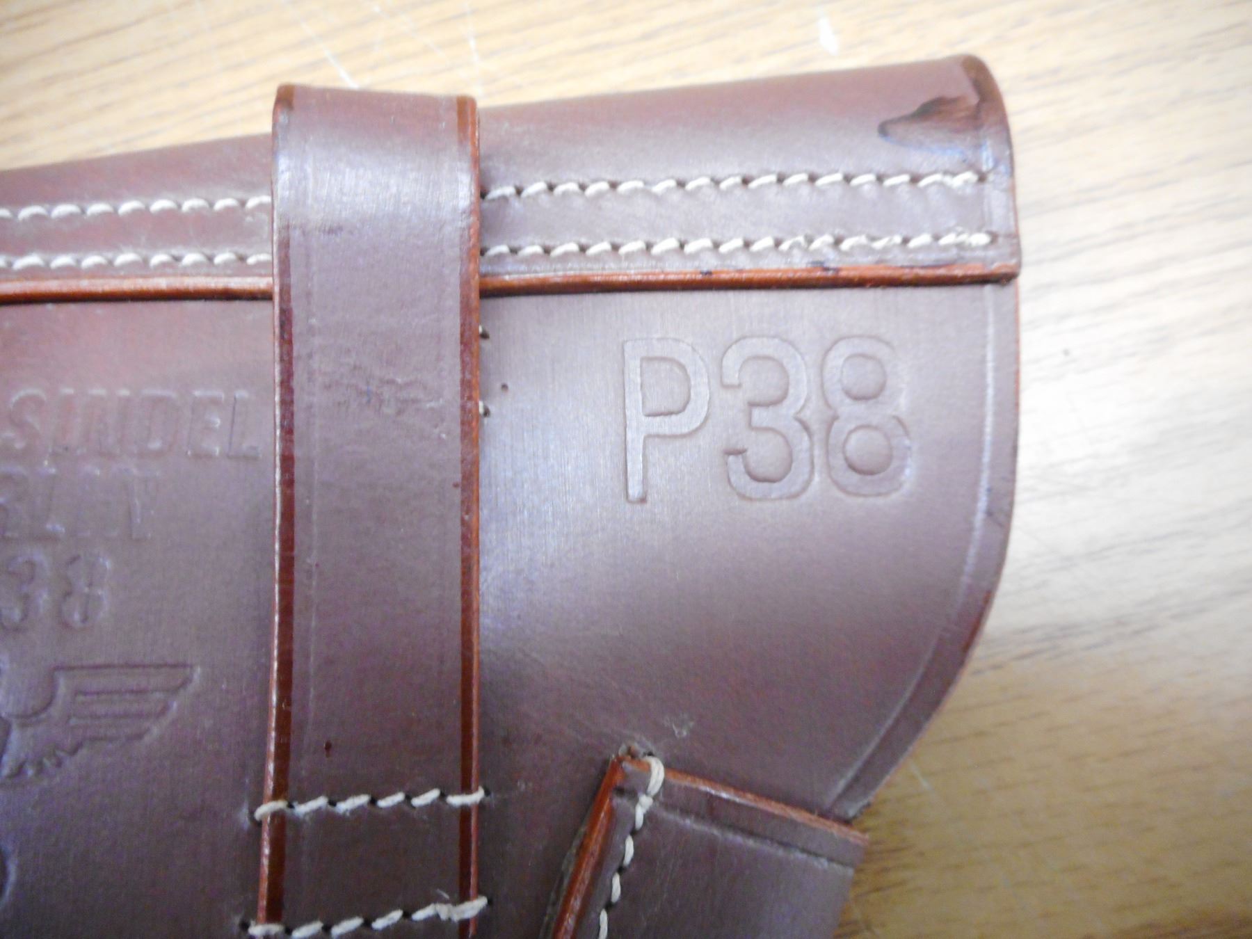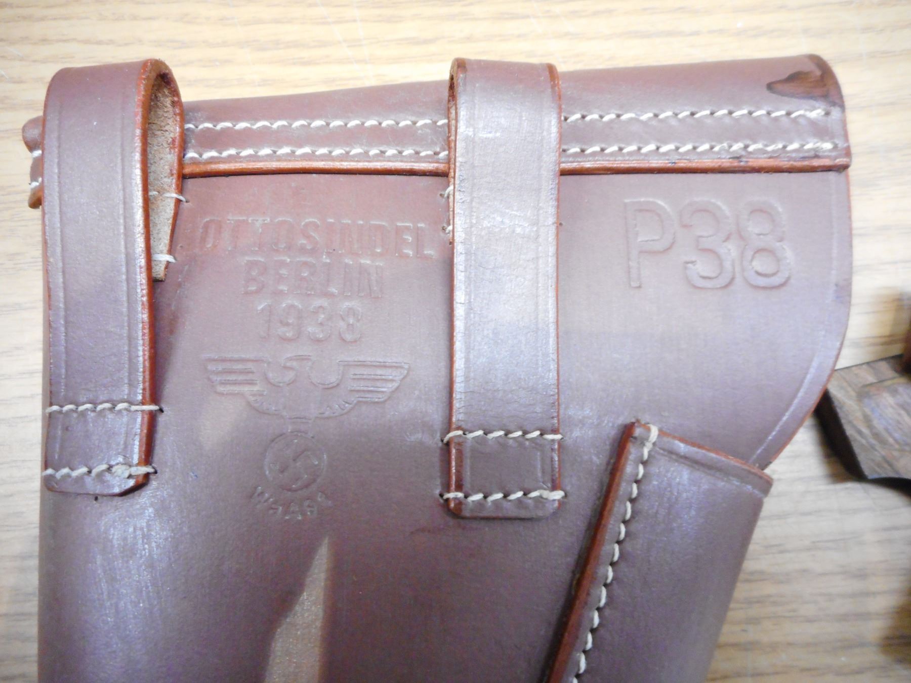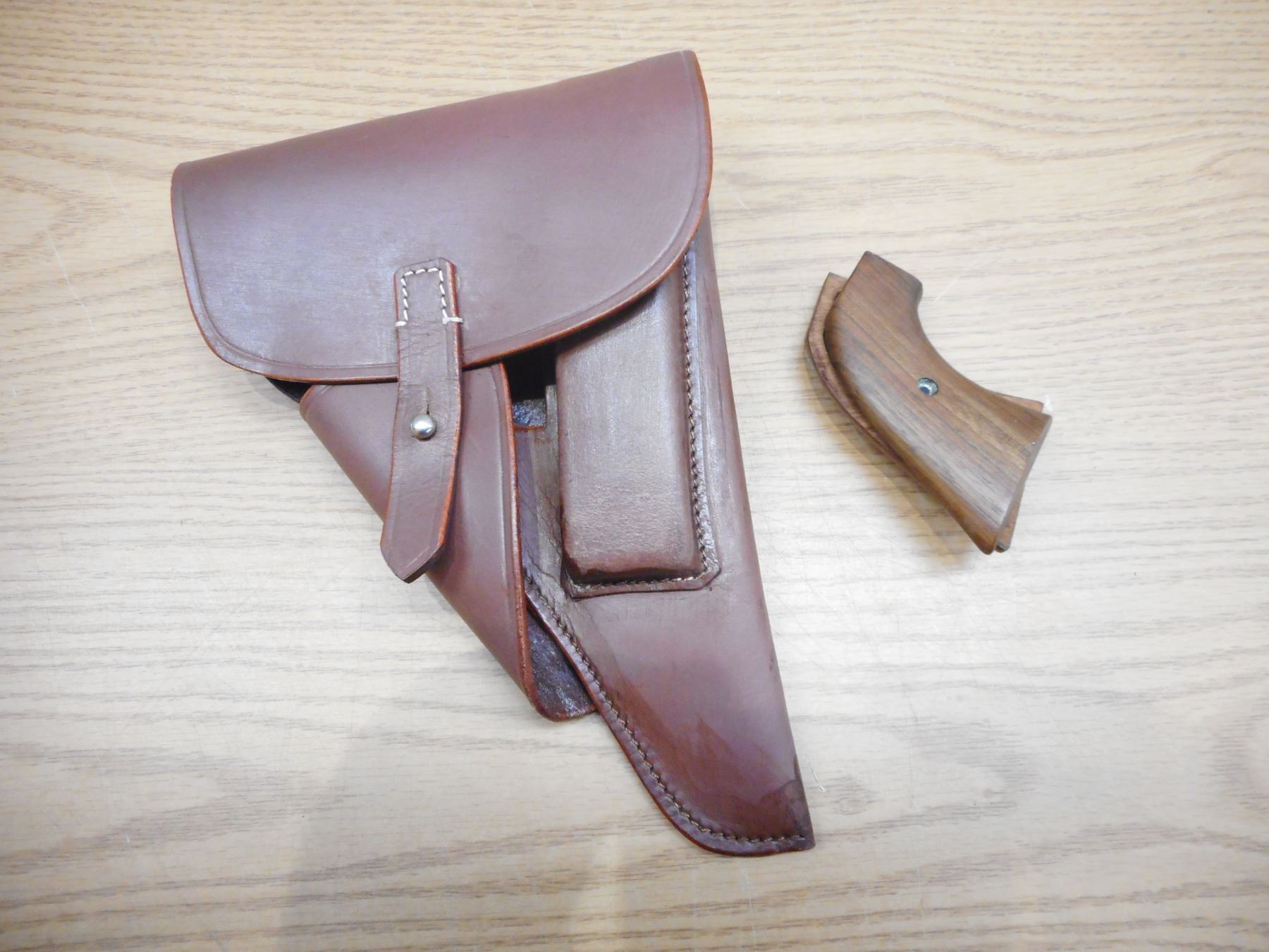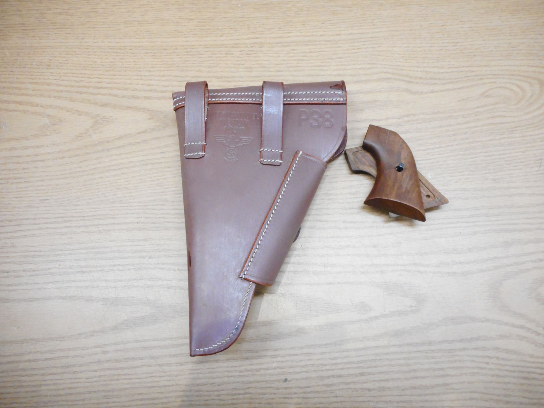 BROWN P38 HOLSTER WWII REPRODUCTION & WOODEN GRIPS , (1) BROWN HOLSTER, REVERSE STAMPED OTTOSINDEL BERLIN 1938 WAA91 P38 (1) WOODEN GRIPS WITH SCREW, LOT OF 2