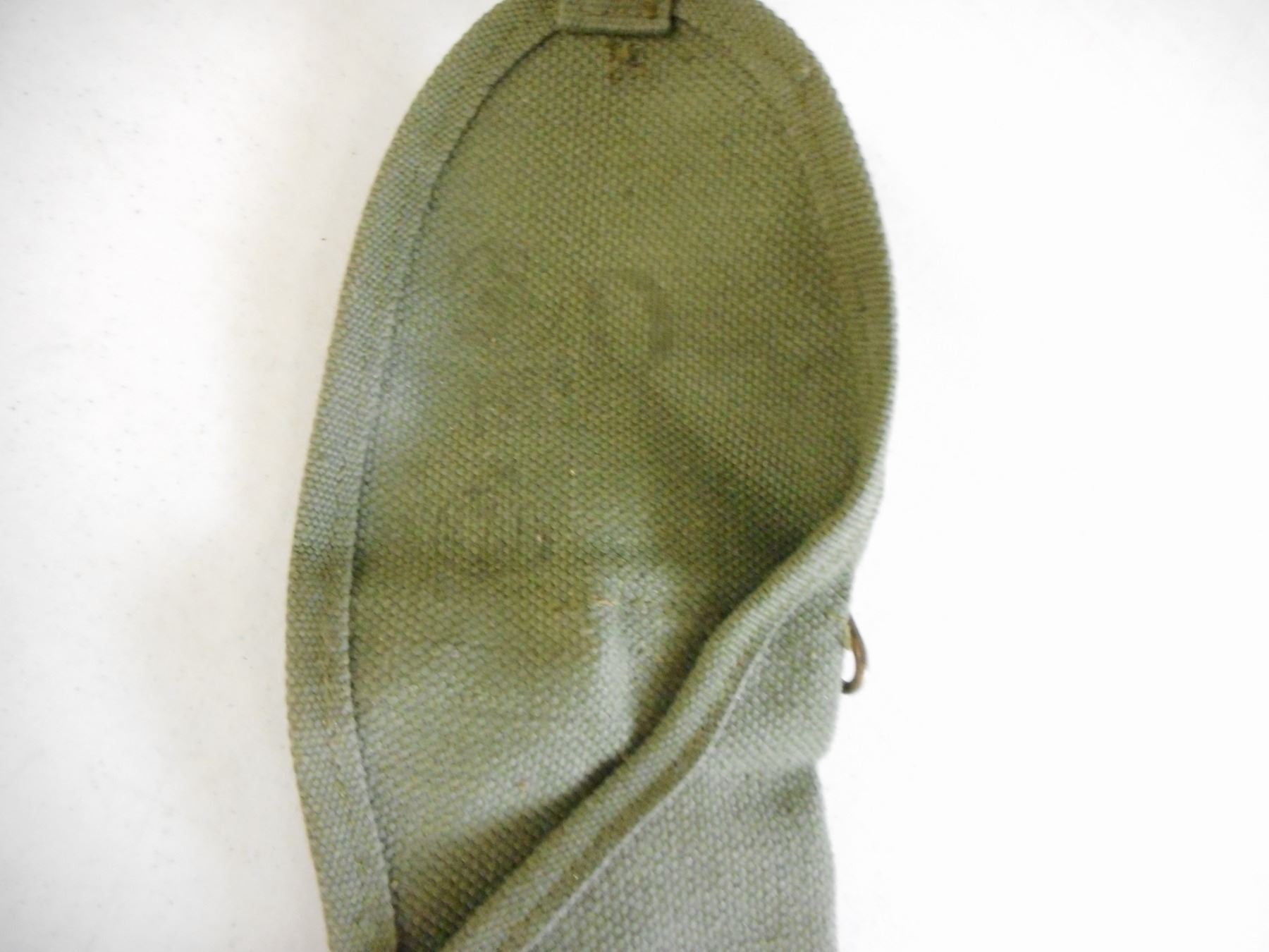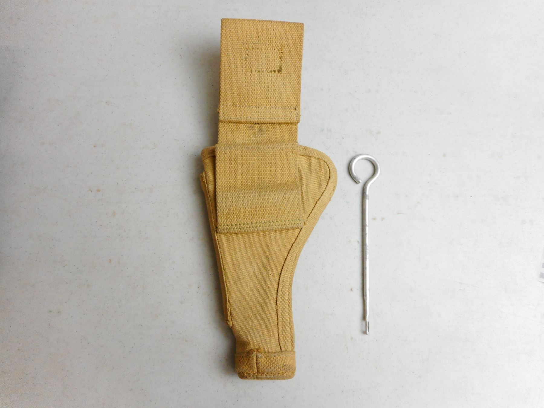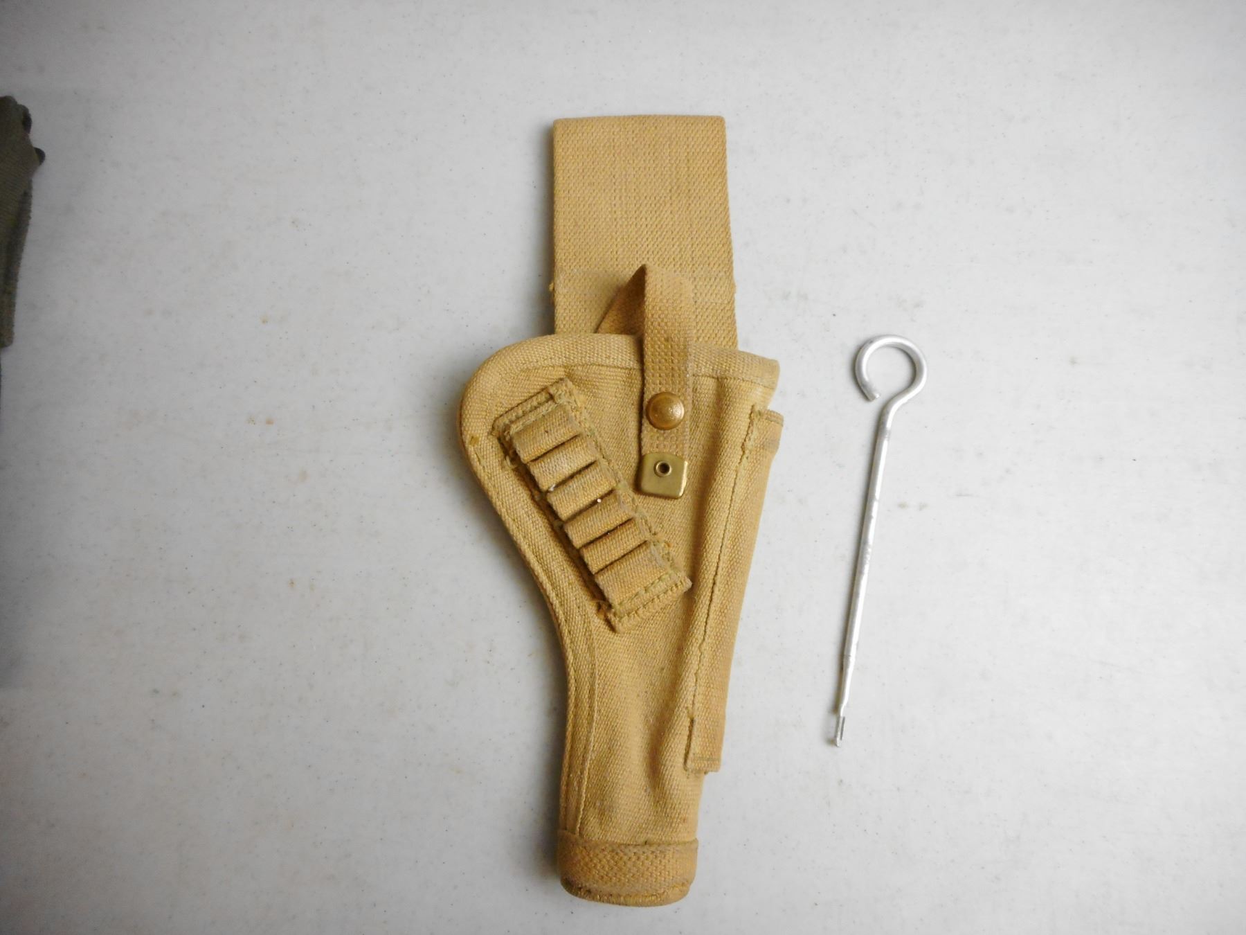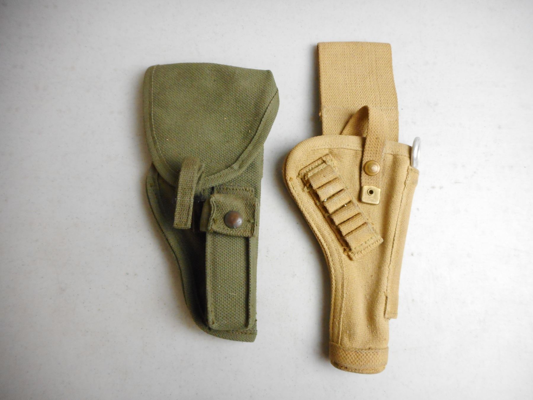 MILITARY CANVAS HOLSTERS , (1) GREEN STAMPED BUT WORN, (1) TAN WITH CLEANING ROD