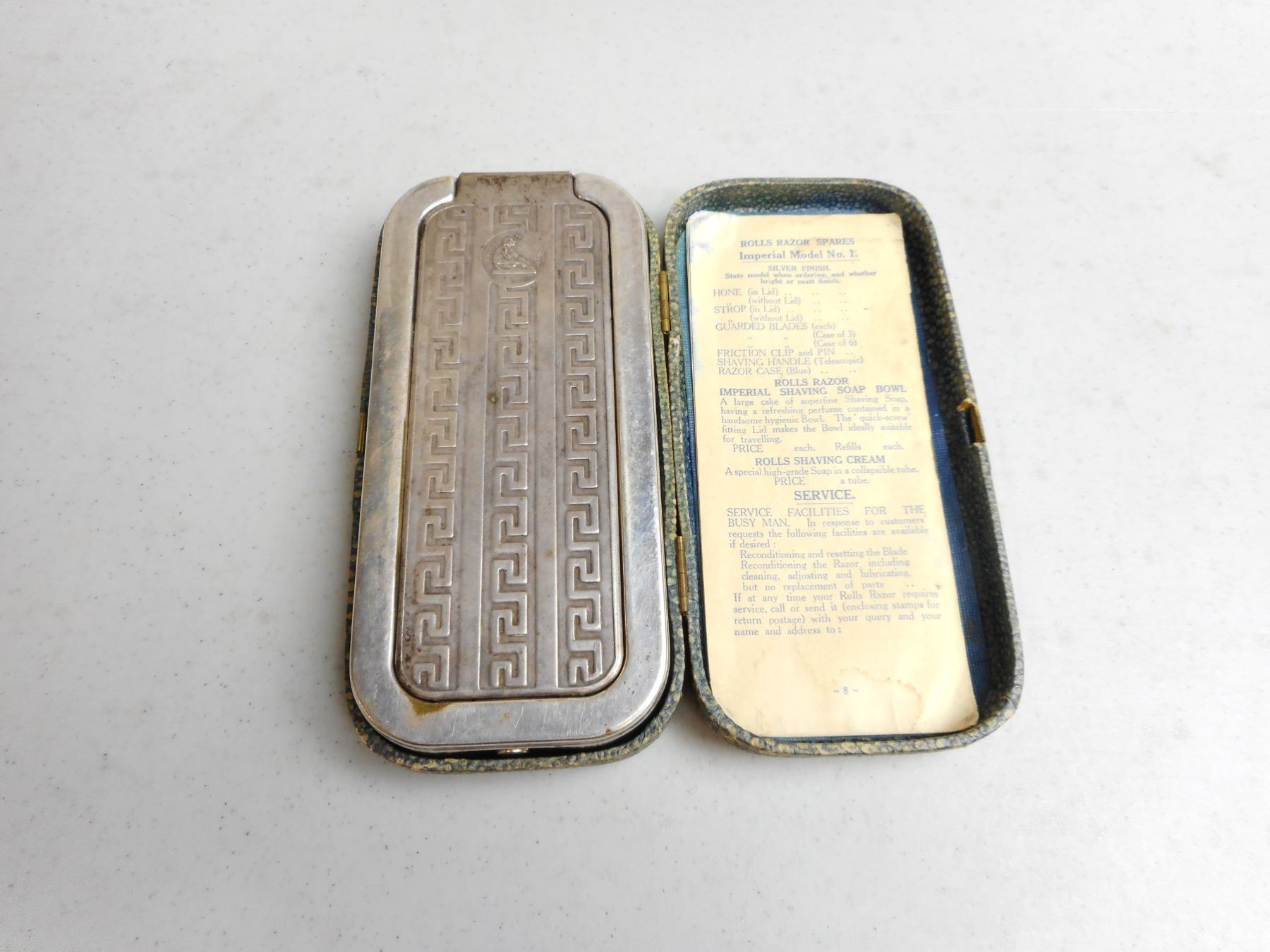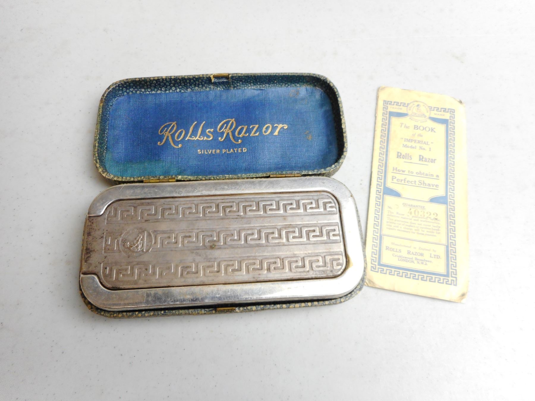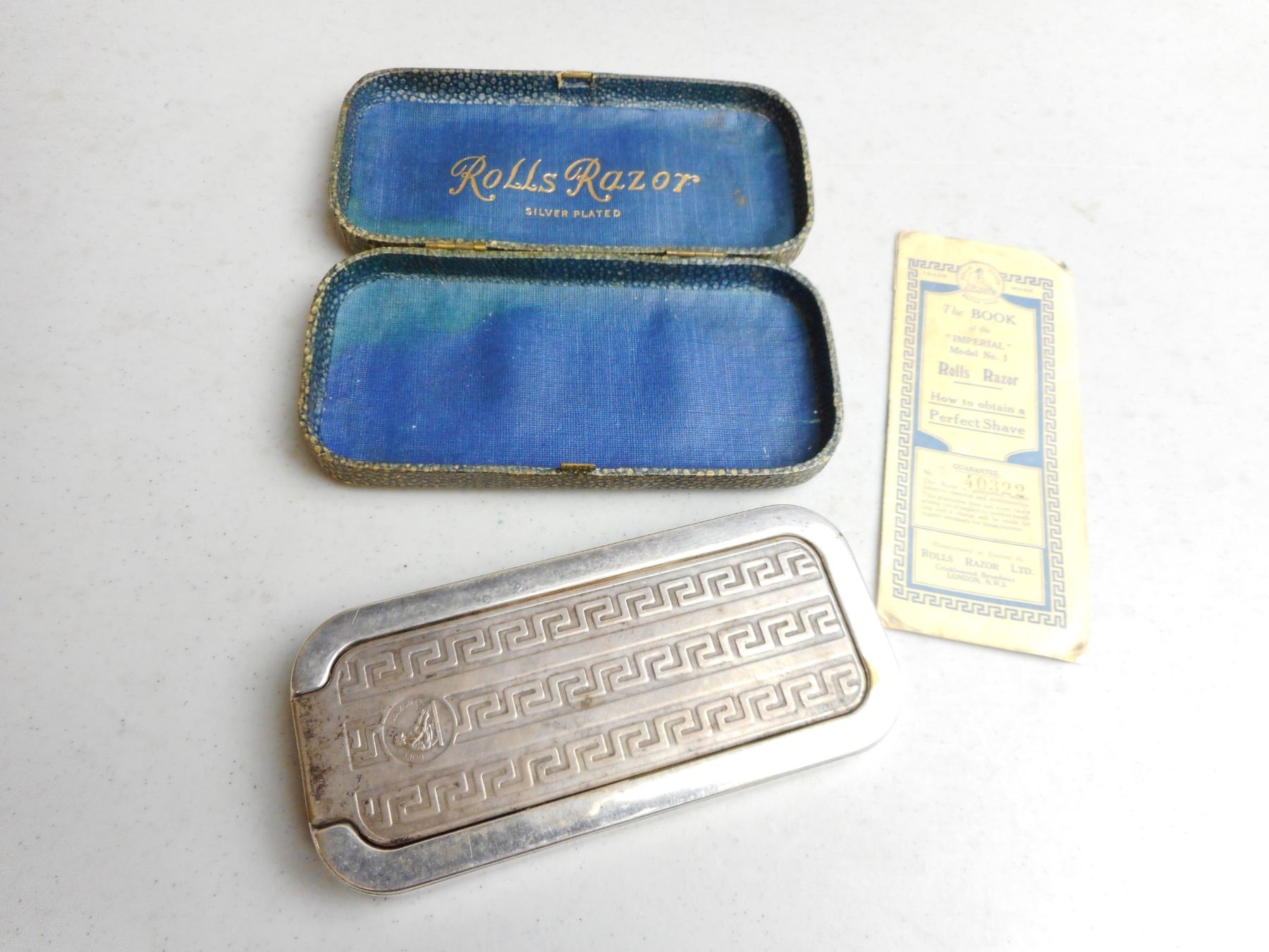 VINTAGE "IMPERIAL" NO. 1 ROLLS RAZOR IN CASE , WITH INSTRUCTIONS & SILVER PLATED CASE, IN ORIGINAL PEBBLED CASE