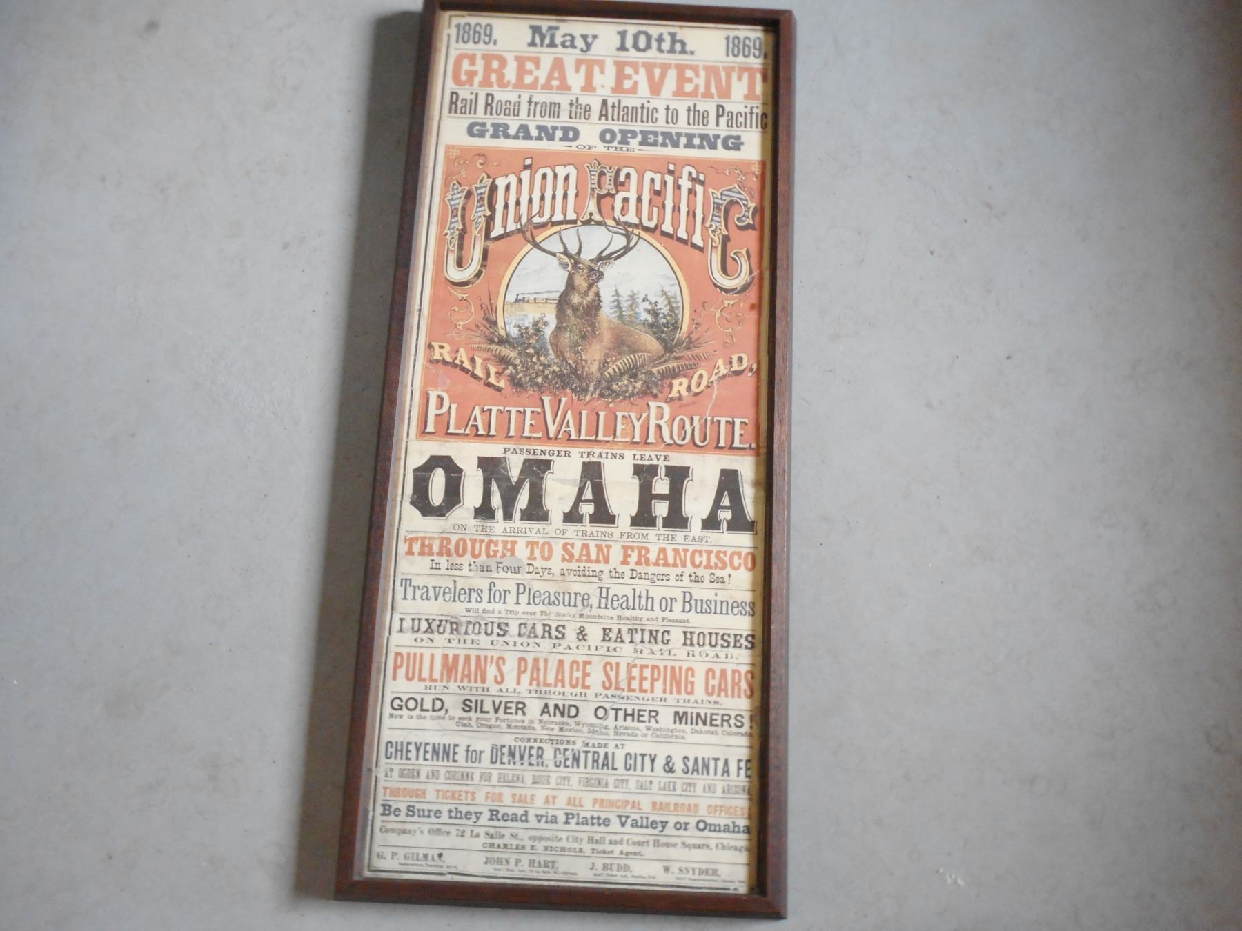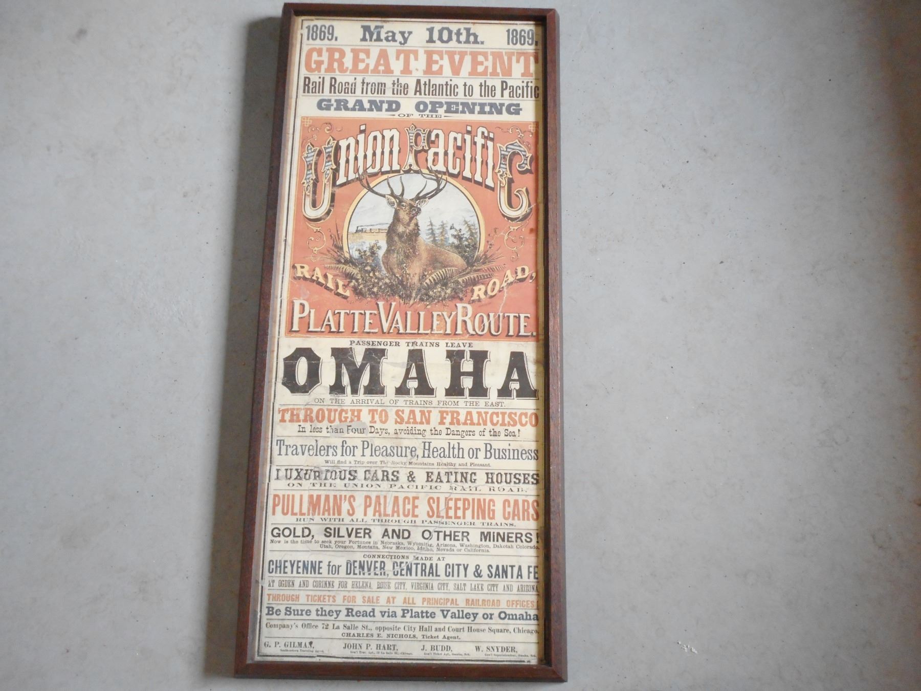 UNION PACIFIC GRAND OPENING FRAMED PRINT , 1869 MAY 10TH GREAT EVENT RAIL ROAD FROM THE ATLANTIC TO THE PACIFIC GRAND OPENING OF THE UNION PACIFIC PALATTE VALLEY ROUTE ETC... FRAMED WITH GLASS APPROX SIZE 38 X 16", NOTICE THERE IS NO GUARENTEE ON GLASS