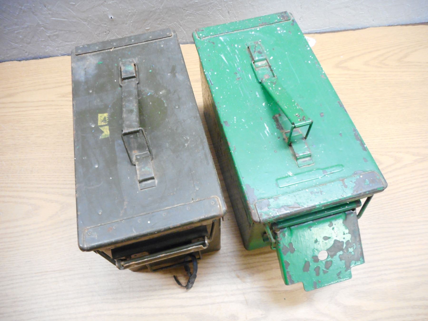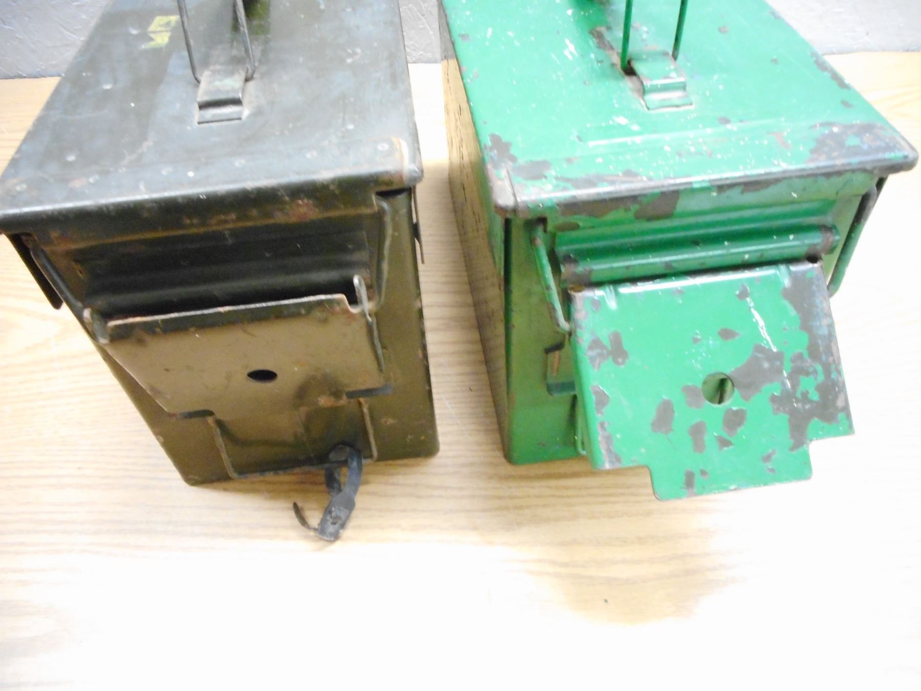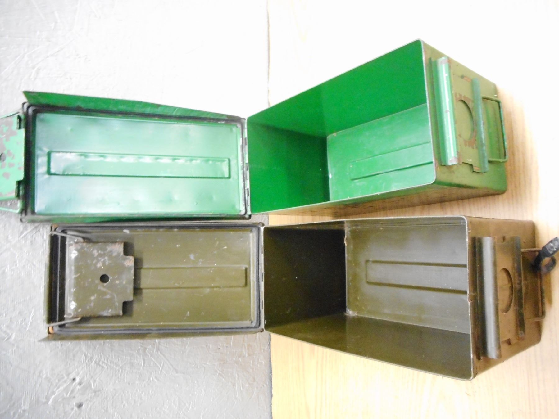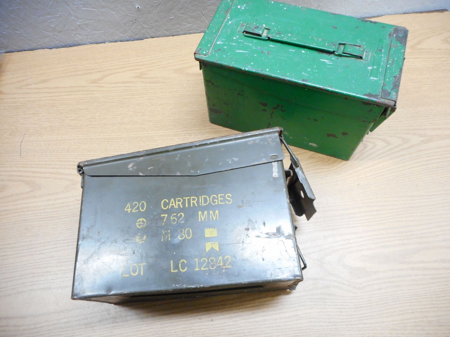 AMMO TINS , 11 X 7.5 X 5.5", (1) GREEN COATED, (1) MARKED 420 CARTRIDGES 7.62MM, LOT OF 2