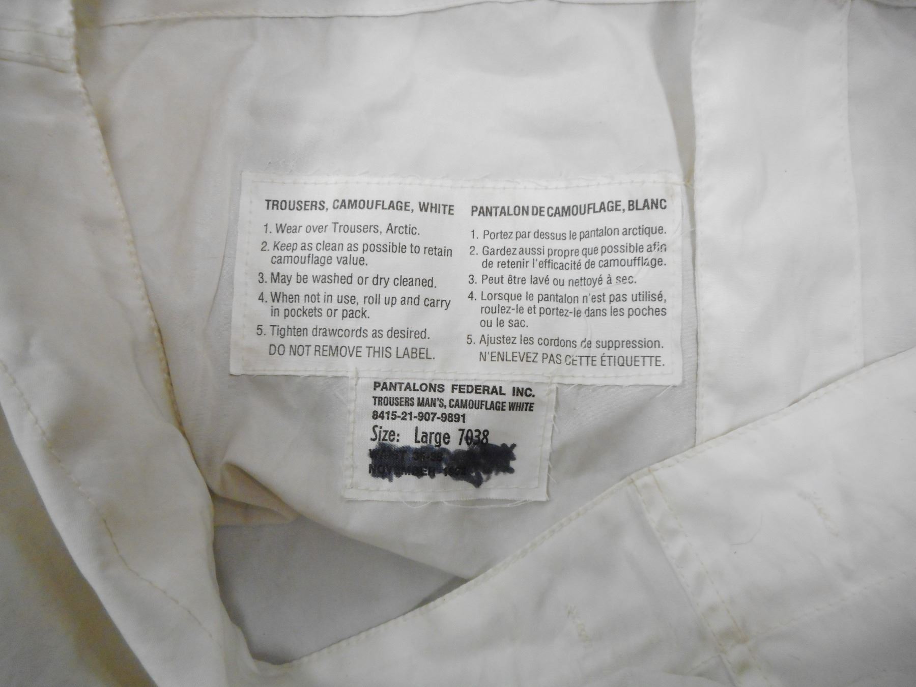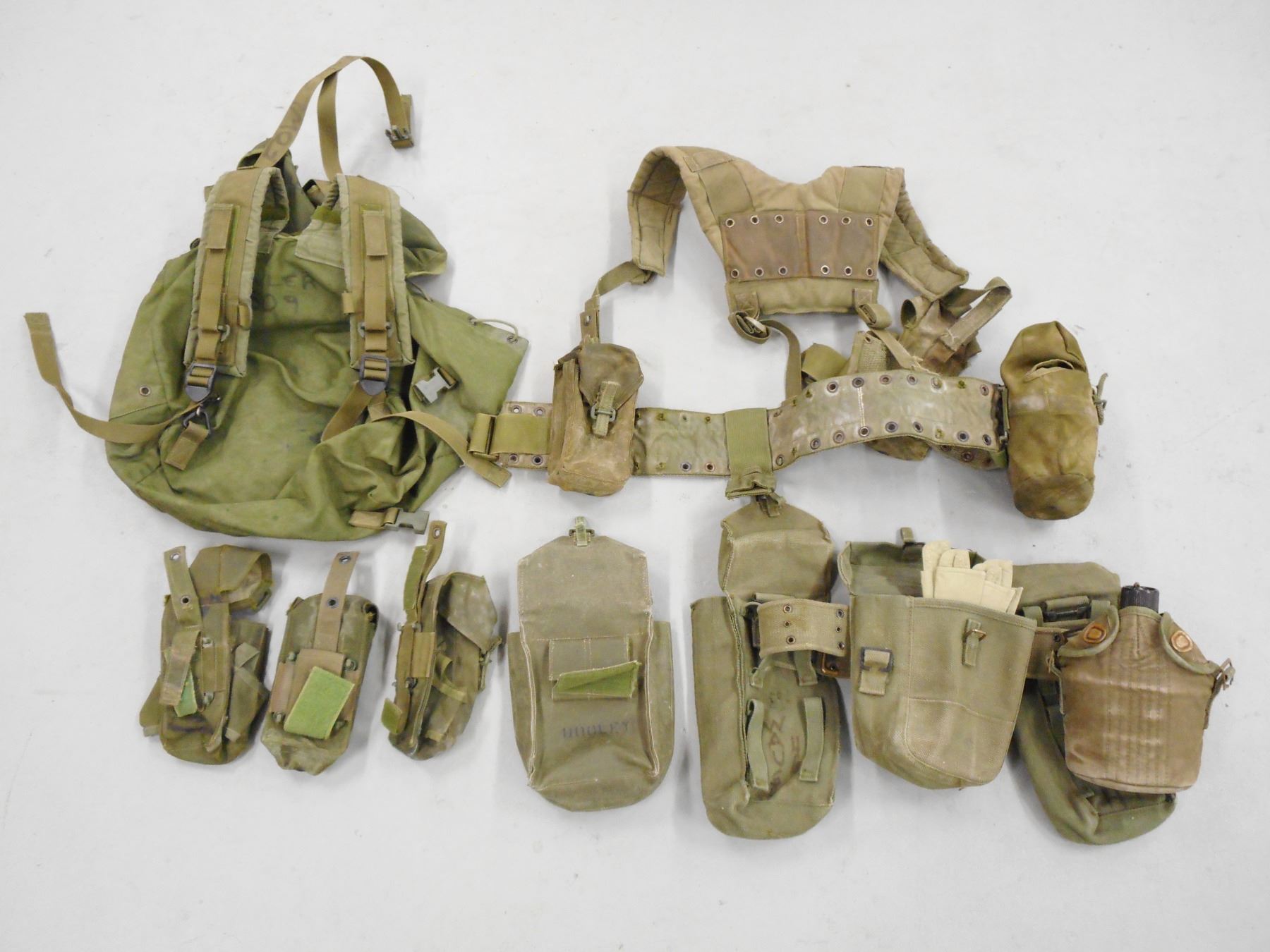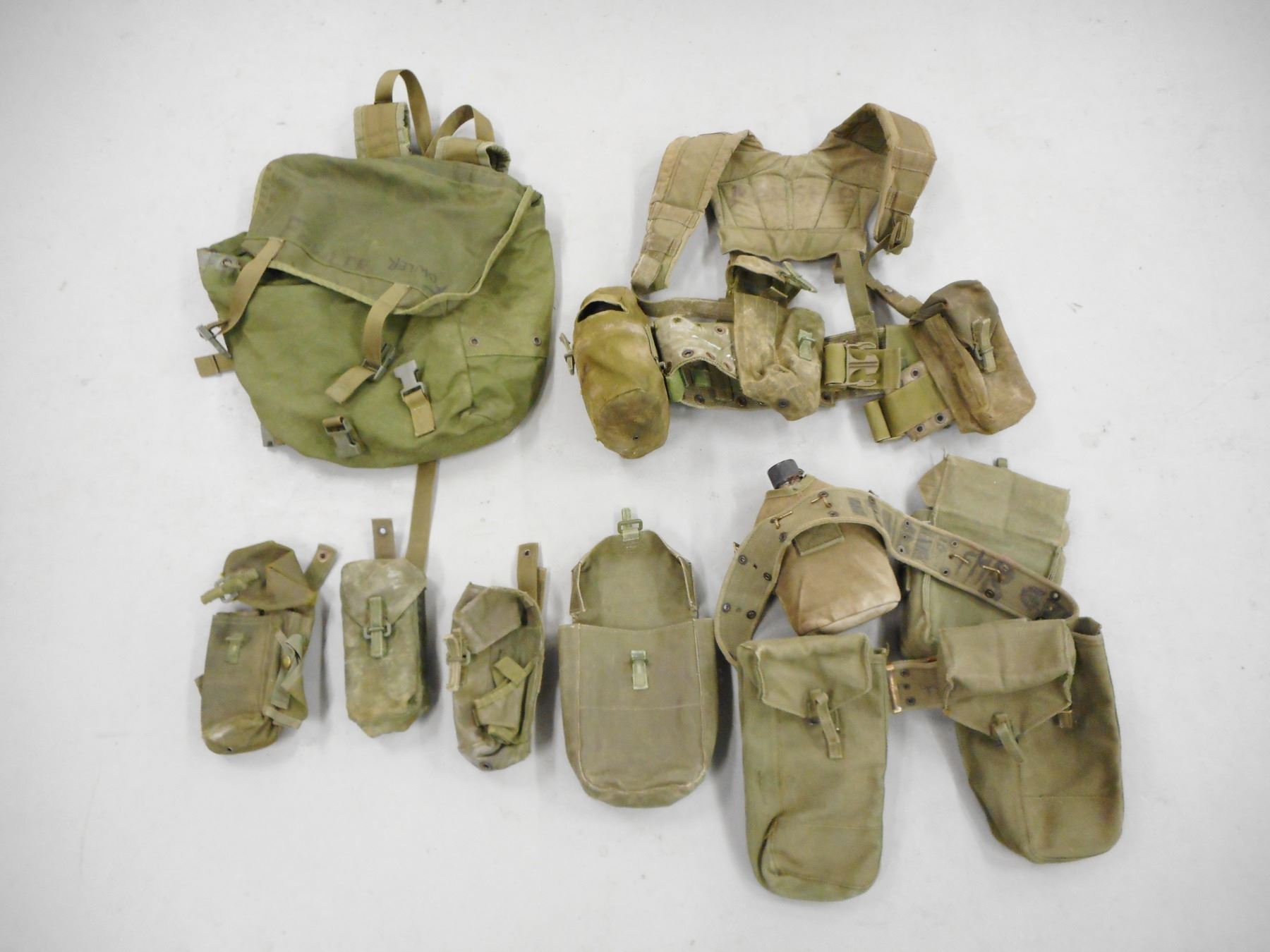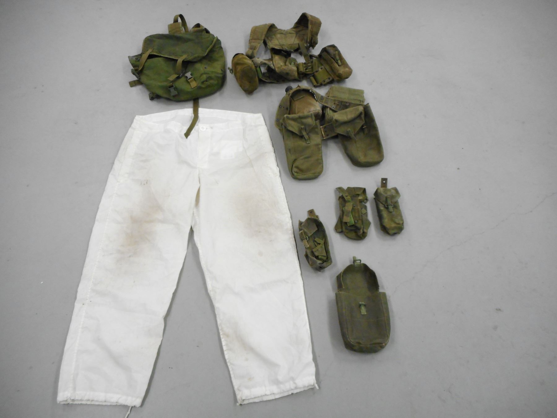 ASSORTED GREEN WEBBING & CAMO SNOW TROUSERS , INCLUDES VEST, BELTS, BACKPACK, ASSORTED POUCHES ALL POST WAR DATED, (1) WEAR OVER TROUSERS, ARCTIC