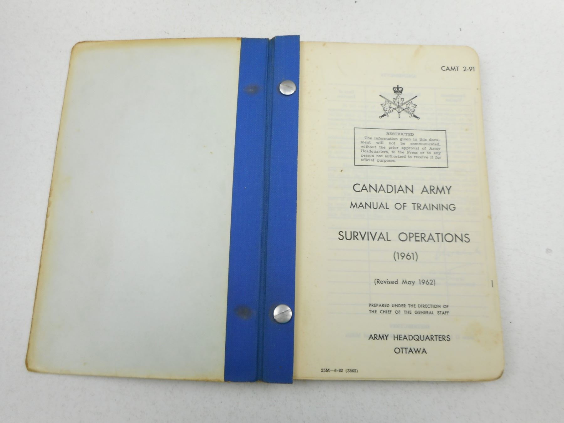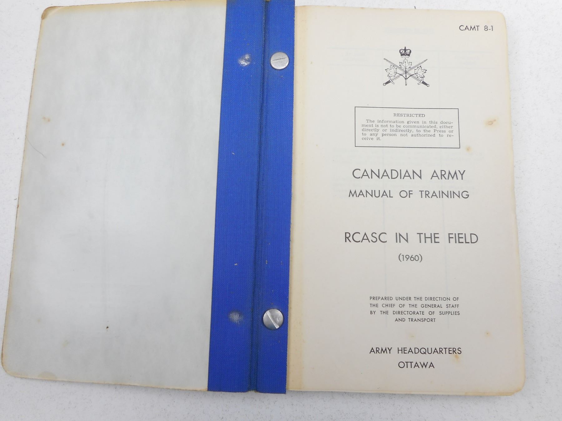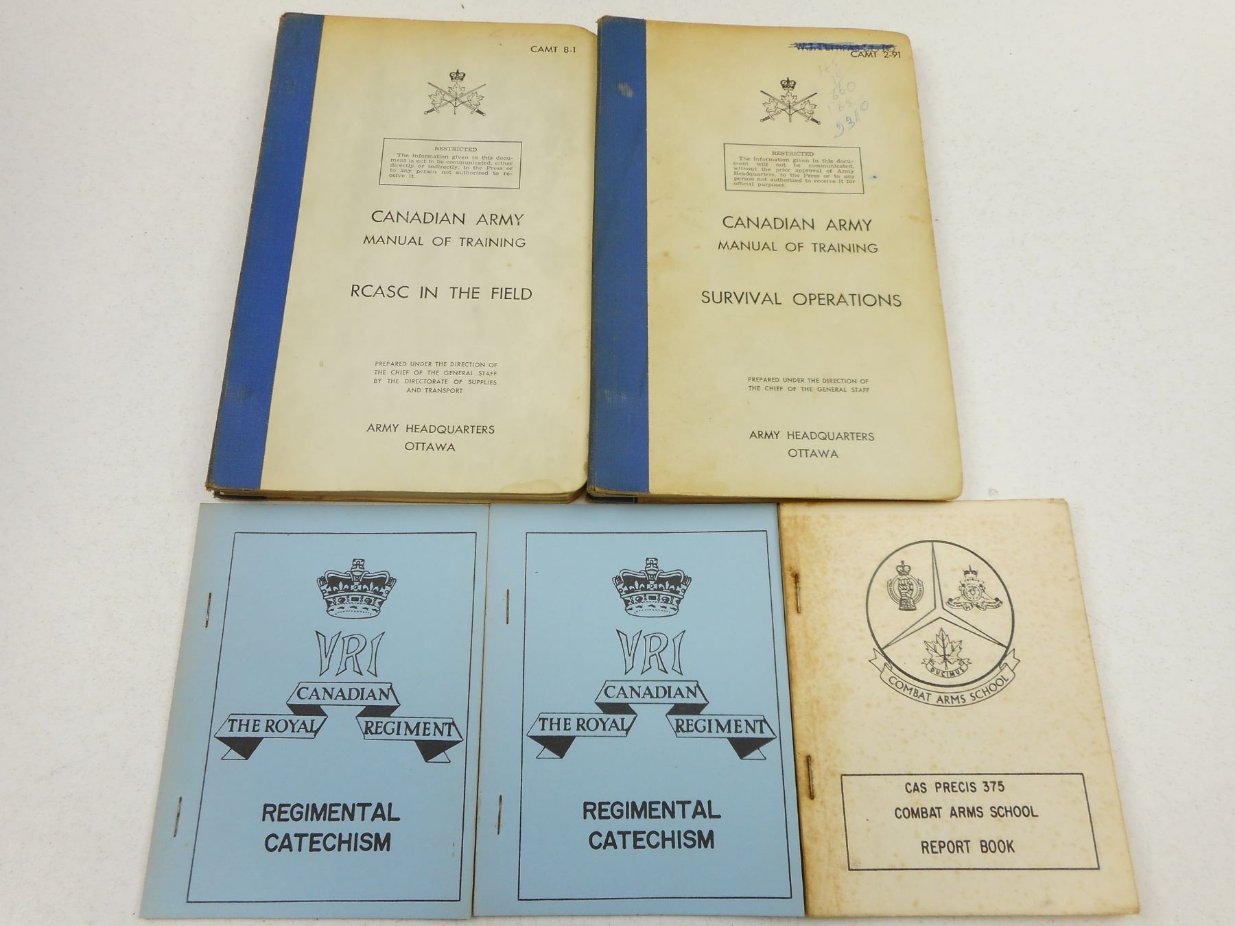 ASSORTED CANANDIAN ARMY TRAINING BOOKS/MANUALS , (1) MANUAL OF TRAINING SURVIVAL OPERATIONS, (1) MANUAL OF TRAINING RCASC IN THE FIELD, (1) COMBAT ARMS SCHOOL REPORT BOOK, (2) REGIMENTAL CATECHISM, LOT OF 5