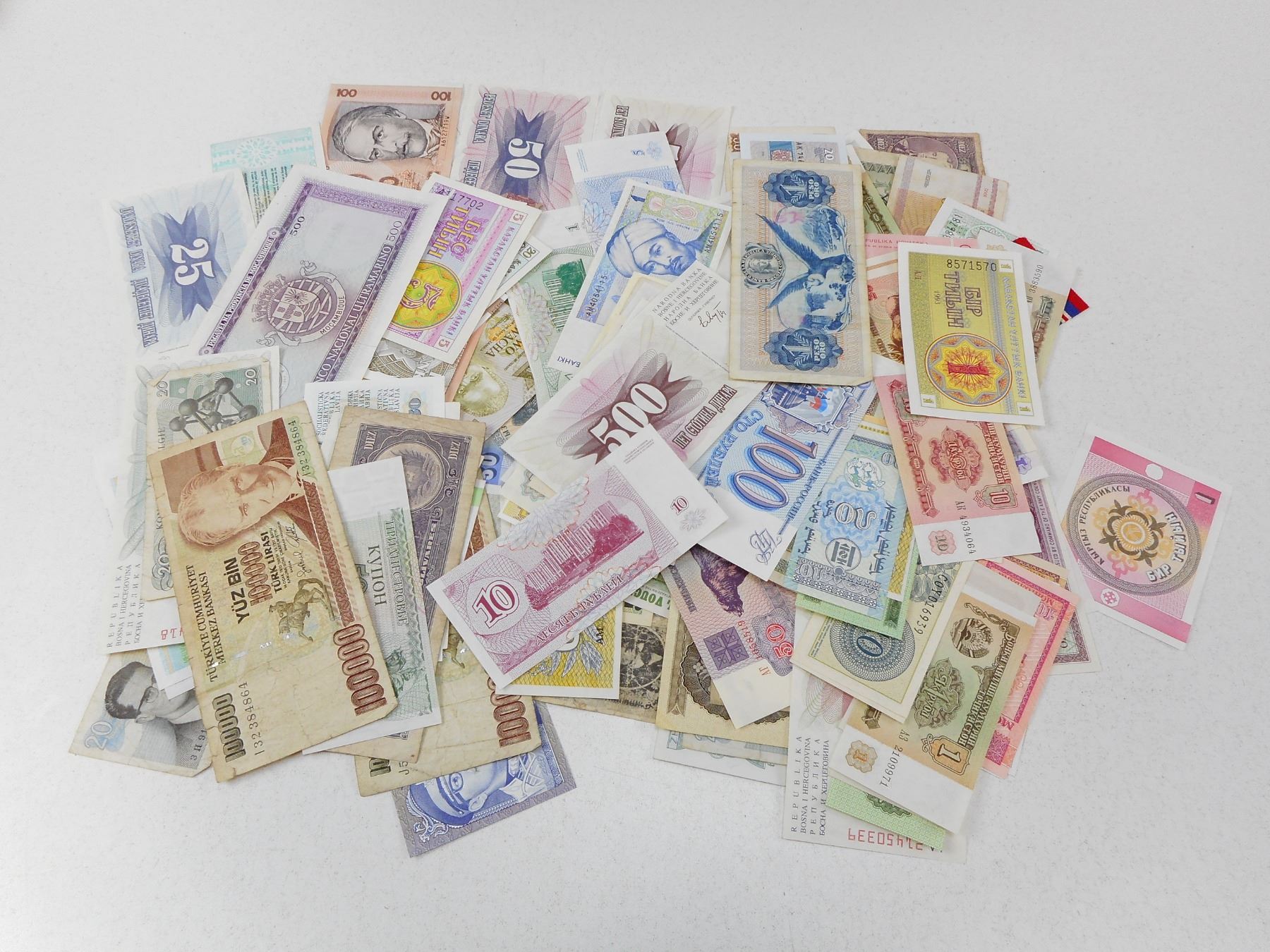 ASSORTED INTERNATIONAL COINS AND BANK NOTES , ASSORTED DATES, COUNTRIES INCLUDE: BELGIUM, PERU, VENEZUELA, POLAND, BOSNIA/HERCEGOVINA, TURKEY, UGANDA, BELIZE, SEE PHOTO