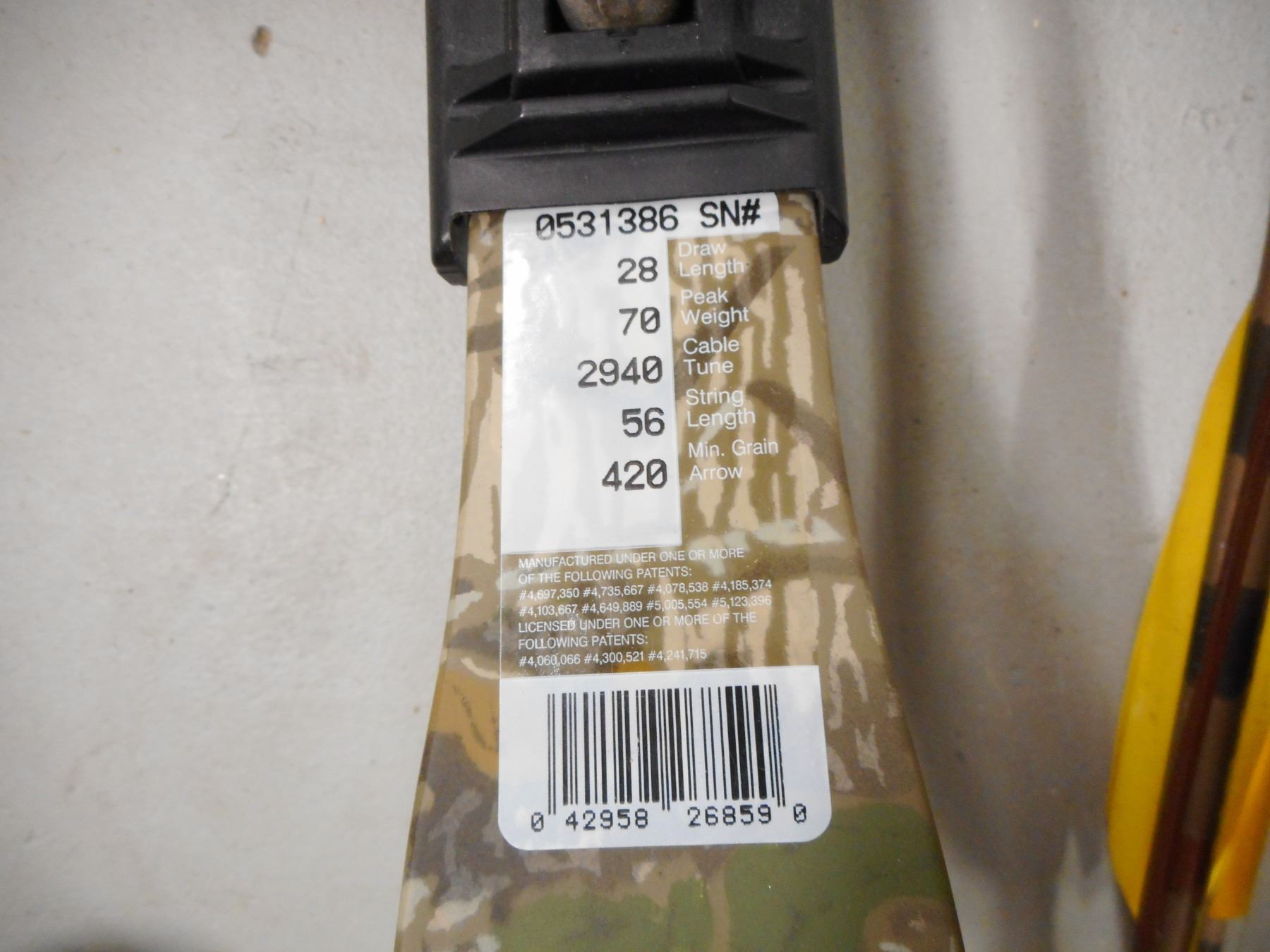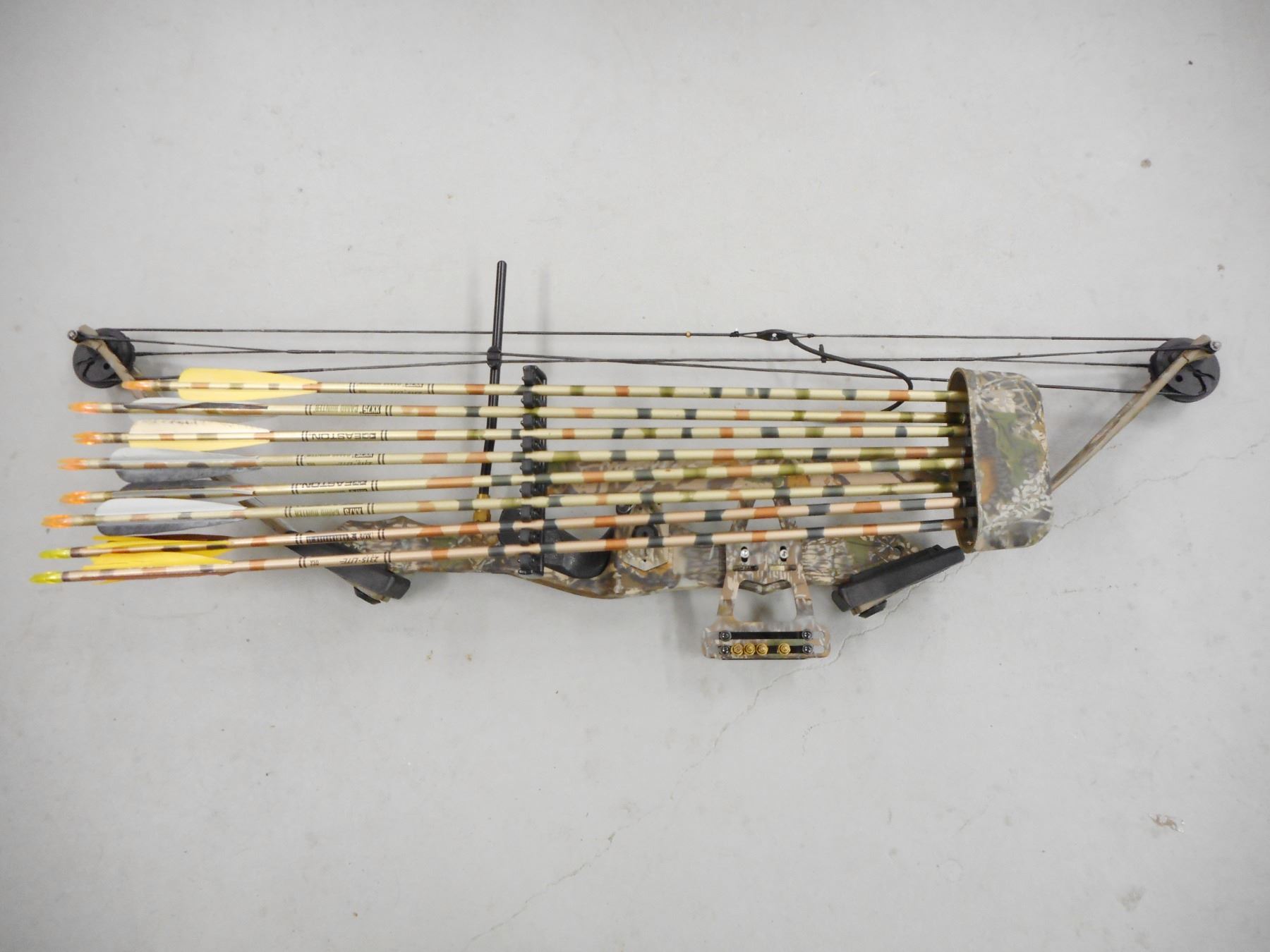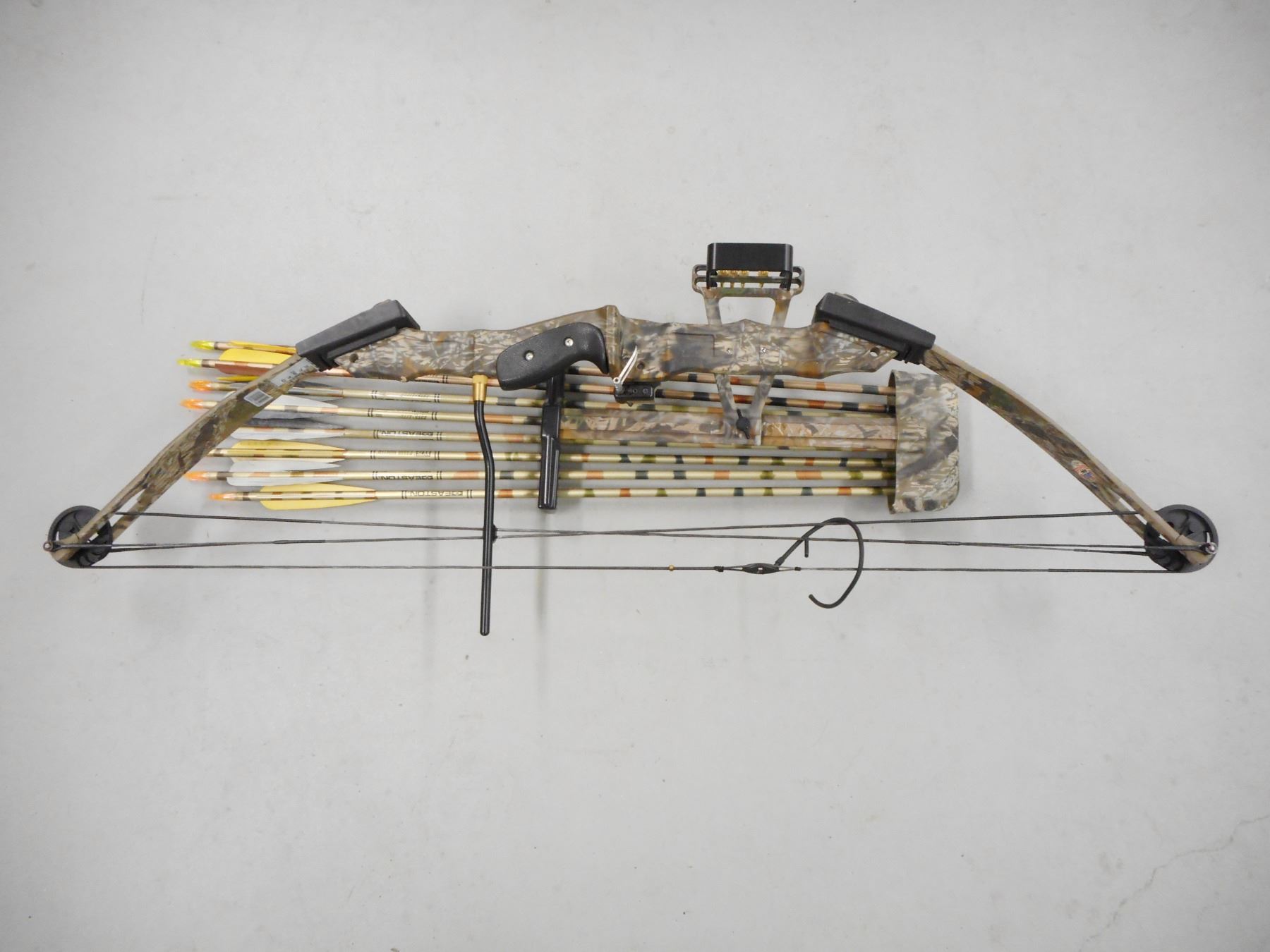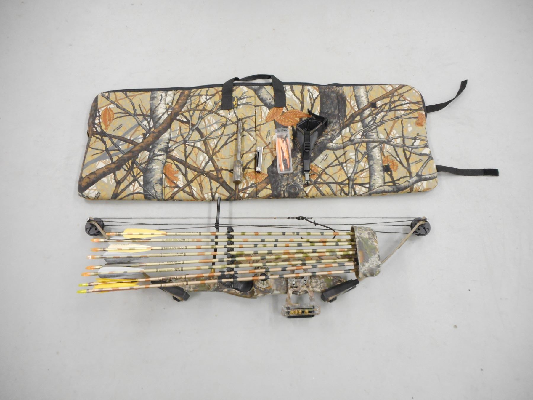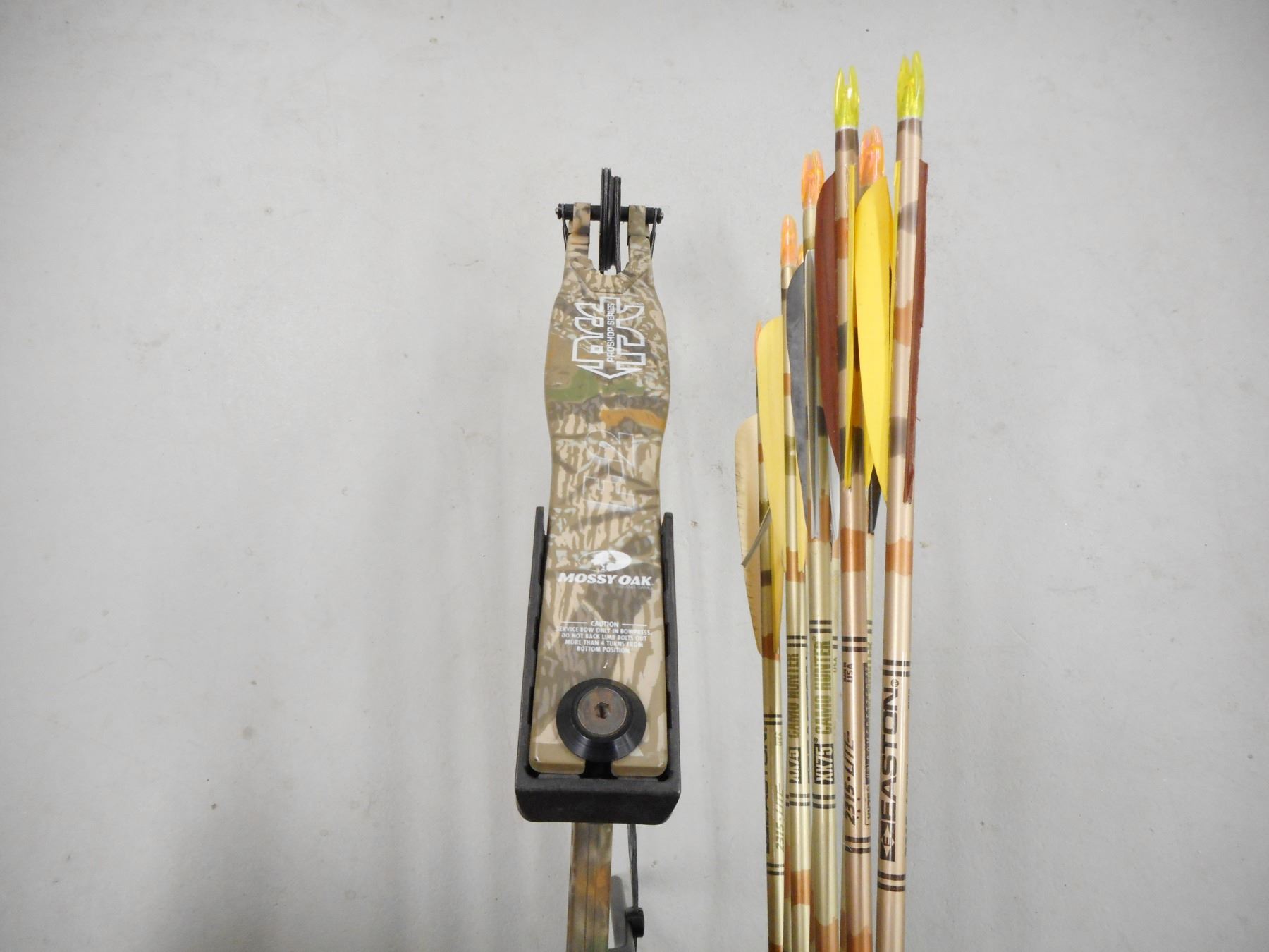 PSC PROSHOP SERIES COMPOUND BOW WITH SOFT CASE , F-2 IN MOSSY OAK CAMO 28" DRAW LENGTH, 70 LB PEAK WEIGHT, INCLUDES QUIVER WITH 8 ARROWS, WEIGHT, PULLING AID, ALLEN KEY SET, FLETCHINGS, & CAMO PADDED SOFT CASE