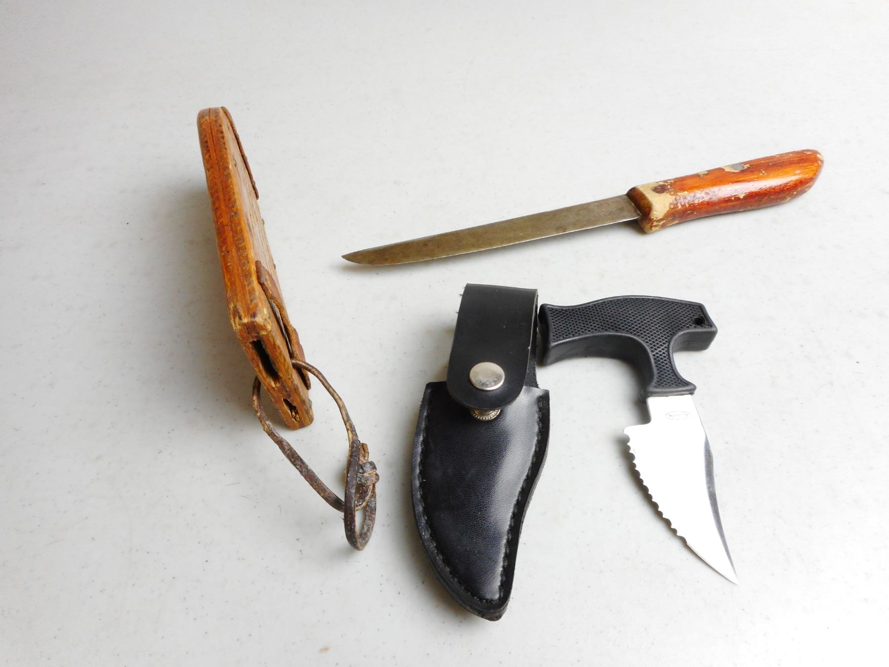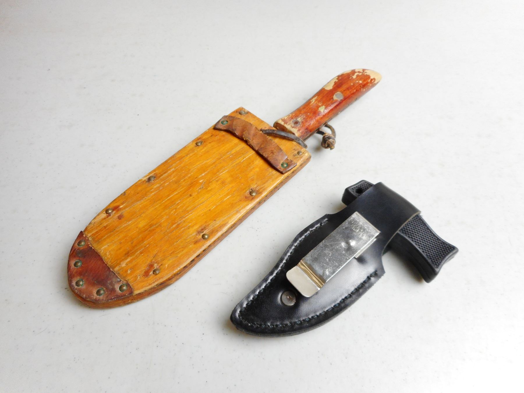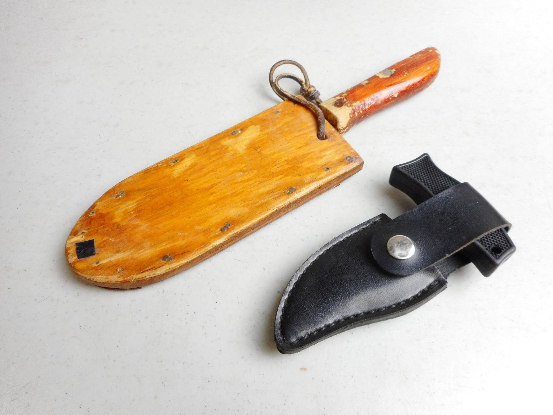 FIXED BLADE KNIVES WITH SHEATHS , (1) WOODEN HANDLE & SHEATH 6" BLADE, WITH WOODEN SHEATH (1) BUSHLINE WITH SHEATH, LOT OF 2
