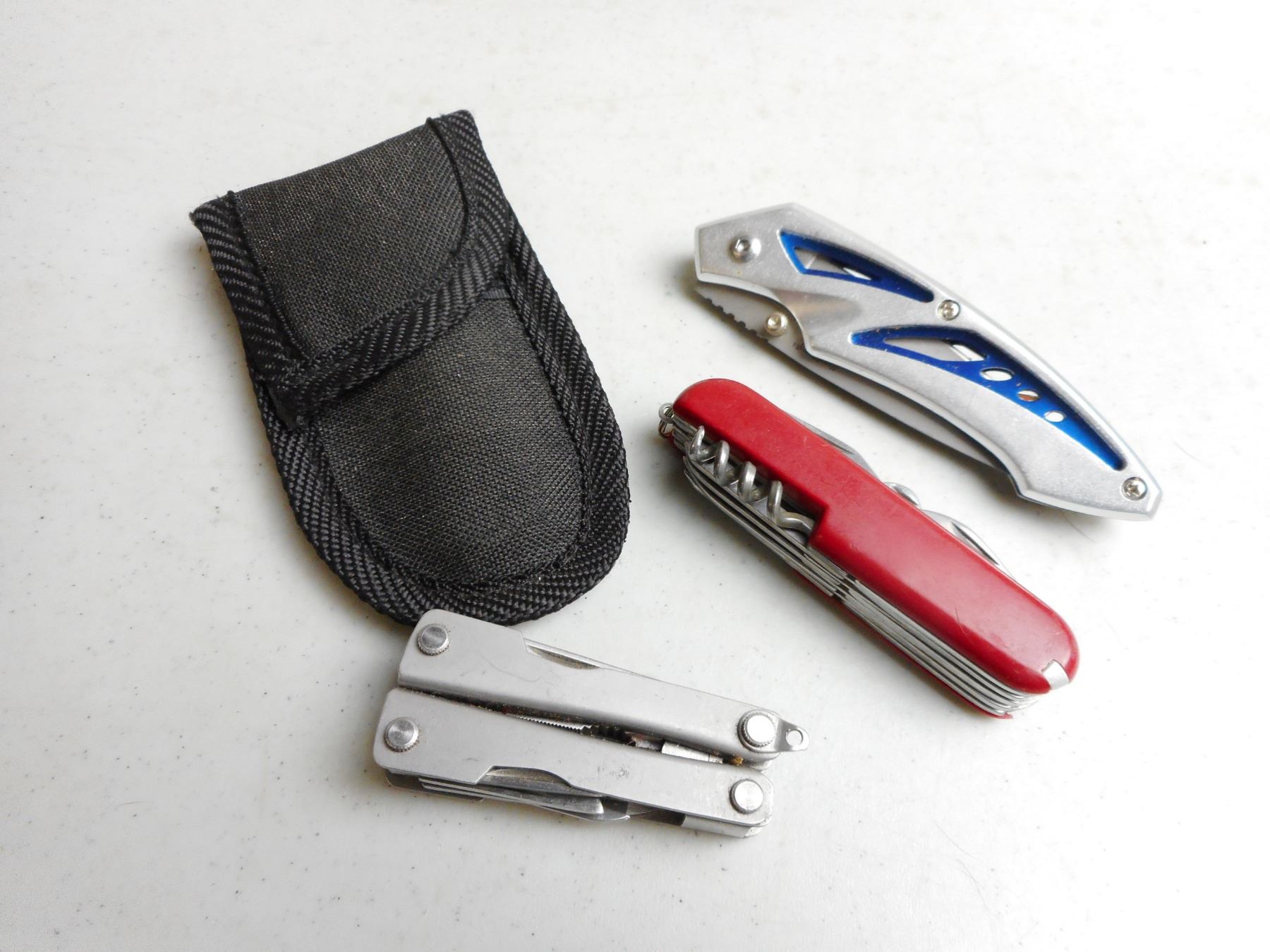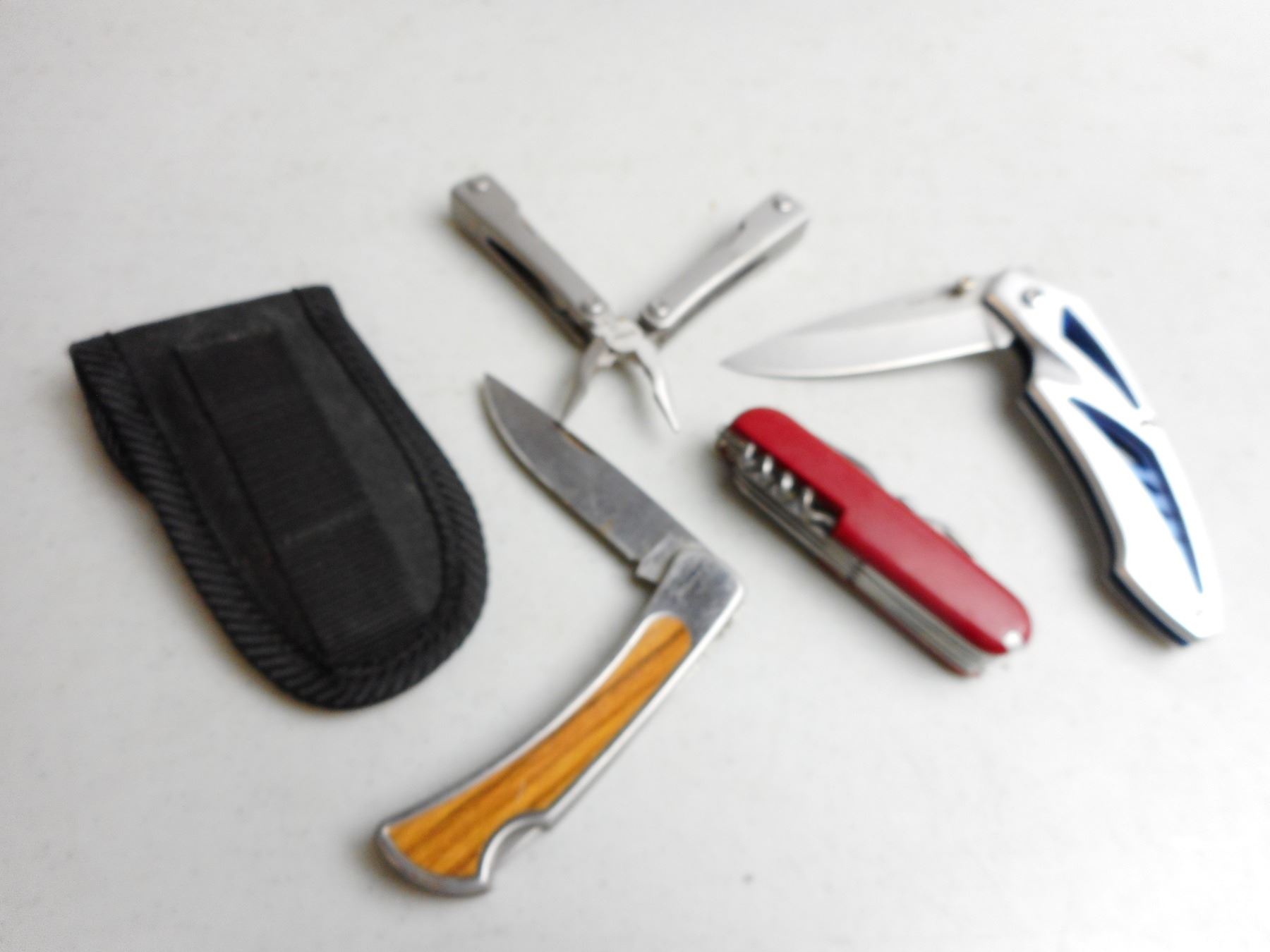 ASSORTED POCKET KNIVES , (2) SINGLE FOLDING KNIVES: (1) WITH SHEATH, (1) MULTITOOLS