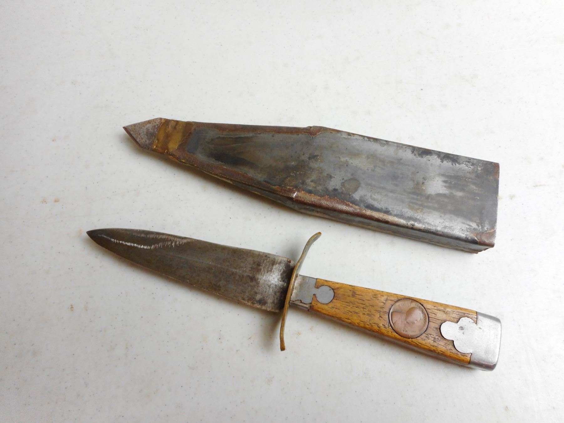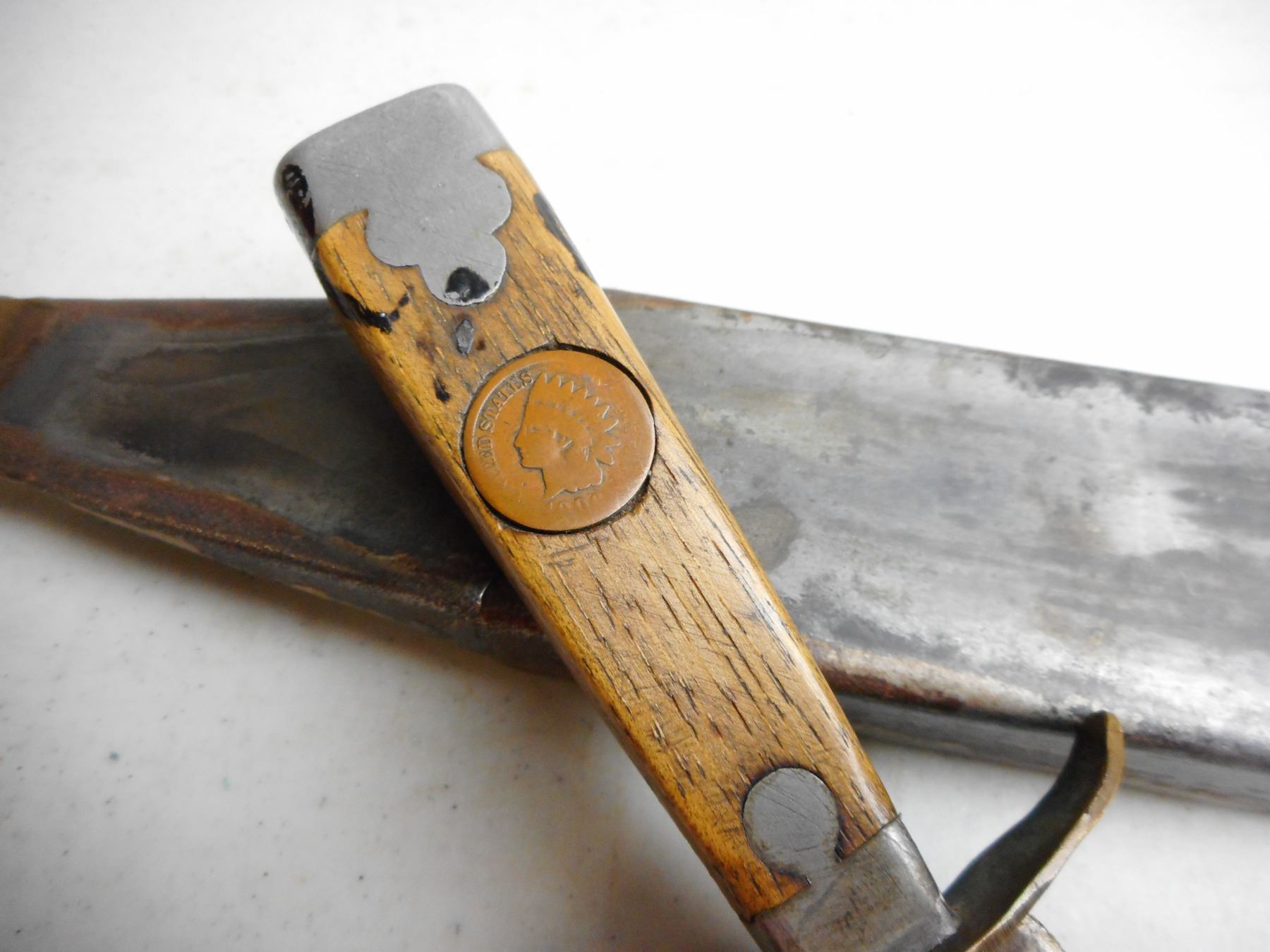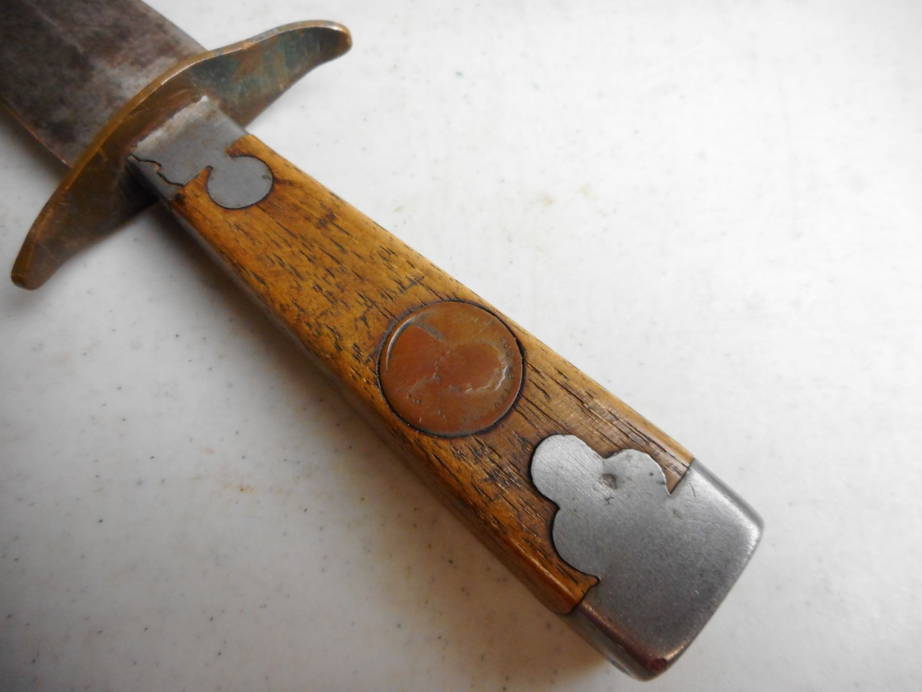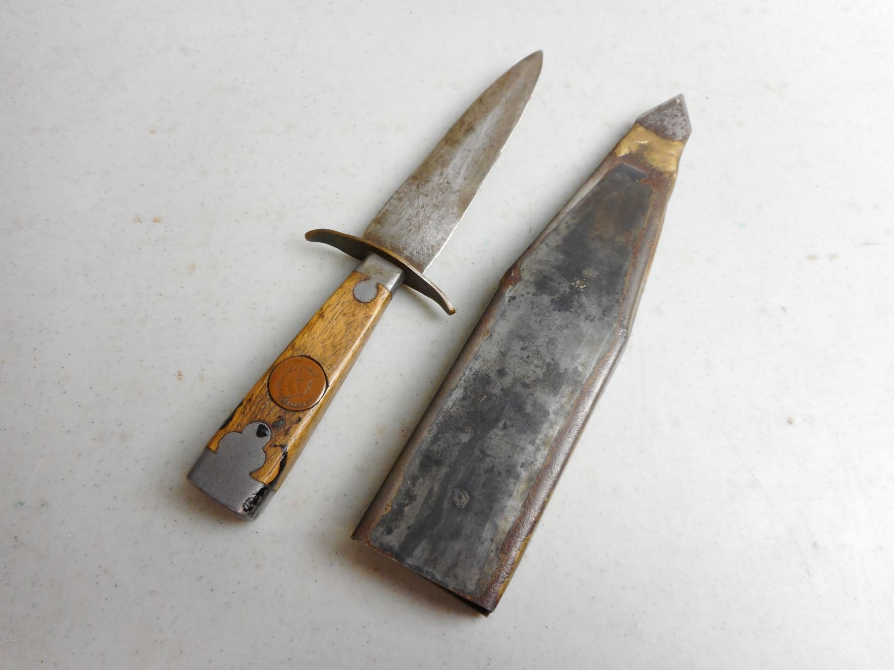 BELT KNIFE , ROUGHLY HEWN BELT KNIFE WITH U.S. PENNY INSERT IN HANDLE & METAL SHEATH