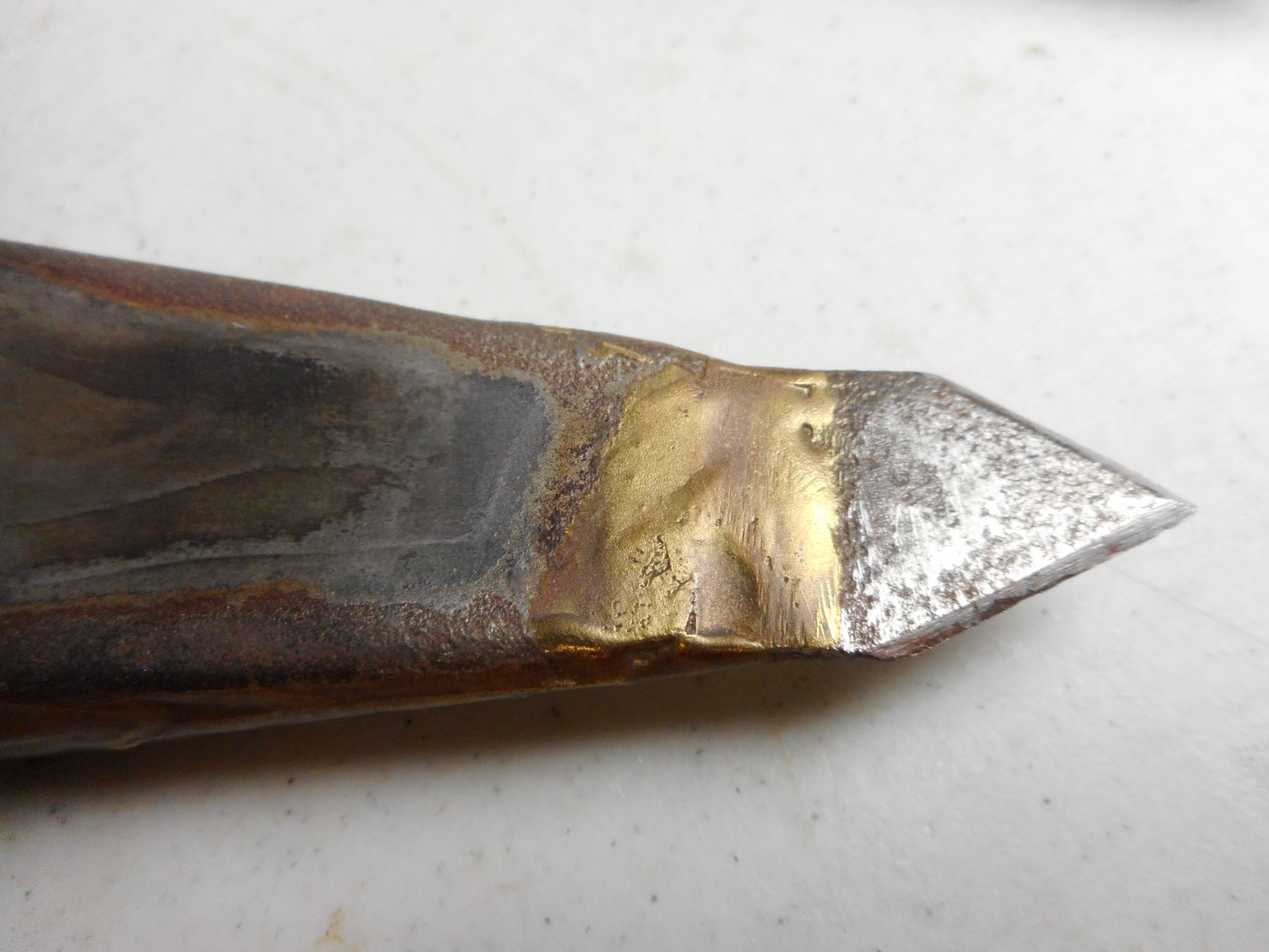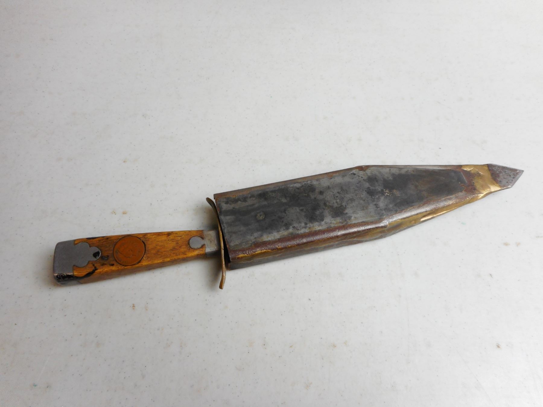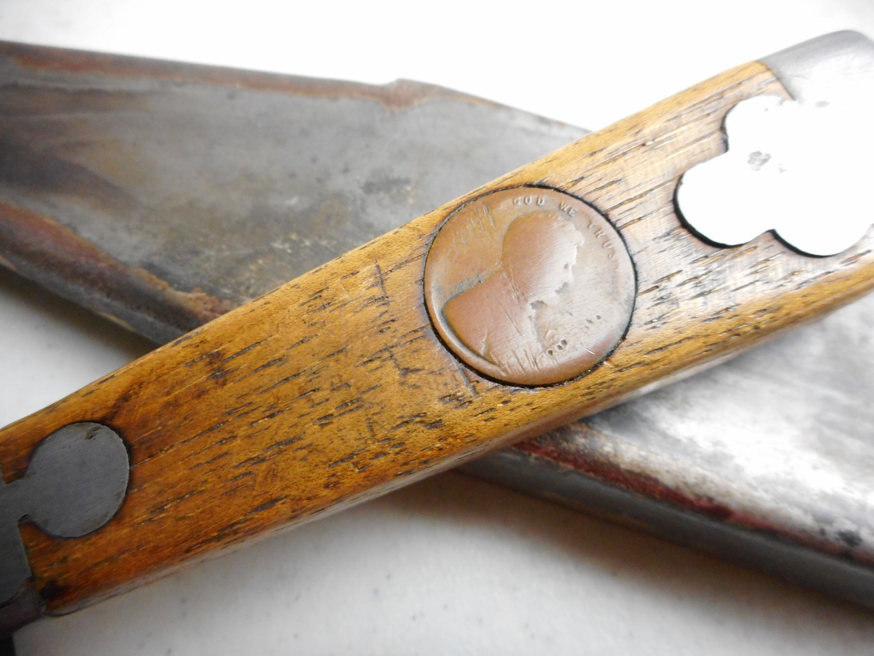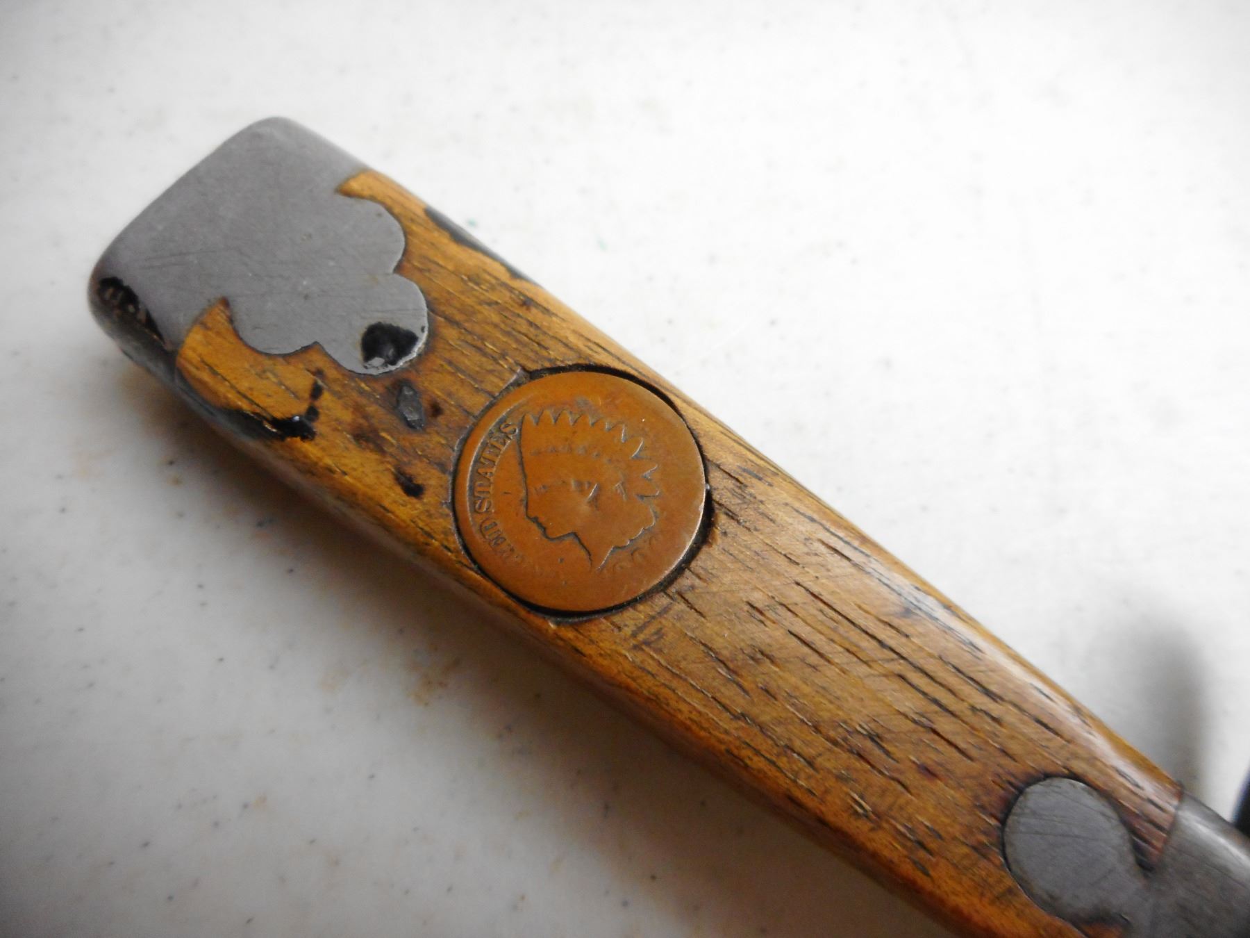 BELT KNIFE , ROUGHLY HEWN BELT KNIFE WITH U.S. PENNY INSERT IN HANDLE & METAL SHEATH