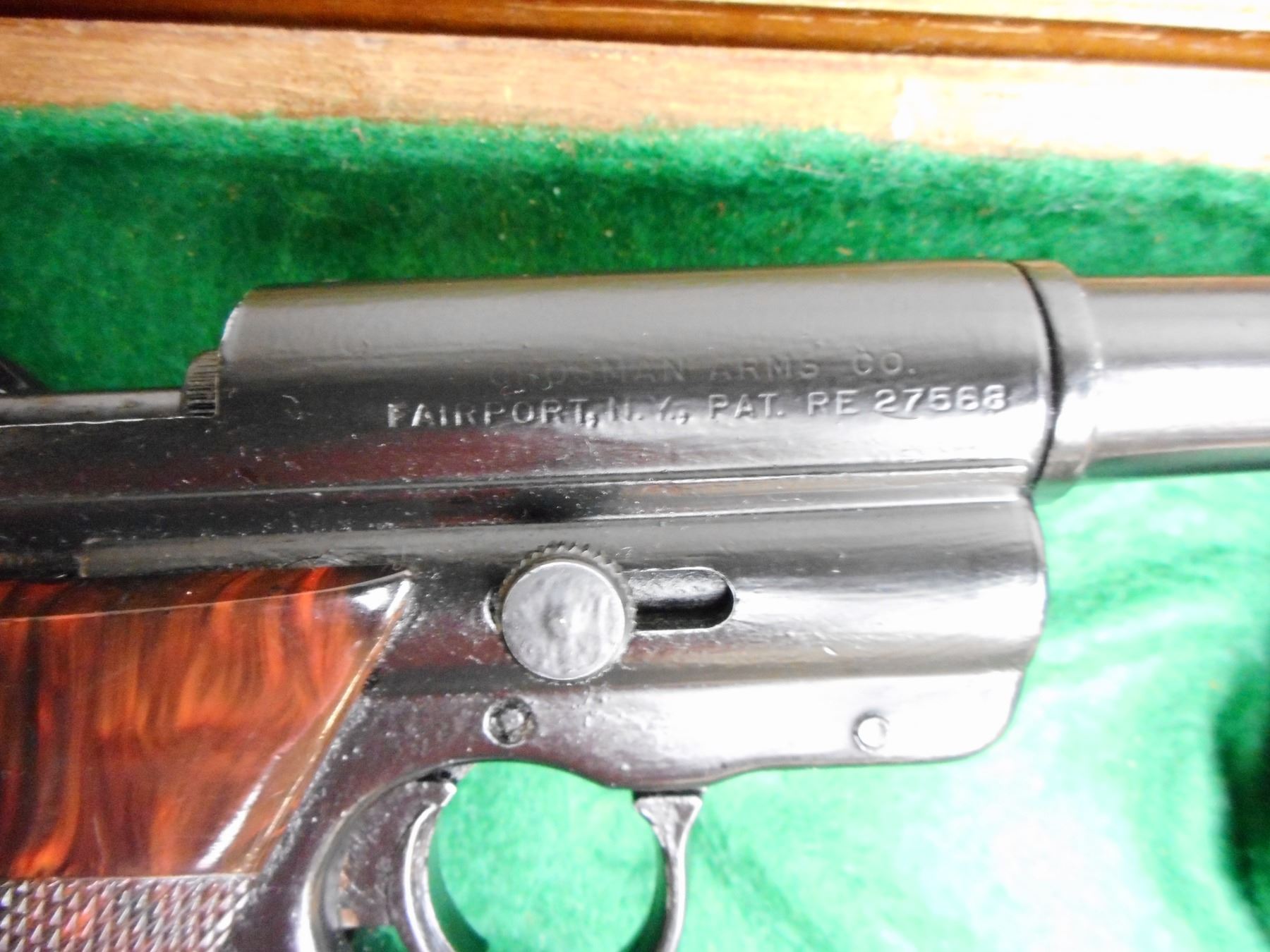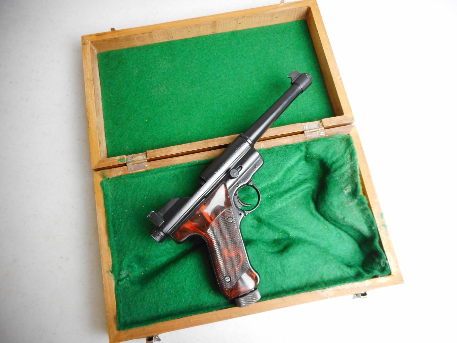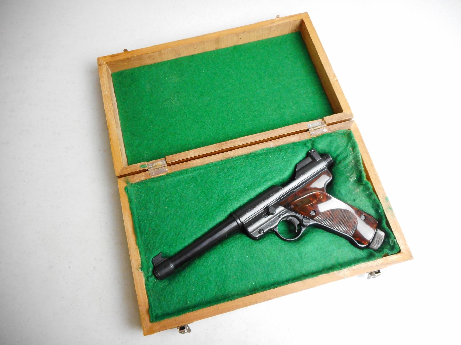 CROSMAN MKI TARGET PISTOL WITH WOODEN CASE , PADDED WOODEN CASE SIZE 13.5 X 8 X 3"