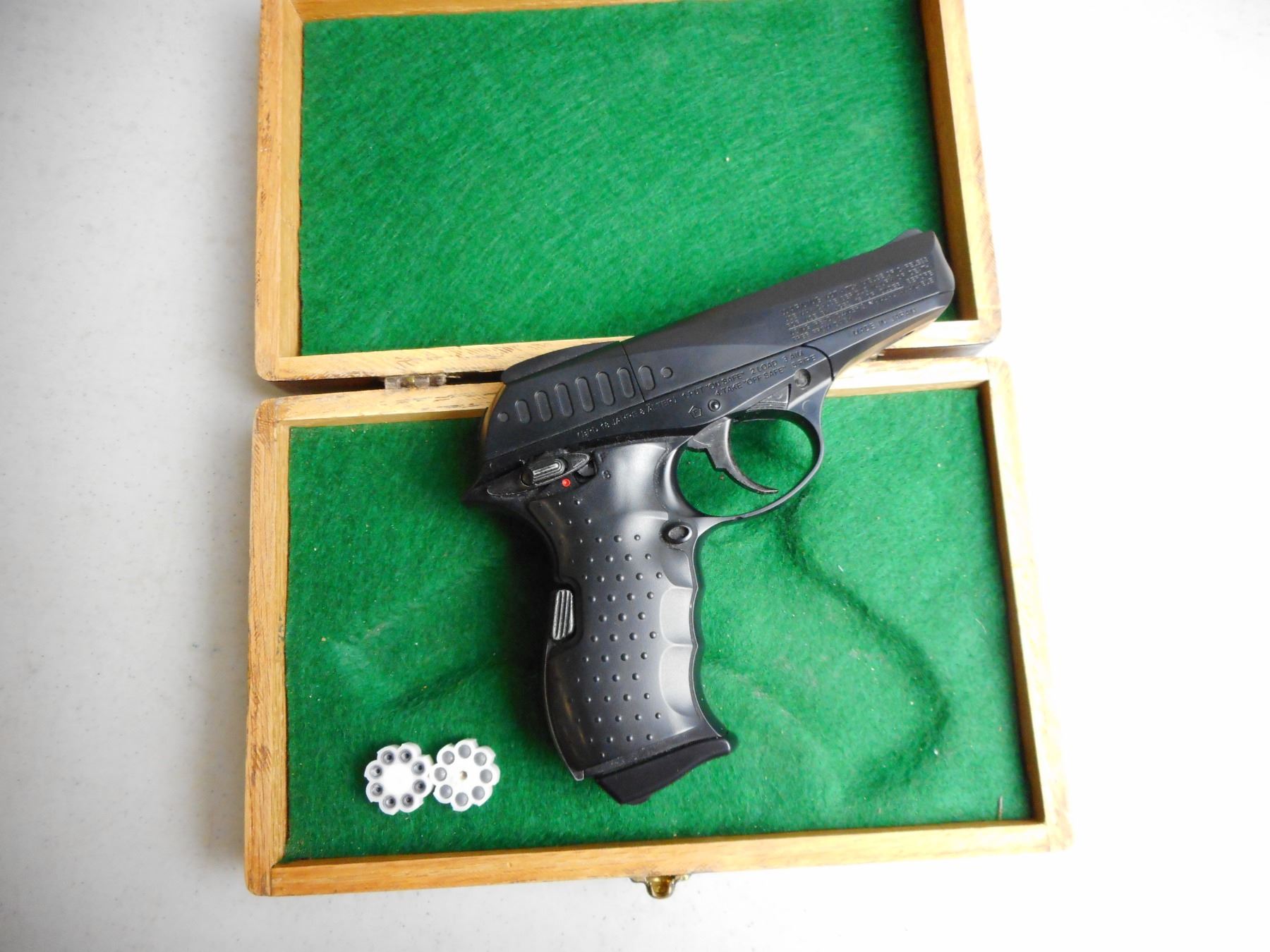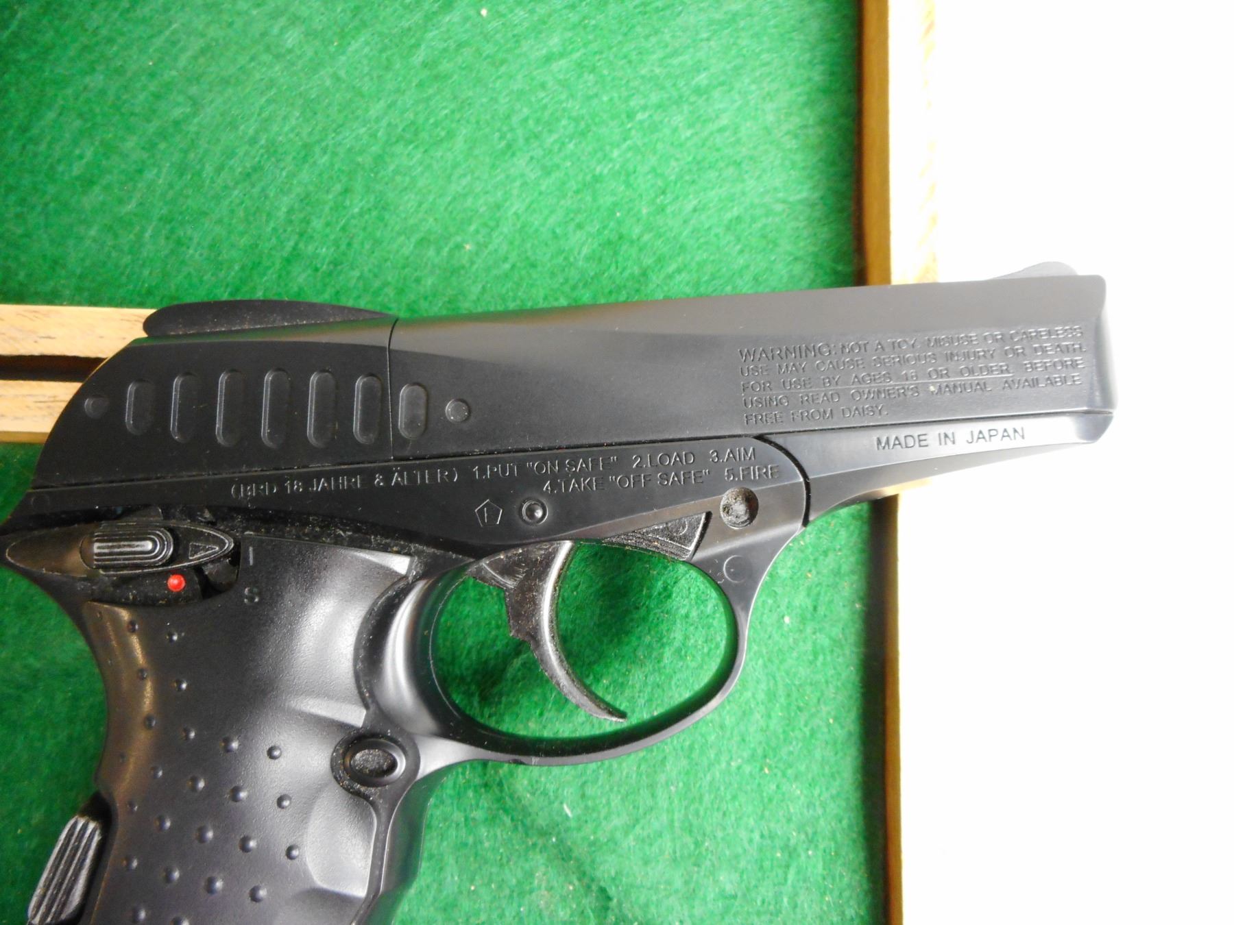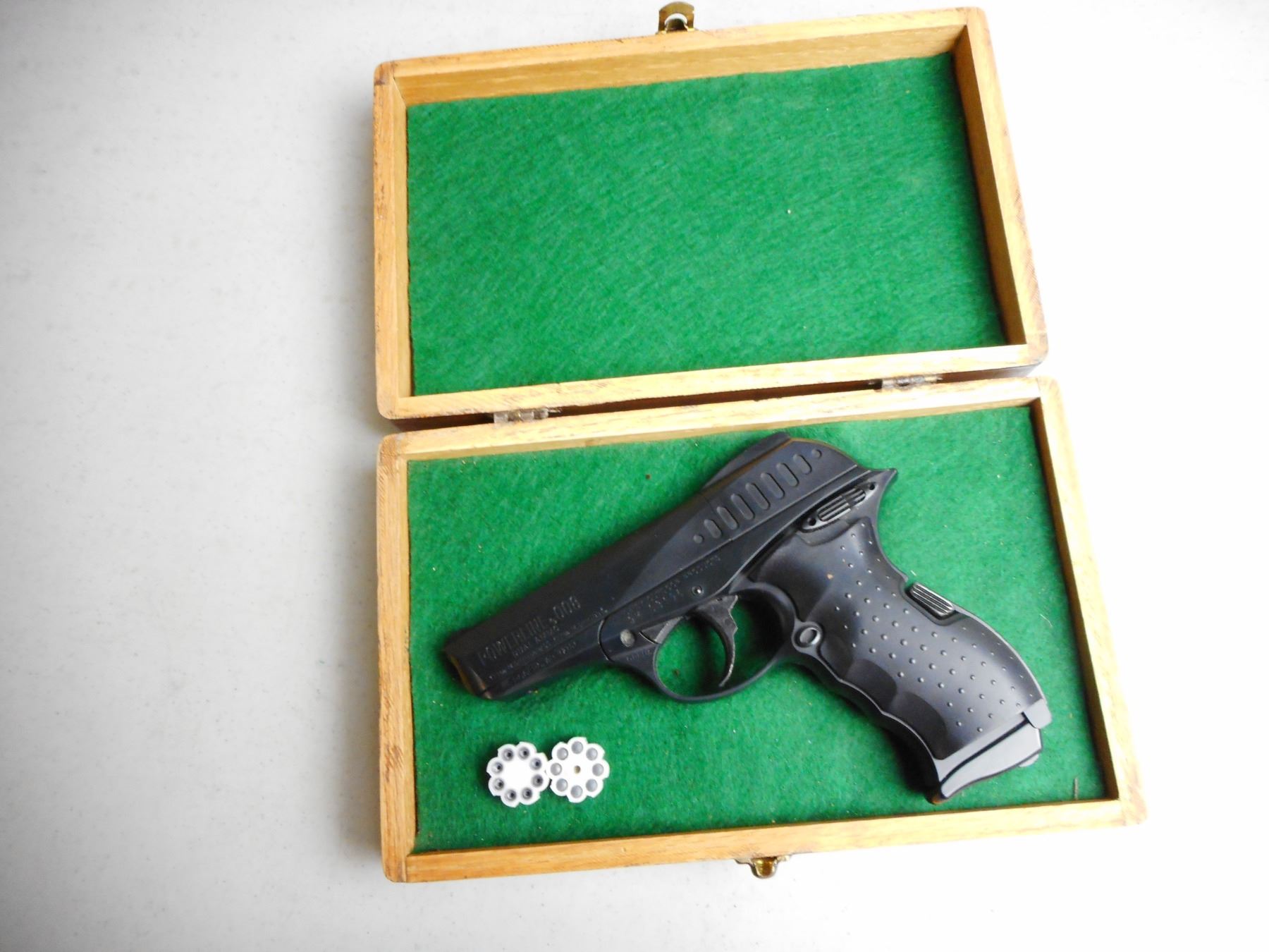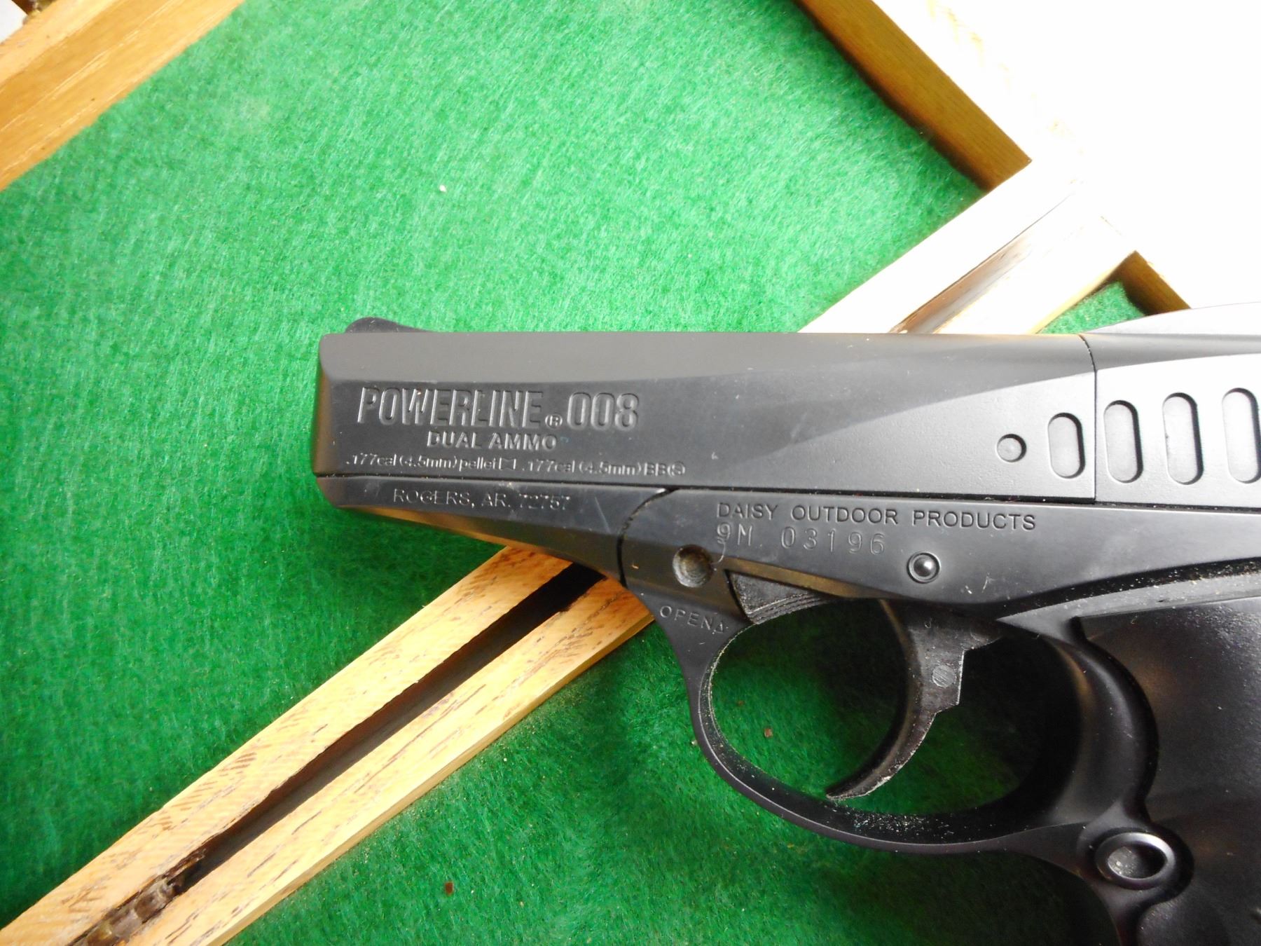 DAISY POWERLINE 008 AIR PISTOL WITH WOODEN CASE , .177CAL PELLET & BB, WITH (2) INSERTS, PADDED WOODEN CASE SIZE 10 X 6.5 X 2.5"