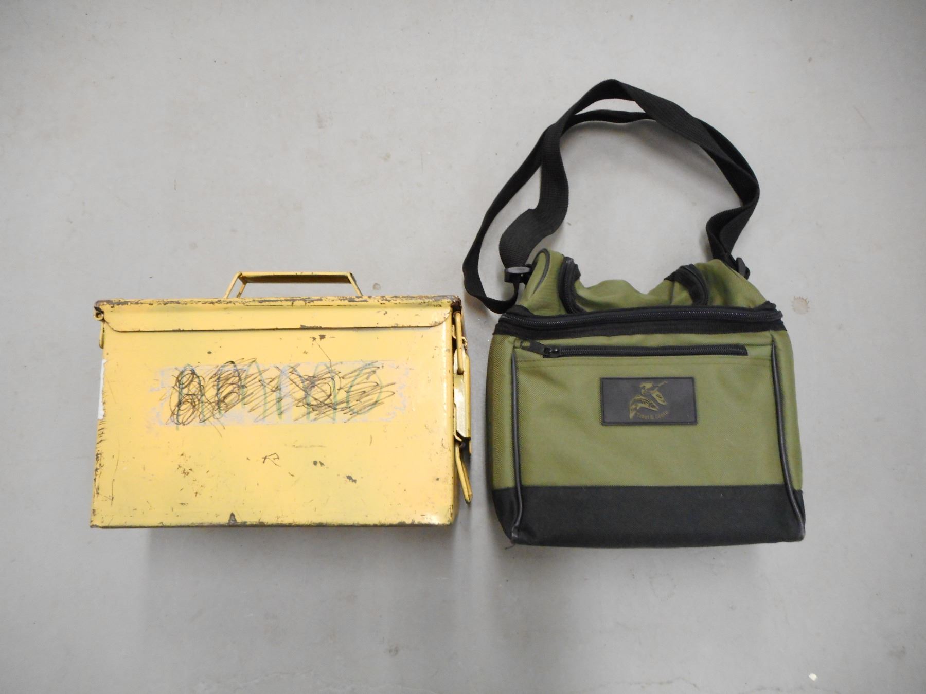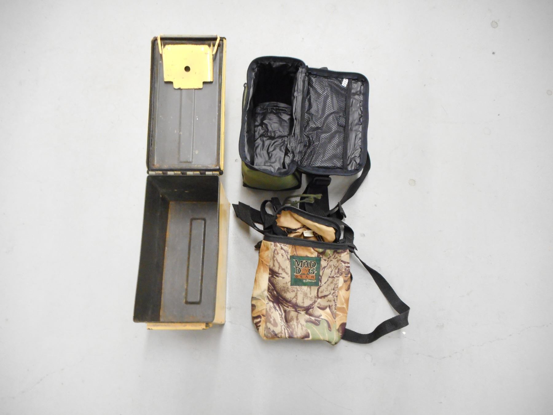 AMMO TIN & AMMO BAGS/POUCHES , (1) PAINTED YELLOW TIN SIZE 11 X 7 X 5.5" (2) ZIPPERED BAGS