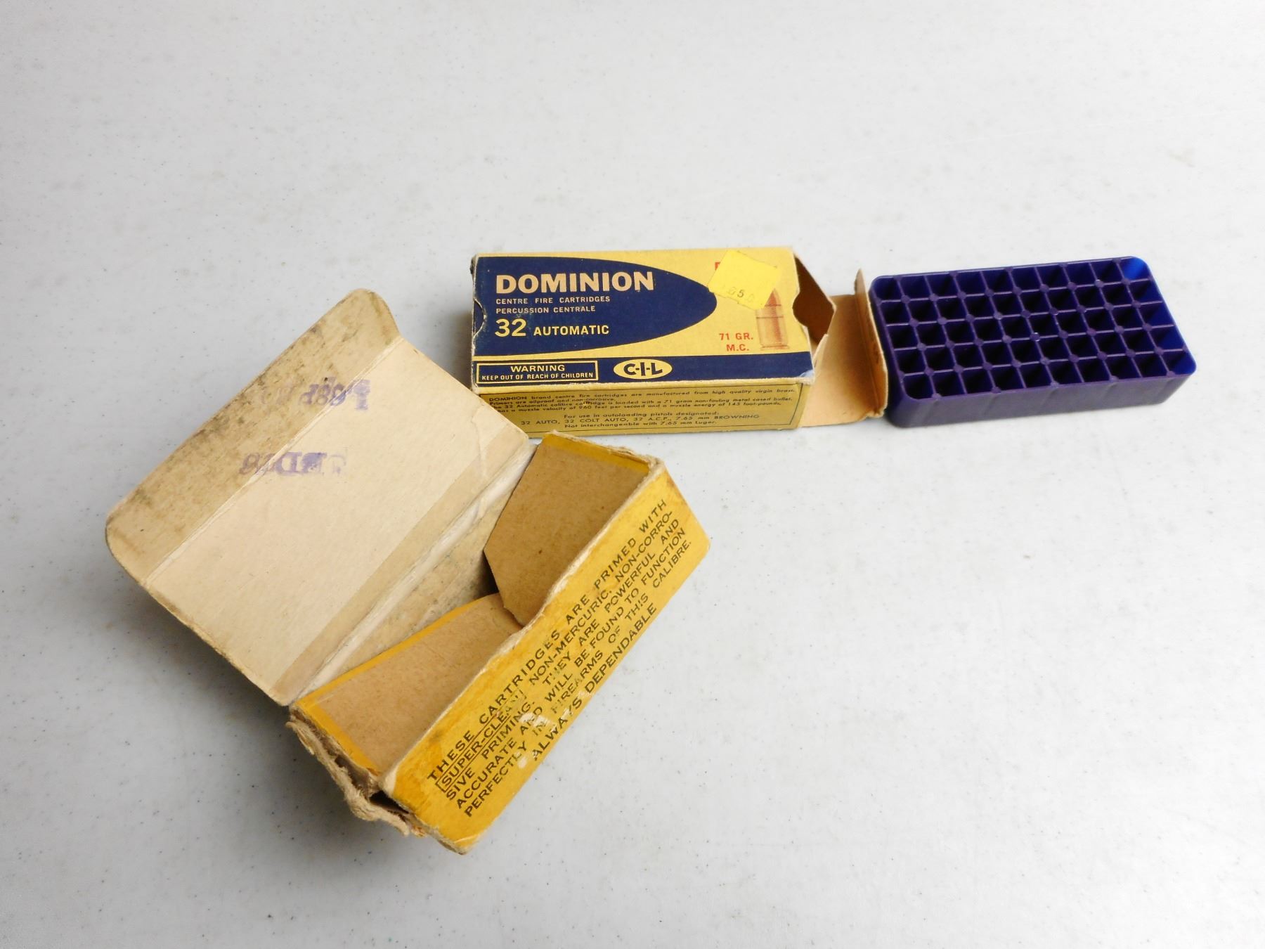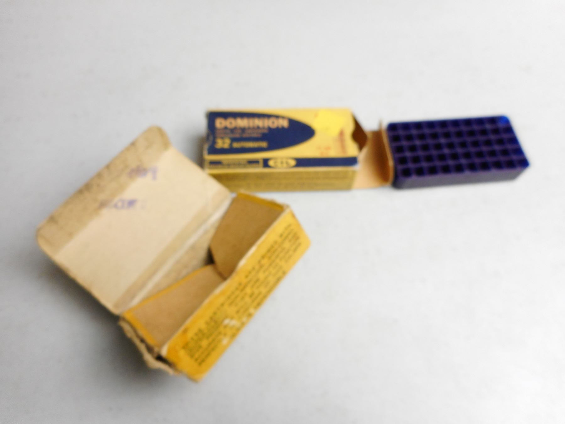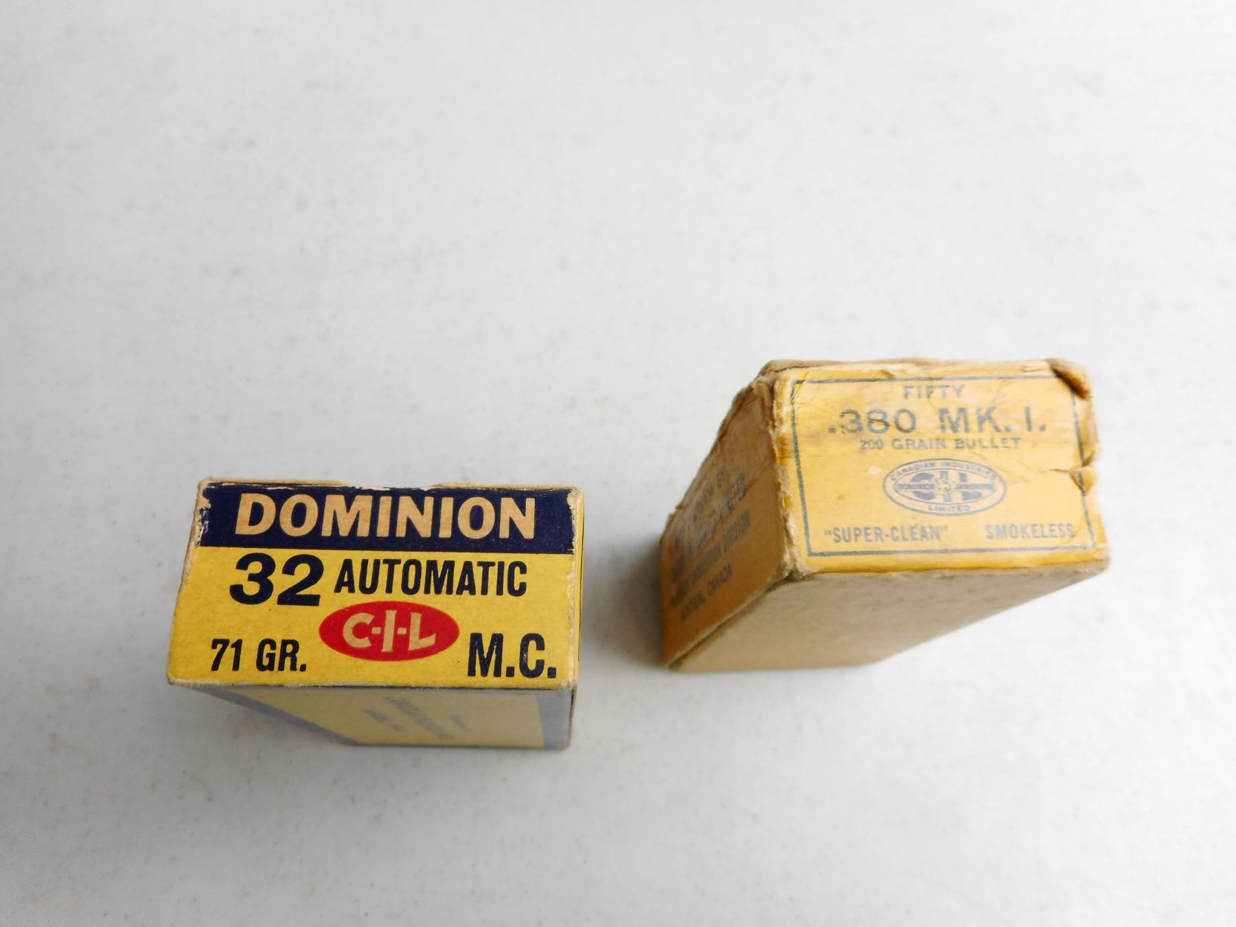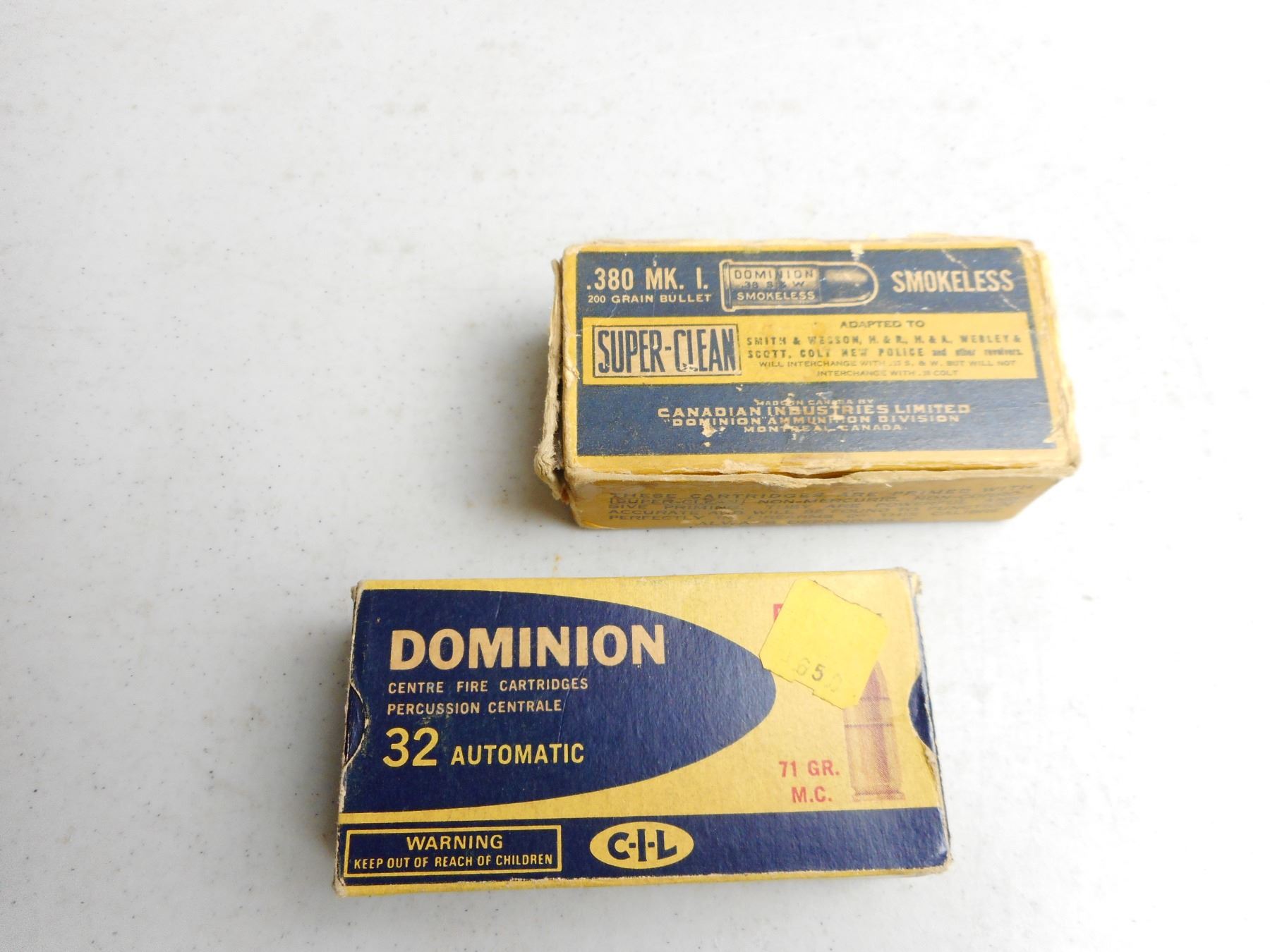 EMPTY DOMINION BOXES , (1) .380 MK 1 SMOKELESS BOX, (1) 32 AUTO BOX, LOT OF 2
