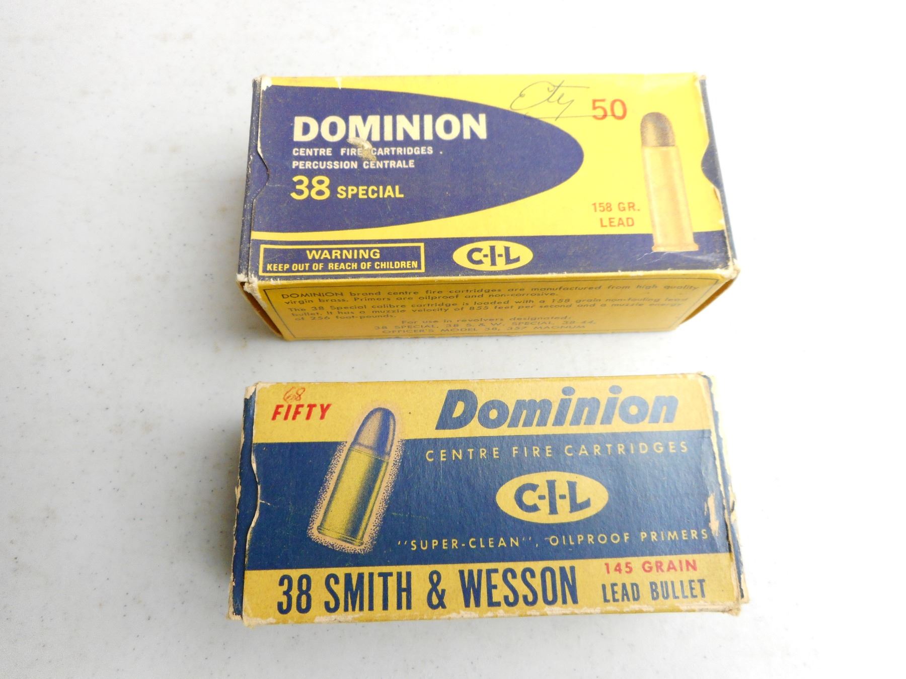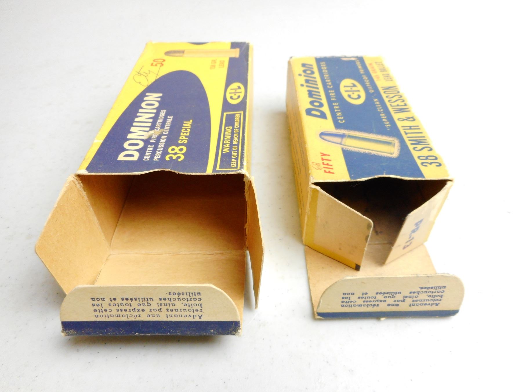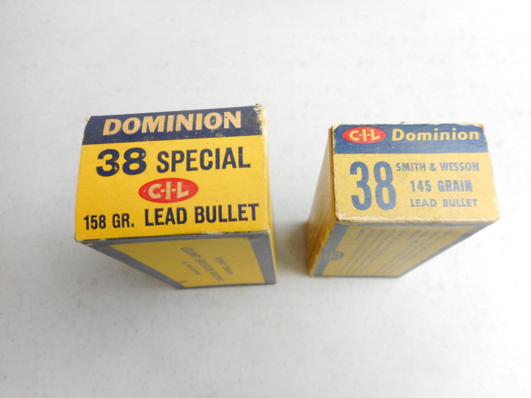 EMPTY DOMINION BOXES , (1) DOMINION 38 SPL BOX, (1) 38 S&W BOX, LOT OF 2