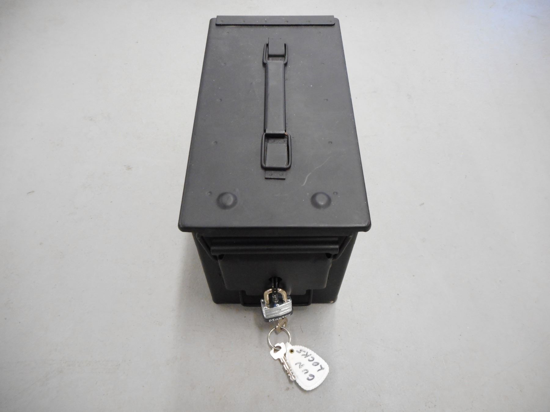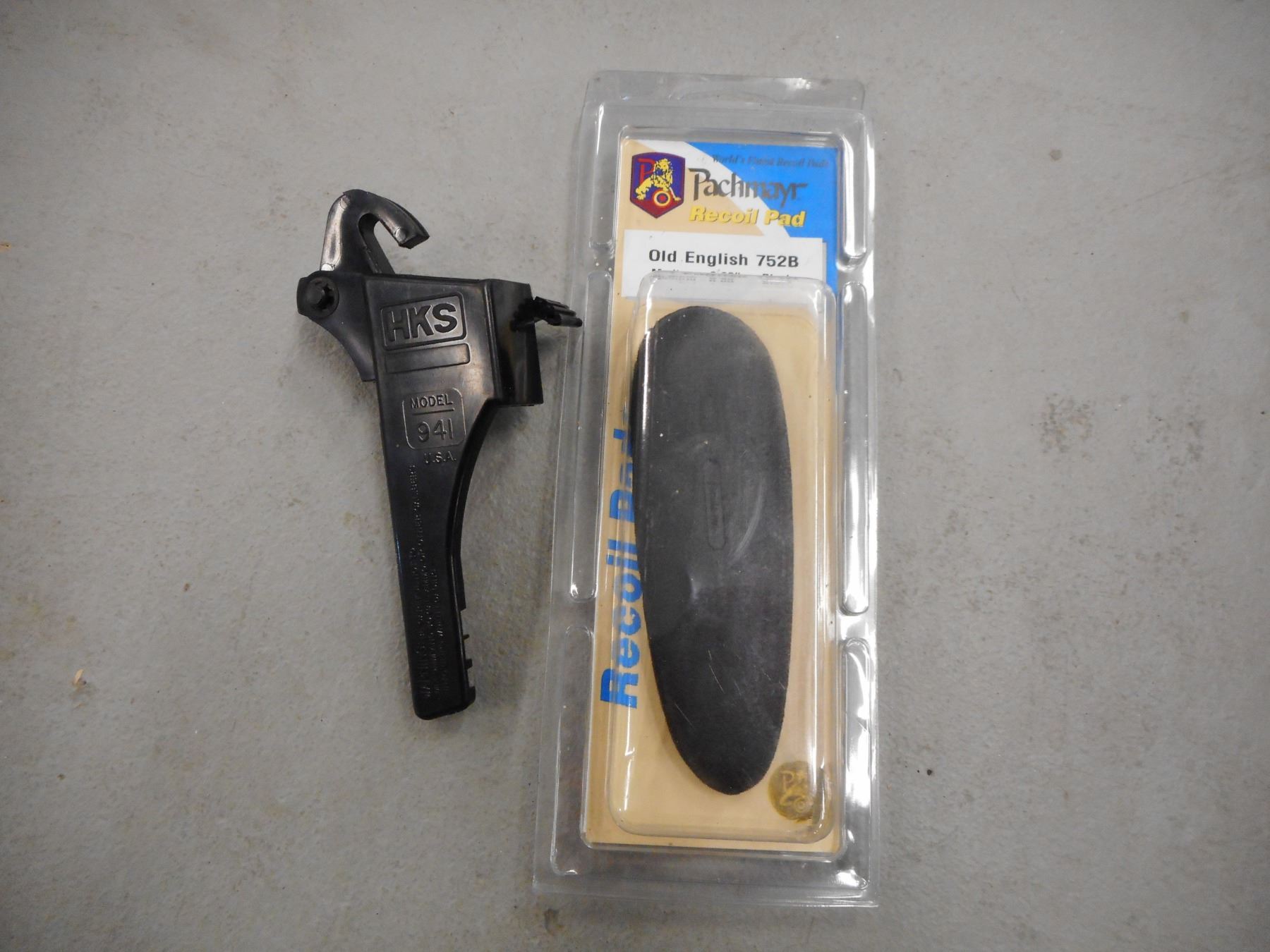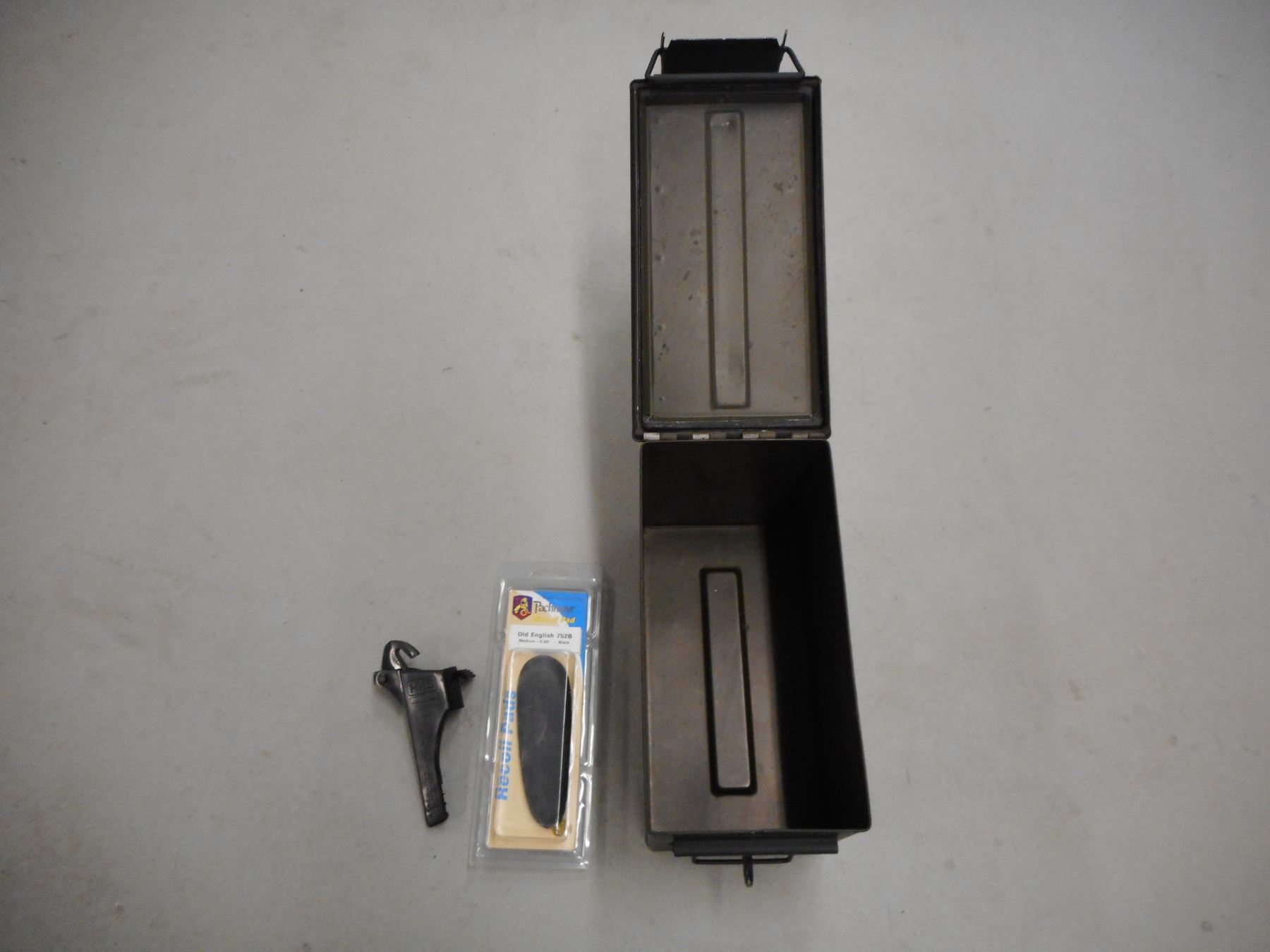 AMMO TIN & GUN ACCESSORIES , (1) BLACK AMMO TIN SIZE 11 X 5.5 X 7", WITH LOCK & KEY (1) HKS LOADER, (1) PACHMAYR RECOIL PAD FOR OLD ENGLISH 752B MEDIUM, IN ORIGINAL PACKAGING, LOT OF 3