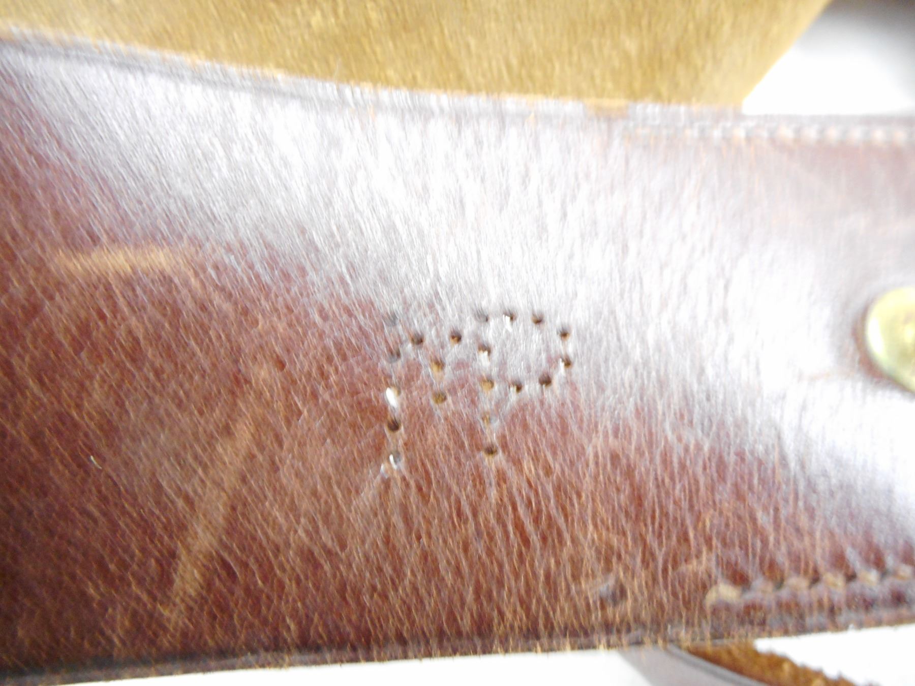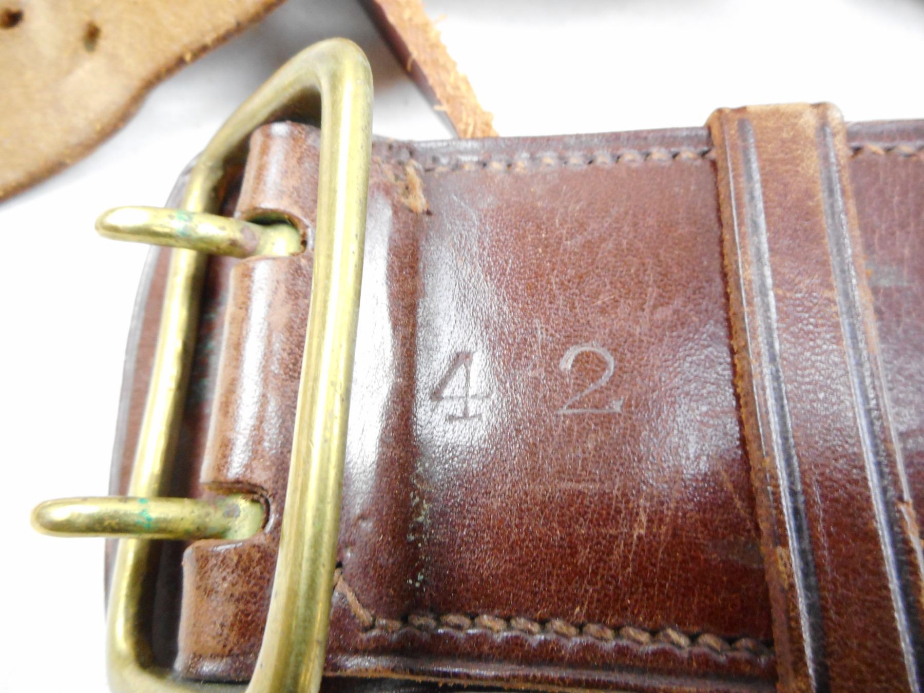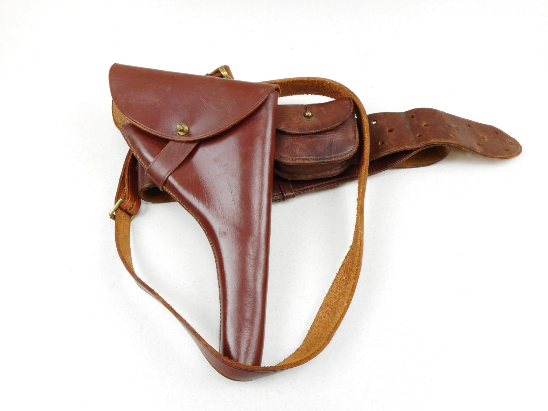 BROWN LEATHER BELT WITH HOLSTER , BELT MARKED 42 WITH PUNCHED OUT MP, HOLSTER WITH STRAP & AMMO POUCH