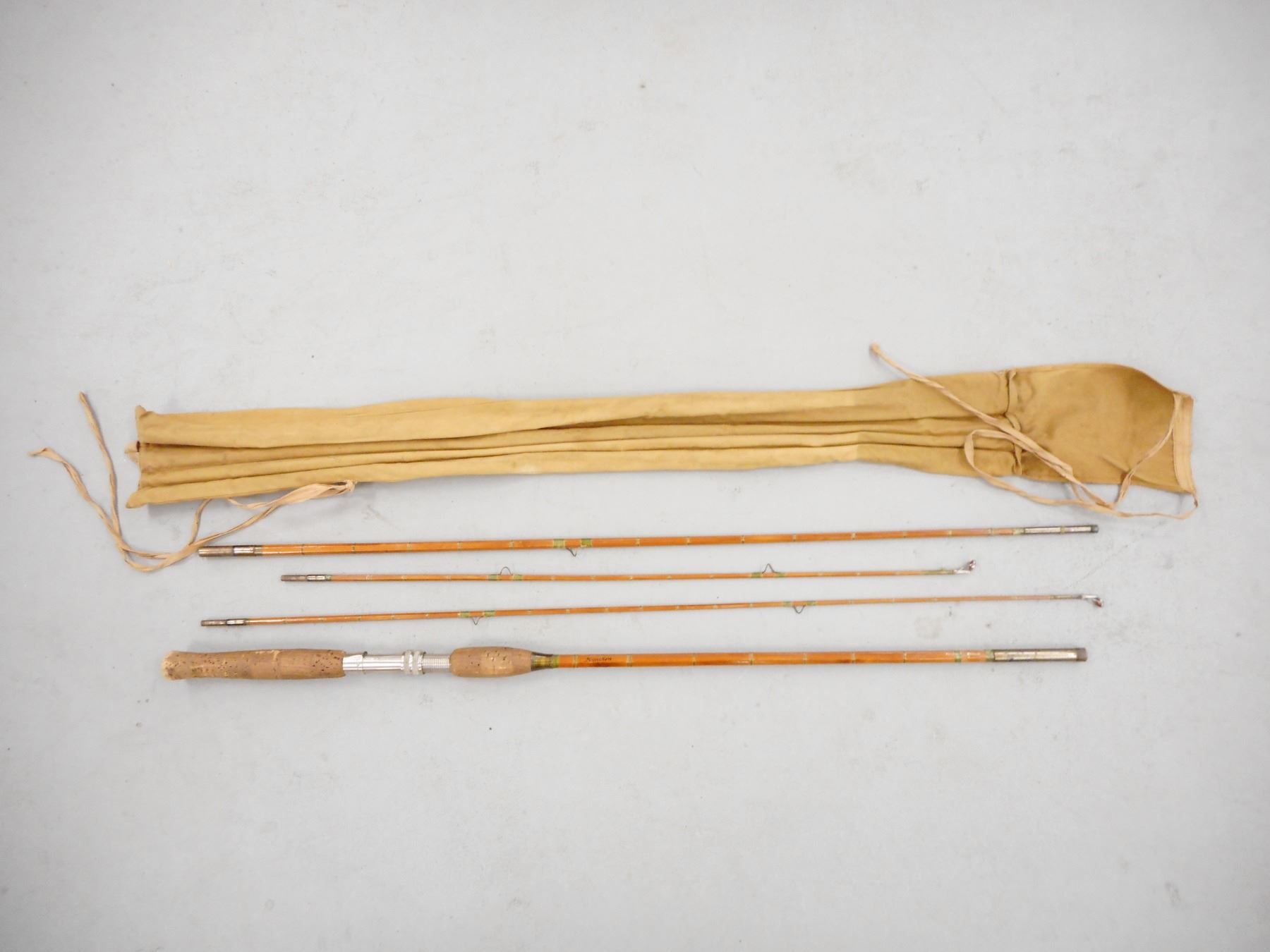 VINTAGE BAMBOO H. STORK FLY FISHING ROD , ROD MARKED DIAMANT H. STORK, MUNCHEN, 4 PIECE ROD, LENGTHS INCLUDE 35", 35", 34.5", 27". CORK GRIP, (1) GUIDE IS UNATTACHED