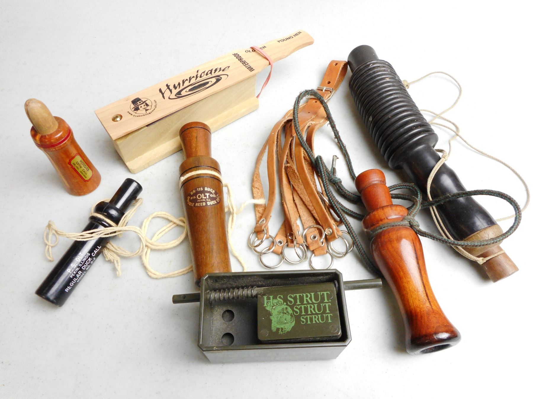 ASSORTED ANIMAL CALLS , (1) "SCOTCH CALL" DUCK NO. 1401, (1) HOOSIER CROW CALL, (1) GOOSE CALL, (1) QUAKERBOY HURRICANE, (1) H.S. STRUT YELPER, (2) OLT DUCK CALLS, (1) LEATHER BIRD CARRIER