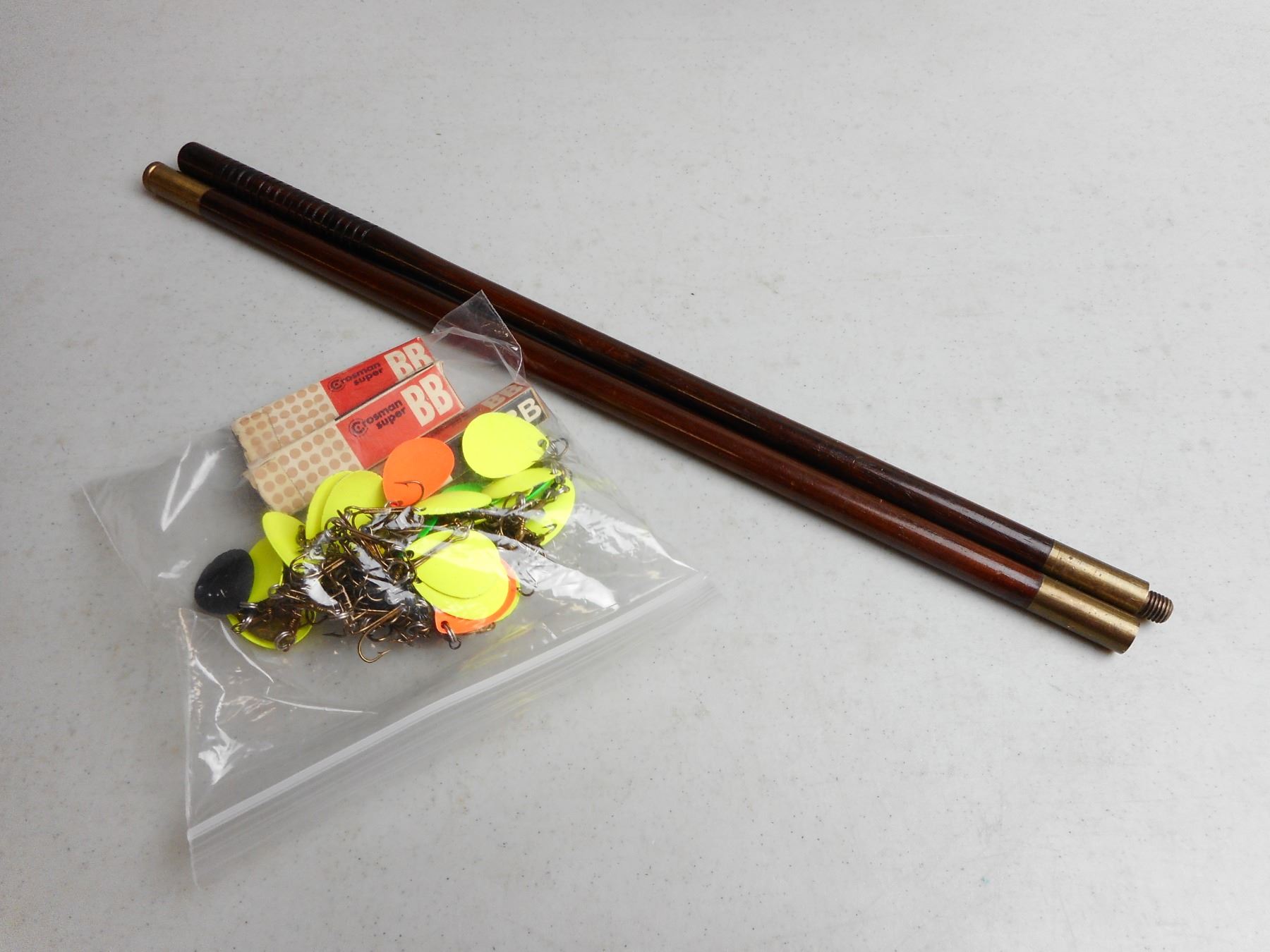 ASSORTED VINTAGE BBS, CLEANING ROD & FISHING TREBLE HOOKS , APPROX. 600 SUPER BBS, (1) WOODEN CLEANING ROD, ASSORTED TREBLE HOOKS & FLASHERS