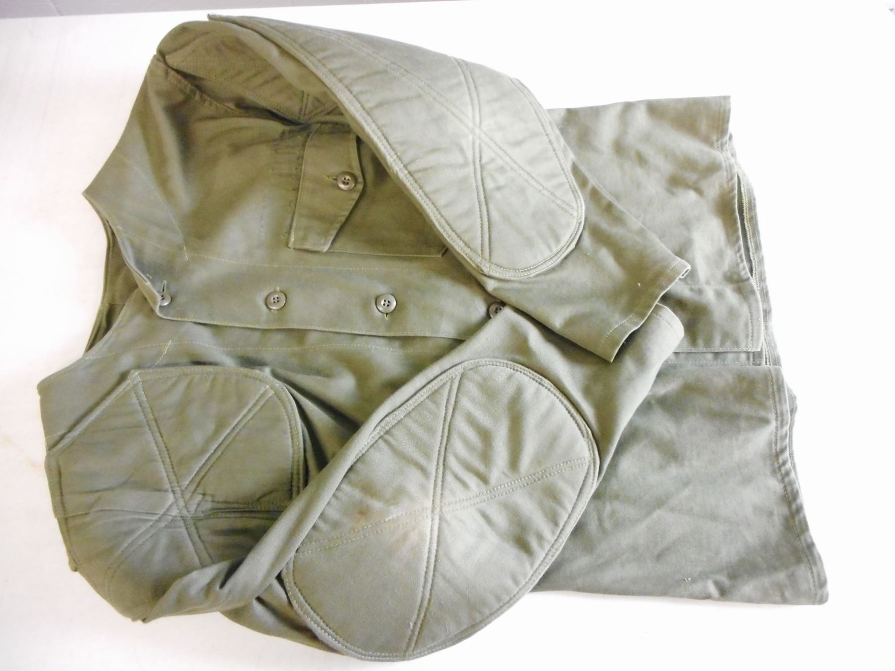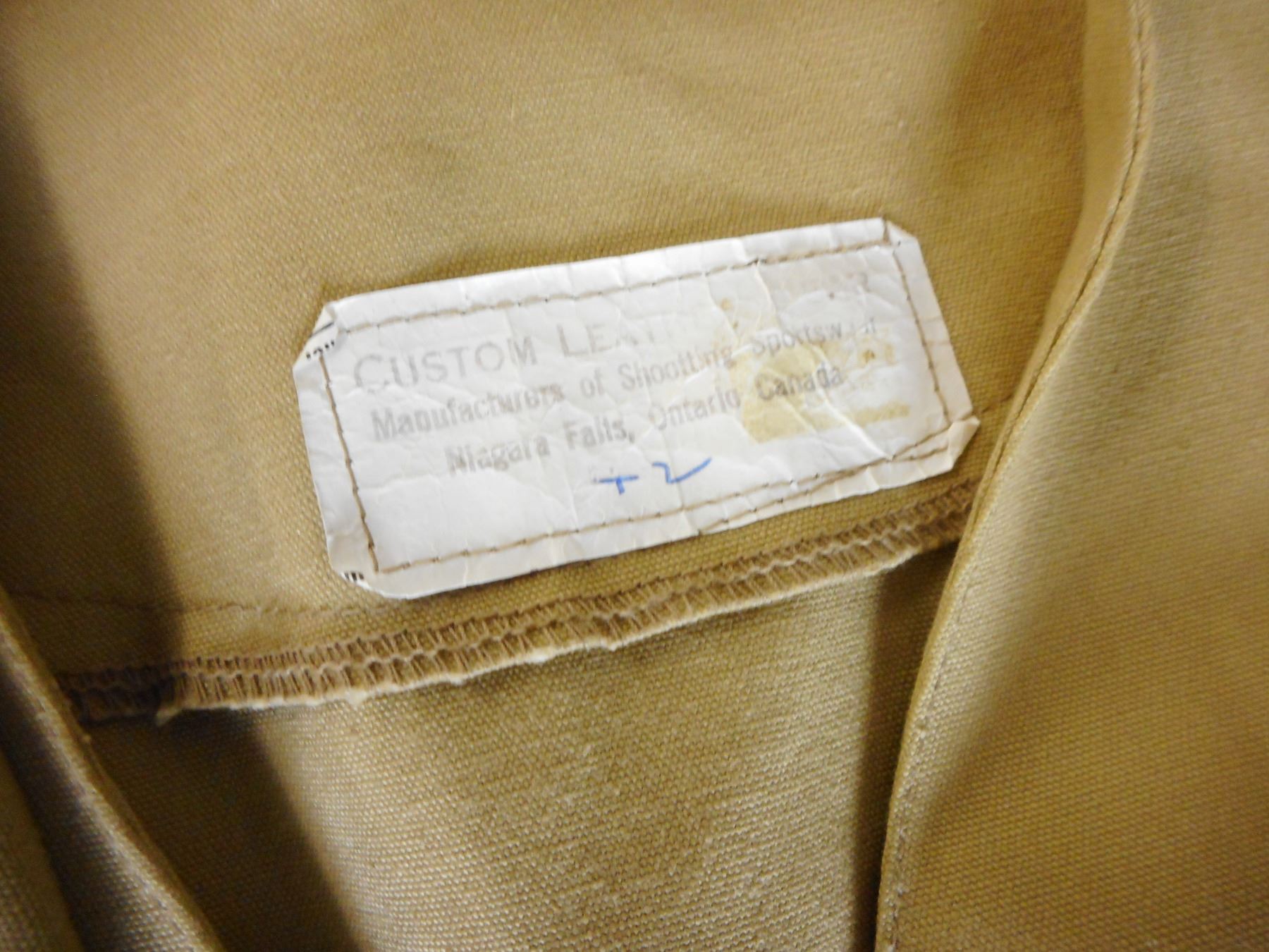 SHOOTING JACKETS , (1) CUSTOM LEATHER WEAR MANUFACTURERS OF SHOOTING SPORTS NIAGARA FALLS, WITH REINFORCED LEATHER & RUBBER PADS, (1) GREEN SIZE M SHOOTING JACKET WITH REINFORCED PADDING AND STICHED ARMS/ ELBOWS & SHOULDER, LOT OF 2