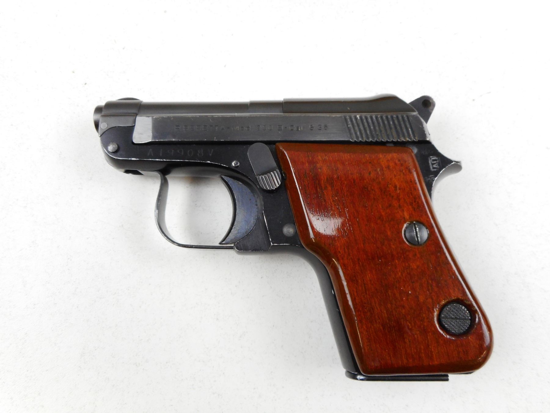 BERETTA , MODEL: 950B , CALIBER: 6.35MM , COMES WITH MAGAZINE, NOTCH & BLADE SIGHTS, PLAIN WOOD GRIPS, BRIGHT BLUE FINISH, AS NEW WITH MINOR HANDLING MARKS , SERIAL # A19908V , ACTION: SEMI AUTOMATIC PISTOL , BARREL LENGTH: 60MM , CONDITION: 9/10 , STOCK # 2195 , CLASS: CANADIAN PROHIBITED CLASS