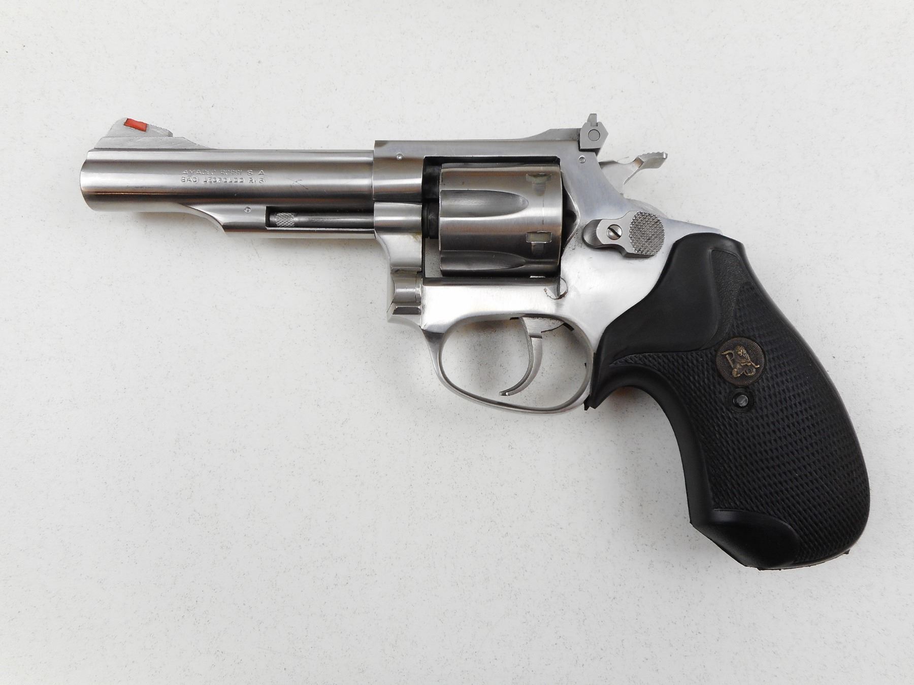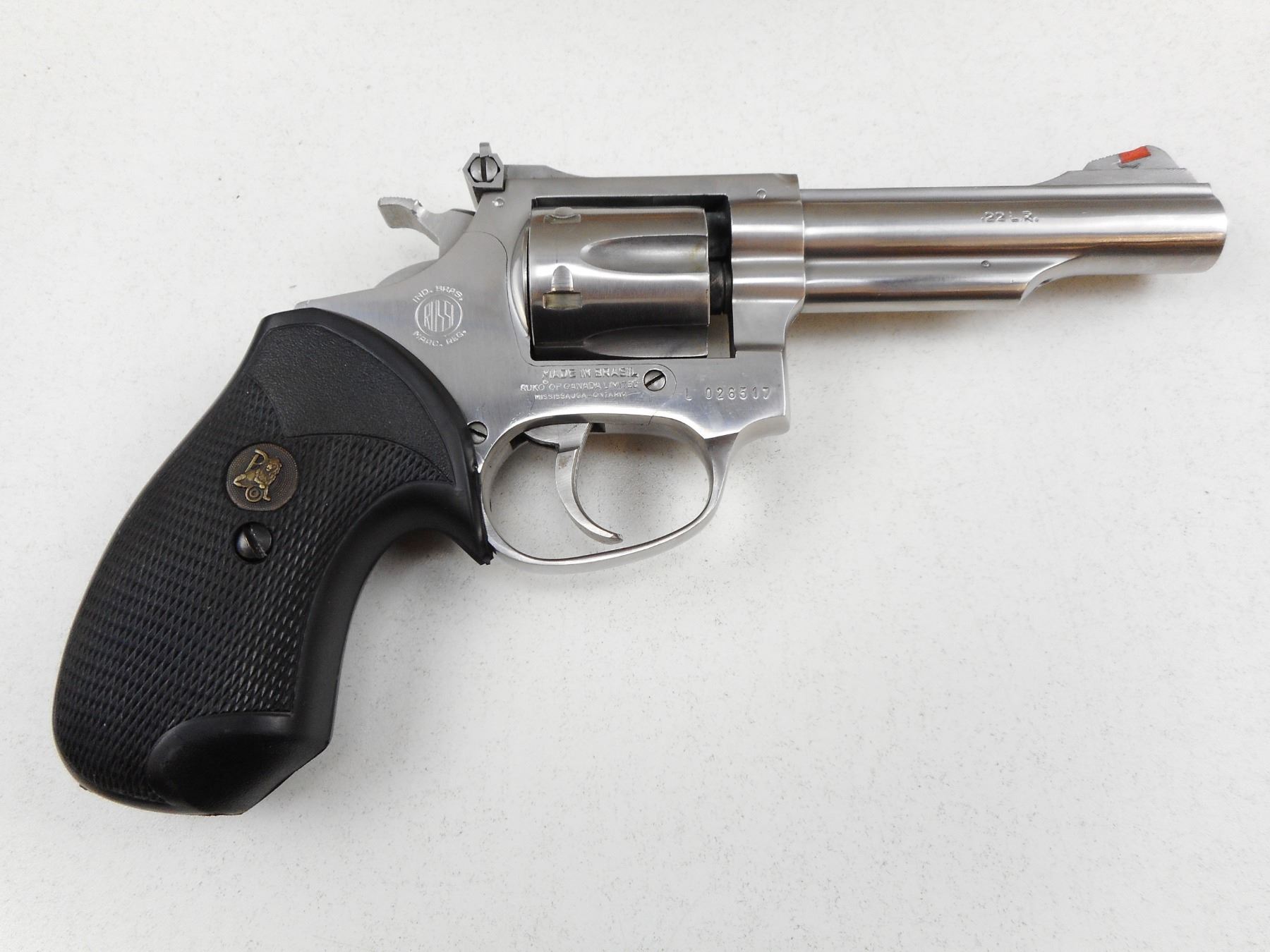 ROSSI , MODEL: 511 , CALIBER: 22LR , ADJUSTABLE TARGET SIGHTS, BRIGHT STAINLESS FINISH, PACHMAYR PRESENTATION GRIP, DOUBLE ACTION, INDEXES AND LOCKS UP TIGHT, EXCELLENT BORE , SERIAL # L026517 , ACTION: REVOLVER , BARREL LENGTH: 102MM , CONDITION: 9/10 , STOCK # 2196 , CLASS: CANADIAN PROHIBITED CLASS