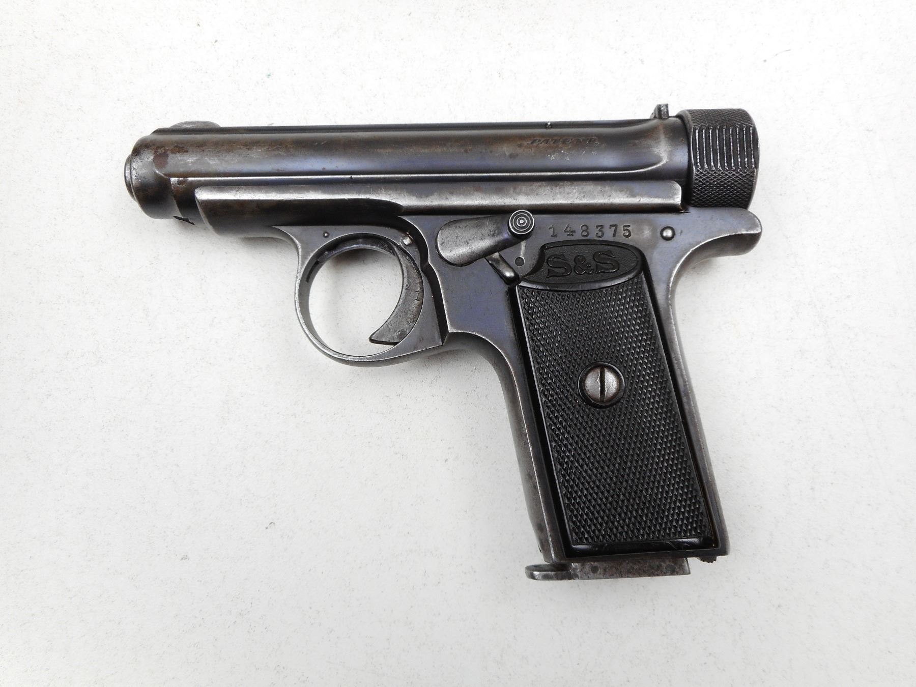 SAUER , MODEL: 1913 , CALIBER: 7.65MM , COMES WITH MAGAZINE(MAY NOT BE CORRECT) GREY PATINA, NOTCH & BLADE SIGHT, CHECKERED PLASTIC GRIPS, APPROPRIATE WEAR, , SERIAL # 148375 , ACTION: SEMI-AUTOMATIC , BARREL LENGTH: 78MM , CONDITION: 5/10 , STOCK # 2209 , CLASS: CANADIAN PROHIBITED CLASS