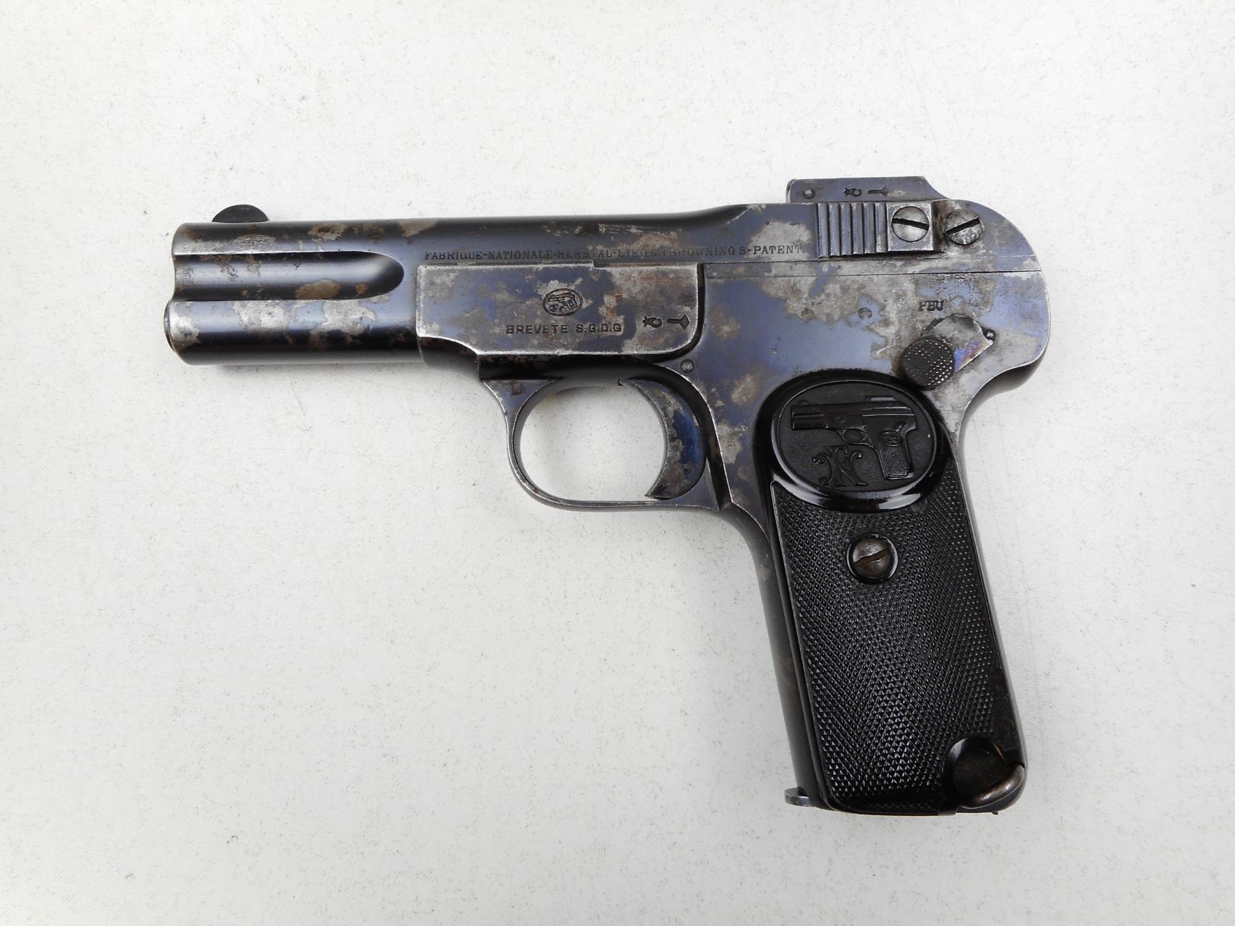 FN BROWNING , MODEL: 1900 , CALIBER: 7.65MM , COMES WITH MAGAZINE, NOTCH & BLADE SIGHTS, HARD RUBBER CHECKERED GRIPS, FINISH IS MOTLED ON LEFT SIDE BLUE TO GREY WITH SOME PITTING OVERALL, GOOD BORE, COCKING INDICATOR , SERIAL # 16305 , ACTION: SEMI-AUTOMATIC , BARREL LENGTH: 102MM , CONDITION: 6/10 , STOCK # 2213 , CLASS: CANADIAN PROHIBITED CLASS