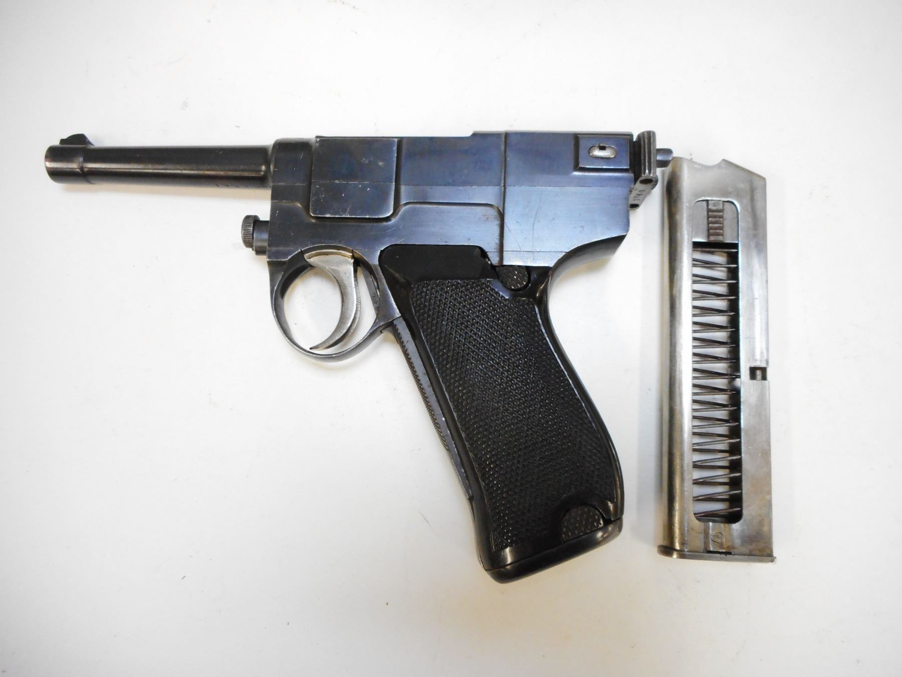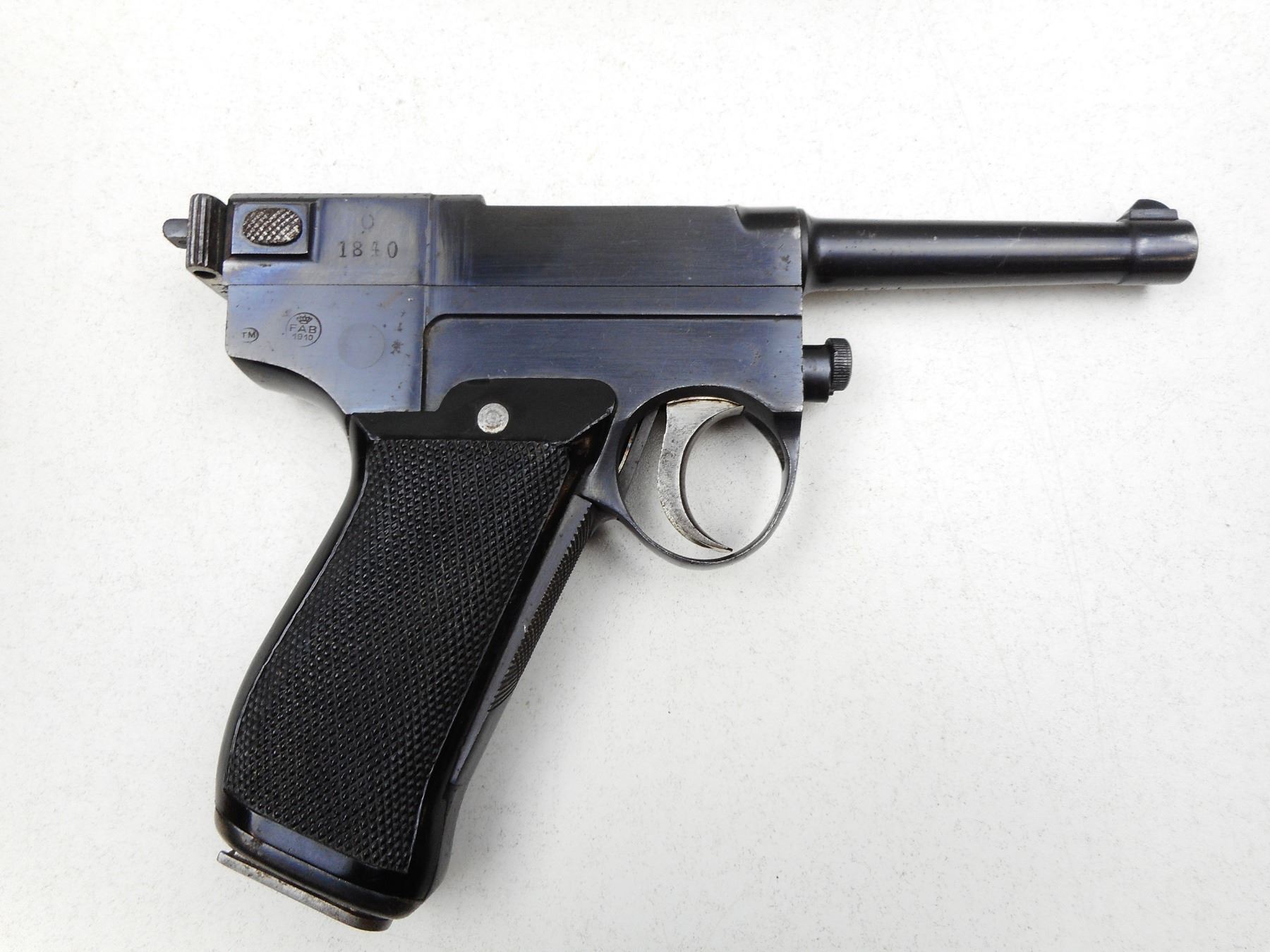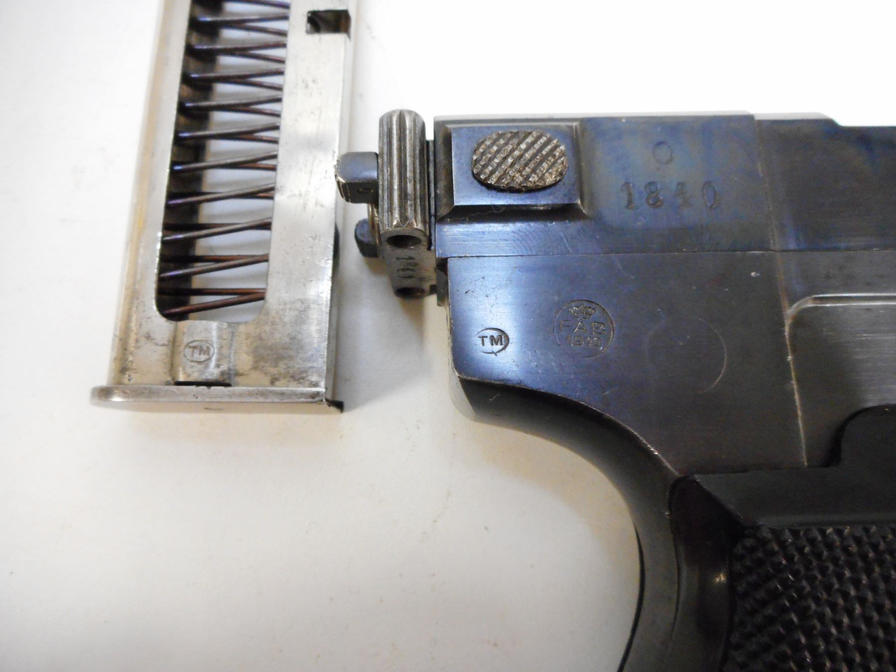 GLISENTI , MODEL: 1910 ITALIAN SERVICE , CALIBER: 9MM GLISENTI , COMES WITH MAGAZINE, FRONT GRIP SAFETY, NOTCH & BLADE SIGHT, CHECKERED PLASTIC GRIPS, BLUE FINISH WITH LIGHT WEAR (MAY BE REBLUED) LANYARD LOOP, GOOD BORE WITH MINOR PITTING , SERIAL # 1840 , ACTION: SEMI-AUTOMATIC , BARREL LENGTH: 95MM , CONDITION: 7/10 , STOCK # 2215 , CLASS: CANADIAN PROHIBITED CLASS