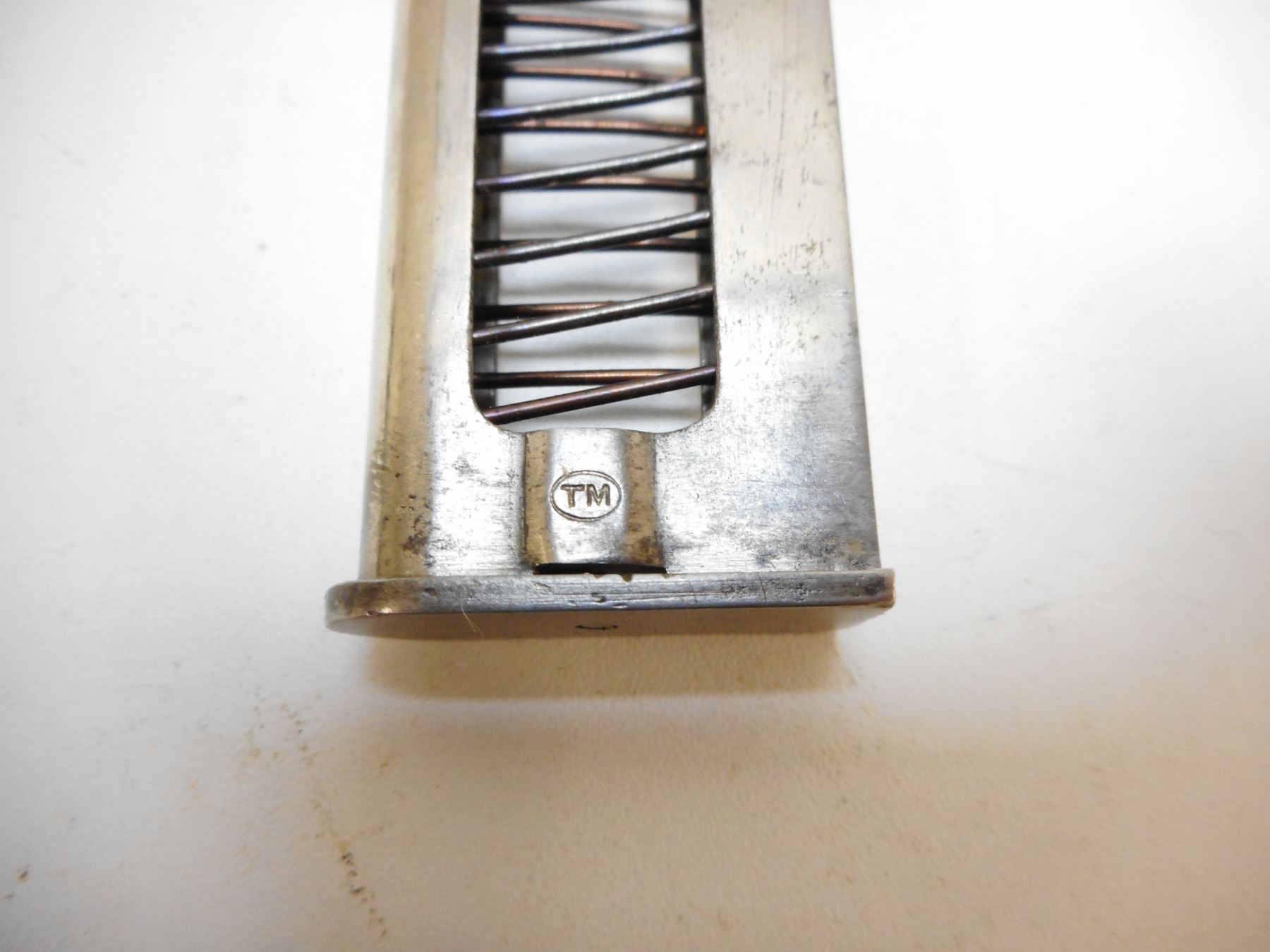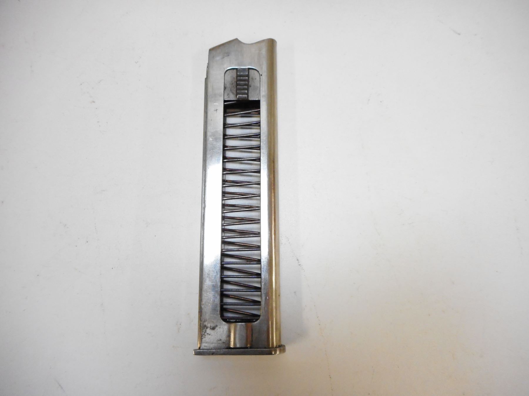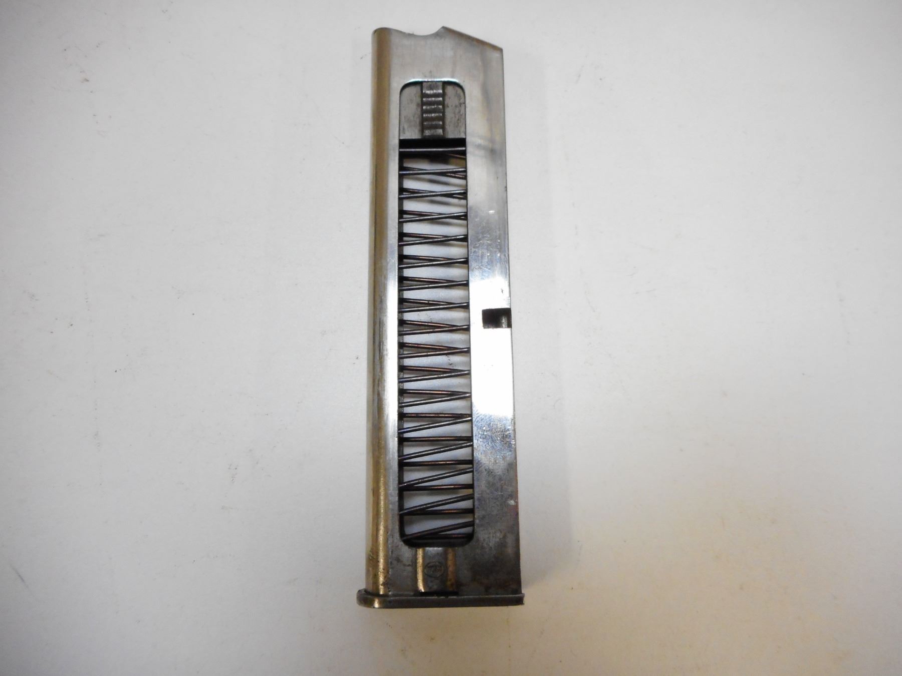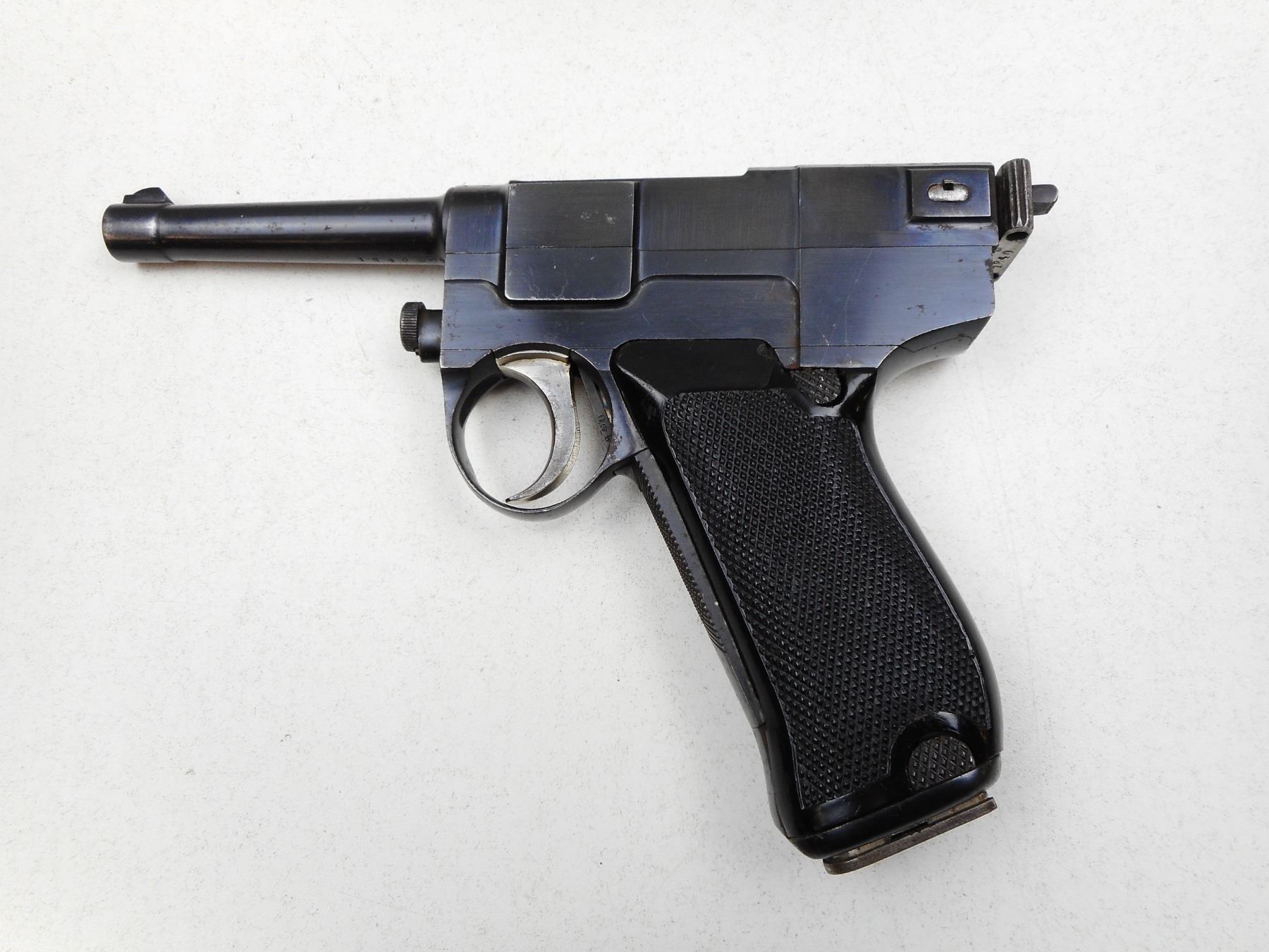 GLISENTI , MODEL: 1910 ITALIAN SERVICE , CALIBER: 9MM GLISENTI , COMES WITH MAGAZINE, FRONT GRIP SAFETY, NOTCH & BLADE SIGHT, CHECKERED PLASTIC GRIPS, BLUE FINISH WITH LIGHT WEAR (MAY BE REBLUED) LANYARD LOOP, GOOD BORE WITH MINOR PITTING , SERIAL # 1840 , ACTION: SEMI-AUTOMATIC , BARREL LENGTH: 95MM , CONDITION: 7/10 , STOCK # 2215 , CLASS: CANADIAN PROHIBITED CLASS