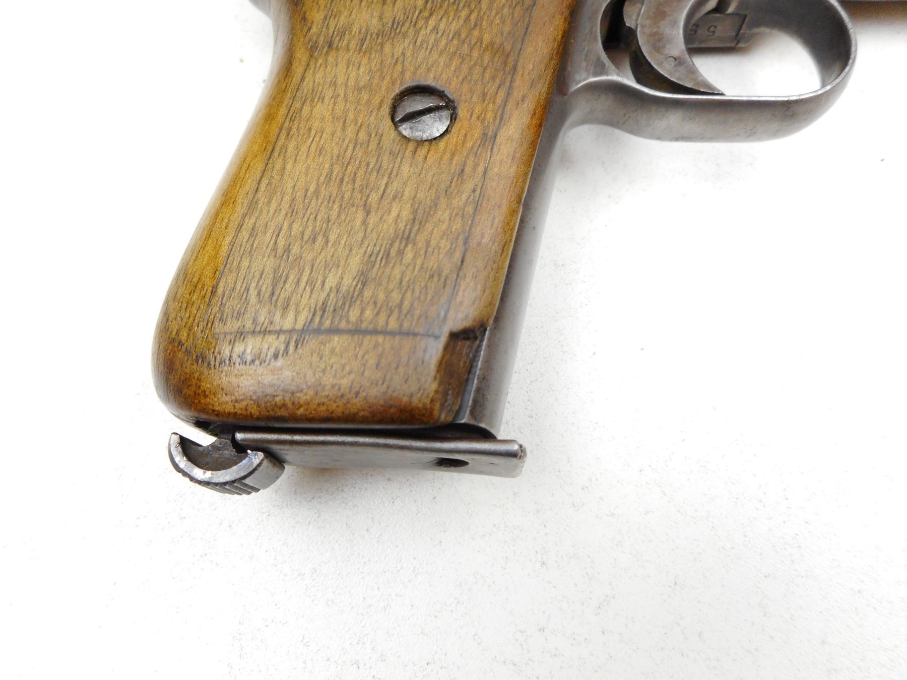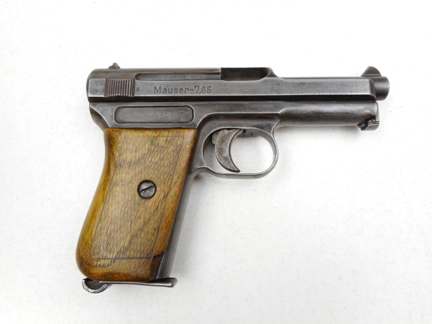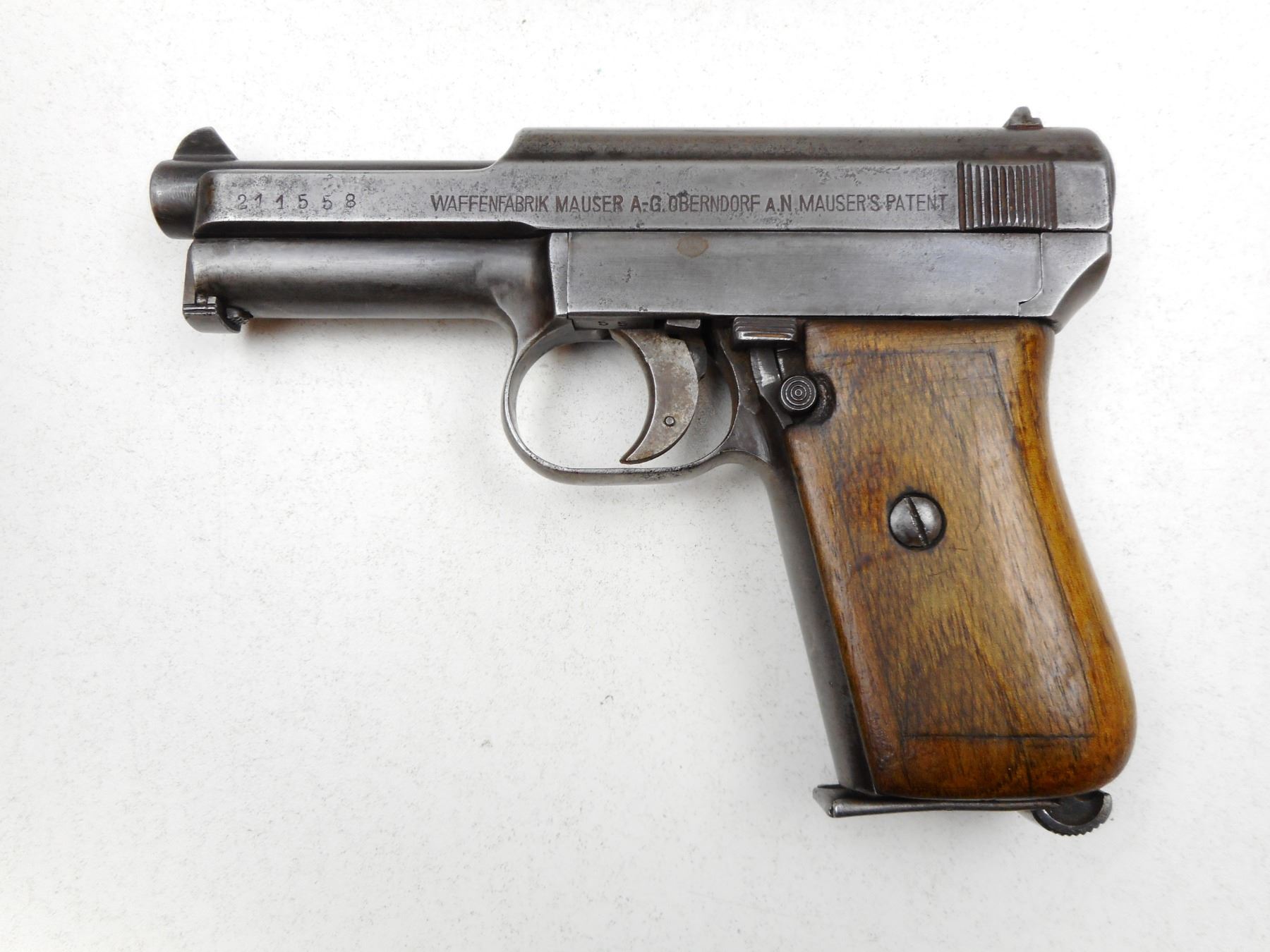 MAUSER , MODEL: 1910 , CALIBER: 7.65MM , COMES WITH MAGAZINE, NOTCH & BLADE SIGHTS, CHECKERED WOOD GRIPS, GREY PATINA, AVERAGE BORE WITH LIGHT PITTING , SERIAL # 211558 , ACTION: SEMI-AUTOMATIC , BARREL LENGTH: 87MM , CONDITION: 4/10 , STOCK # 2216 , CLASS: CANADIAN PROHIBITED CLASS