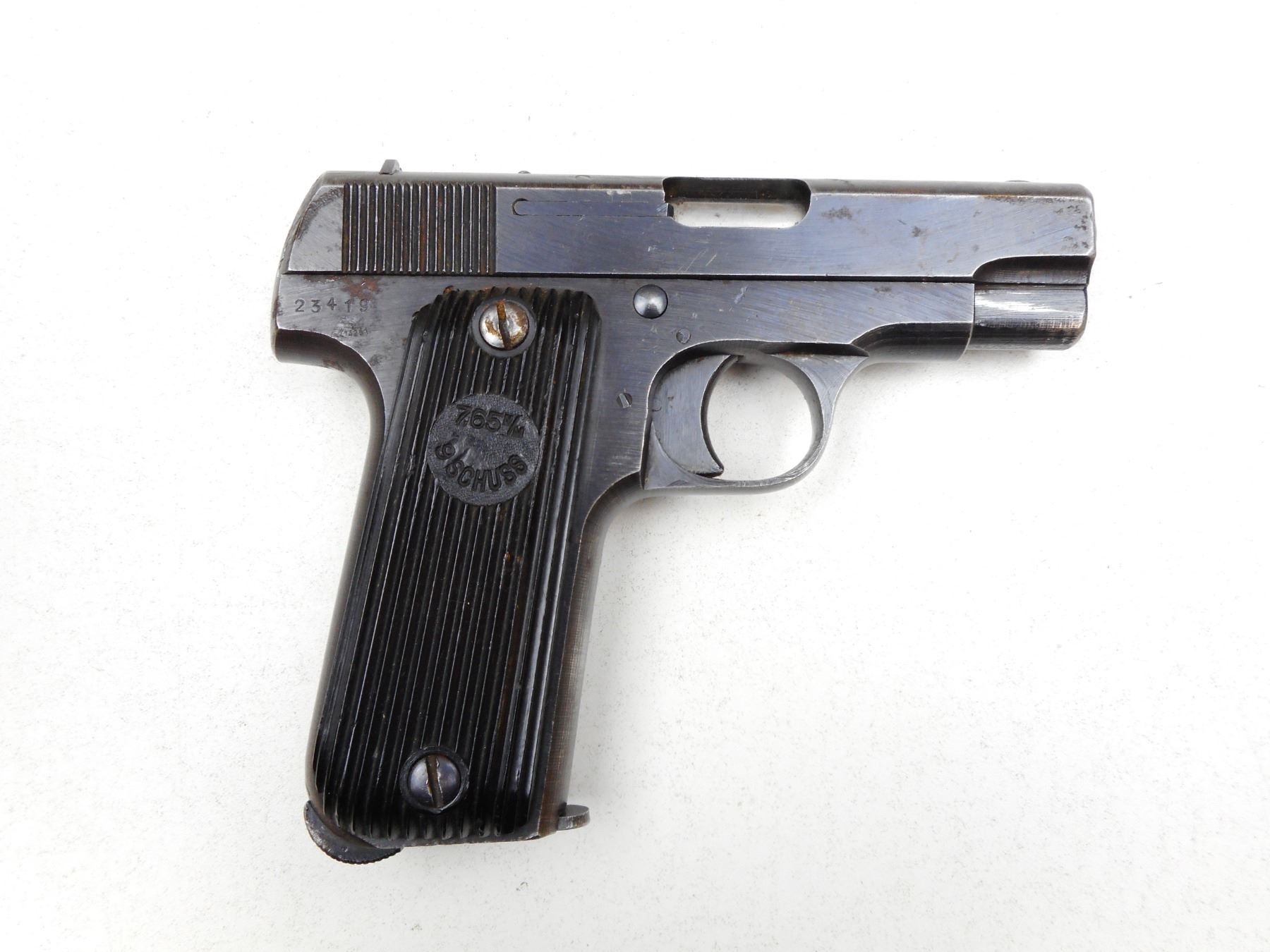 UNIQUE , MODEL: MODEL 17 , CALIBER: 7.65MM , COMES WITH MAGAZINE, NOTCH & BLADE SIGHTS, TEXTURED HARD RUBBER GRIPS, BLUE FINISH WITH MINOR PITTING, GOOD BORE, , SERIAL # 23419 , ACTION: SEMI-AUTOMATIC , BARREL LENGTH: 81MM , CONDITION: 7/10 , STOCK # 2218 , CLASS: CANADIAN PROHIBITED CLASS