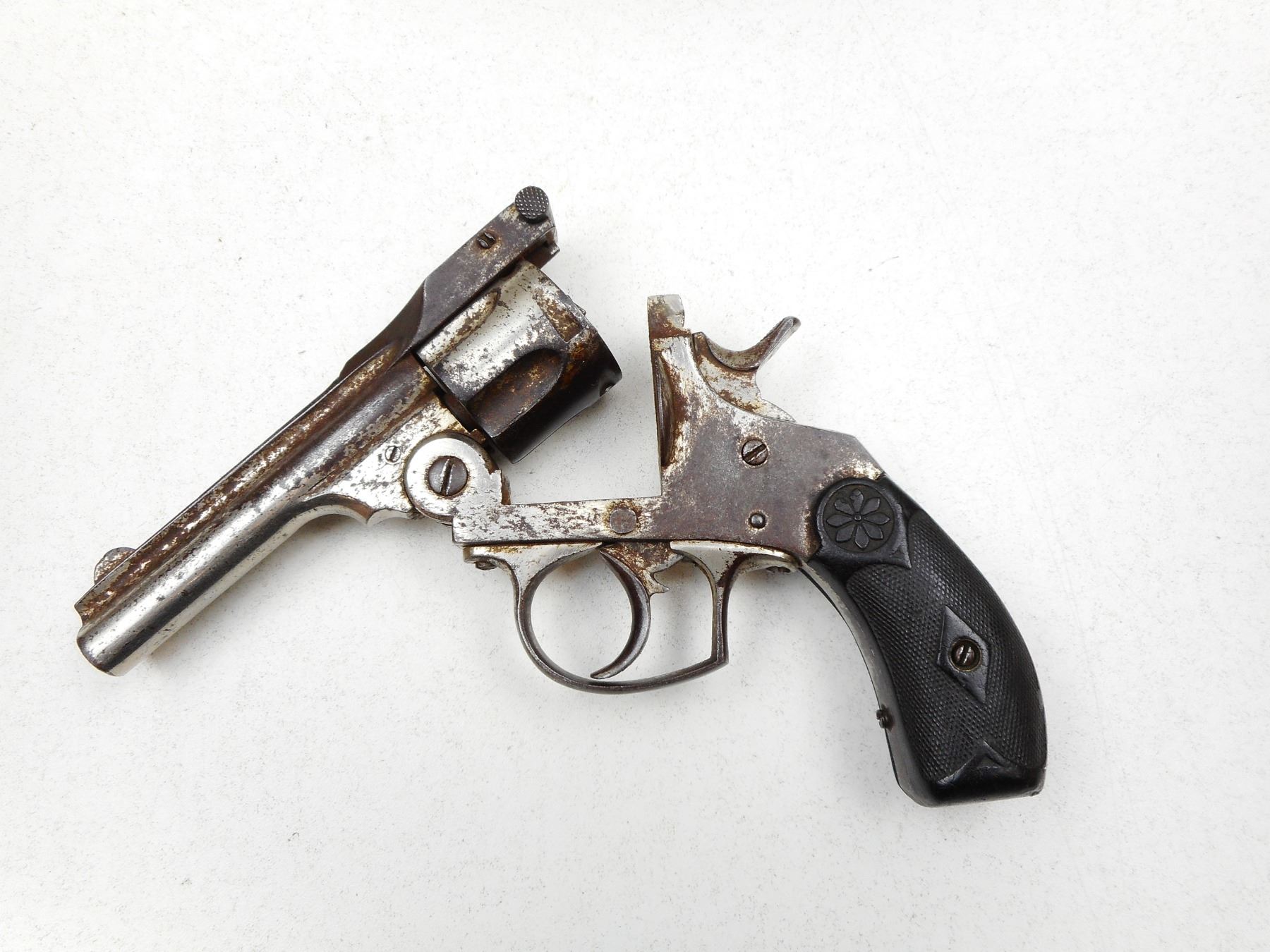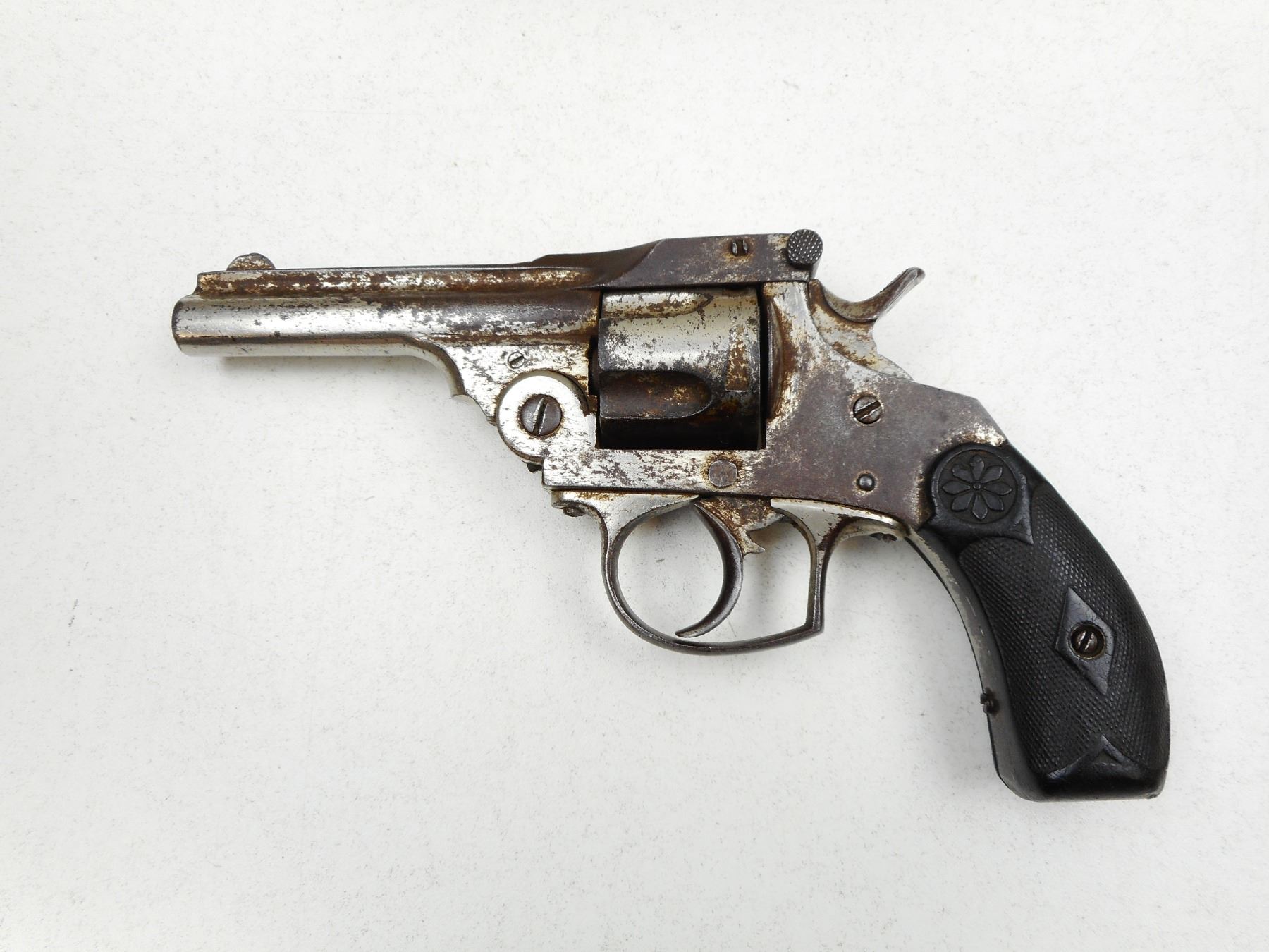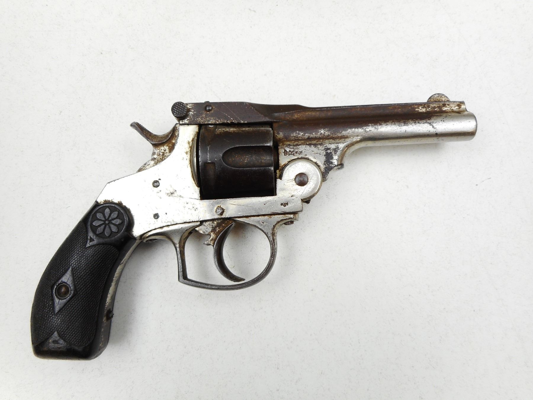 UNKNOWN BELGIAN , MODEL: TOP BREAK , CALIBER: 32 S&W , NOTCH & BLADE SIGHT, NICKEL FINISH, DOES NOT INDEX HARD RUBBER CHECKERED GRIPS , SERIAL # 26707556 , ACTION: REVOLVER , BARREL LENGTH: 80MM , CONDITION: 2/10 , STOCK # 2219 , CLASS: CANADIAN PROHIBITED CLASS