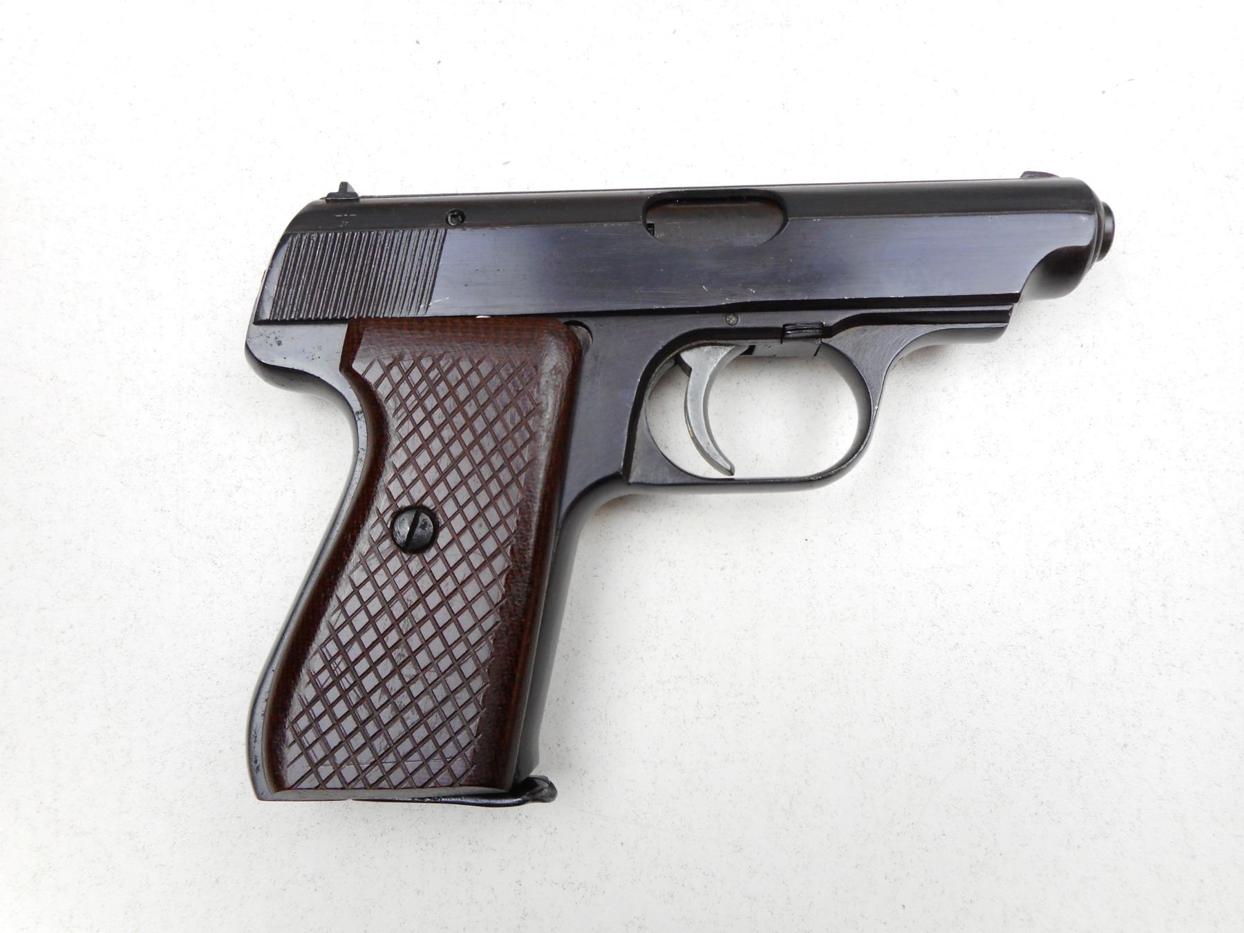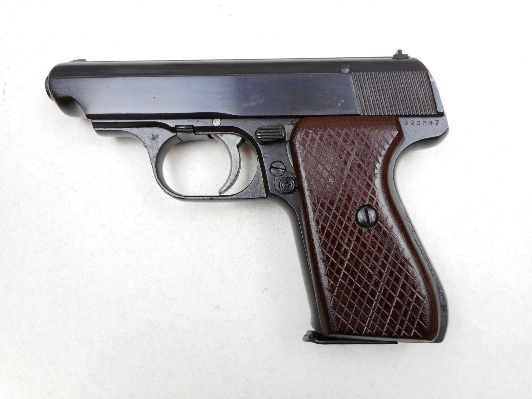 SAUER & SOHN , MODEL: 1938H , CALIBER: 7.65MM , COMES WITH MAGAZINE, NOTCH & BLADE SIGHTS, REPLACEMENT CHECKERED WOOD GRIPS, REBLUED FINISH GOOD BORE, , SERIAL # 490647 , ACTION: SEMI-AUTOMATIC , BARREL LENGTH: 83MM , CONDITION: 7/10 , STOCK # 2223 , CLASS: CANADIAN PROHIBITED CLASS